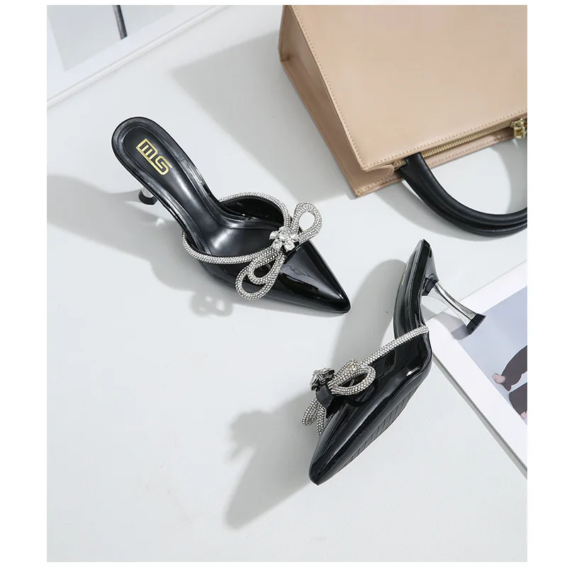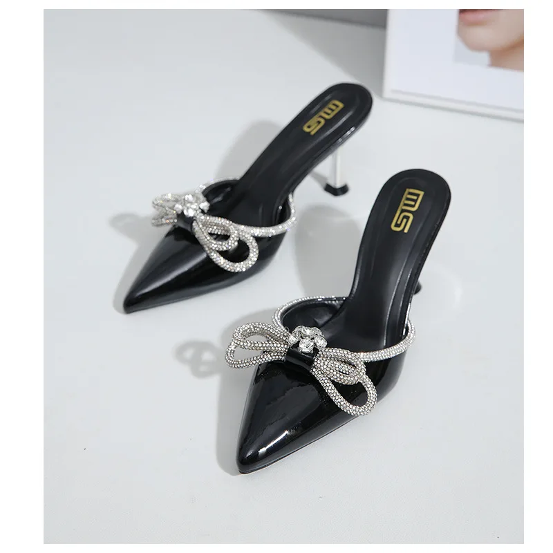 LBSFY - Shiny Bow High Heels Rhinestone Luxury Slippers Women Pointed Toe Elegant Sexy Black Pink Party Dress Shoes Summer Flip-flops