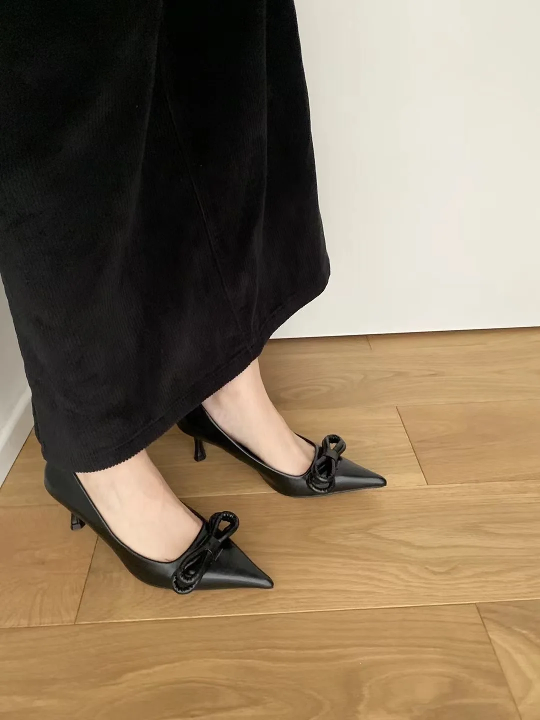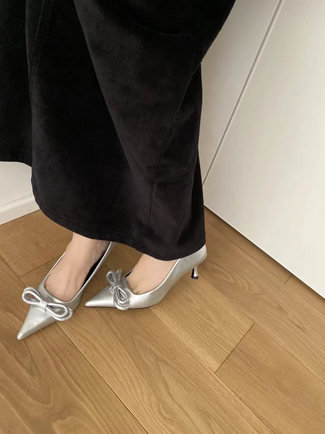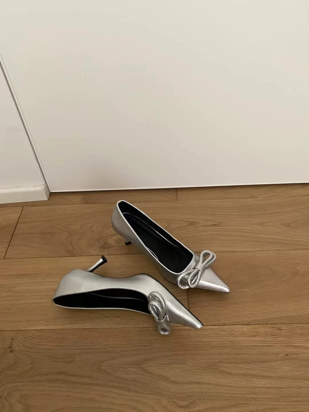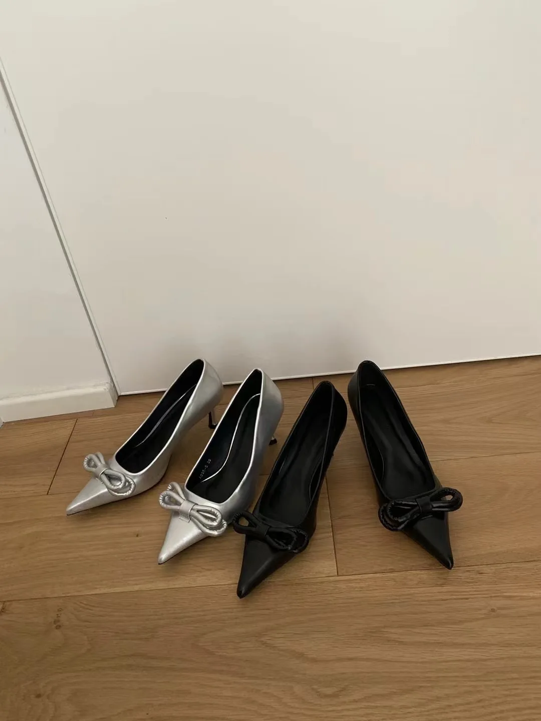 LBSFY - Silver/Black Fashion Women Pumps 2024 News Pointed Toe Bow Design Shallow Slip On Thin High Heels Casual Office Party Dress Shoe