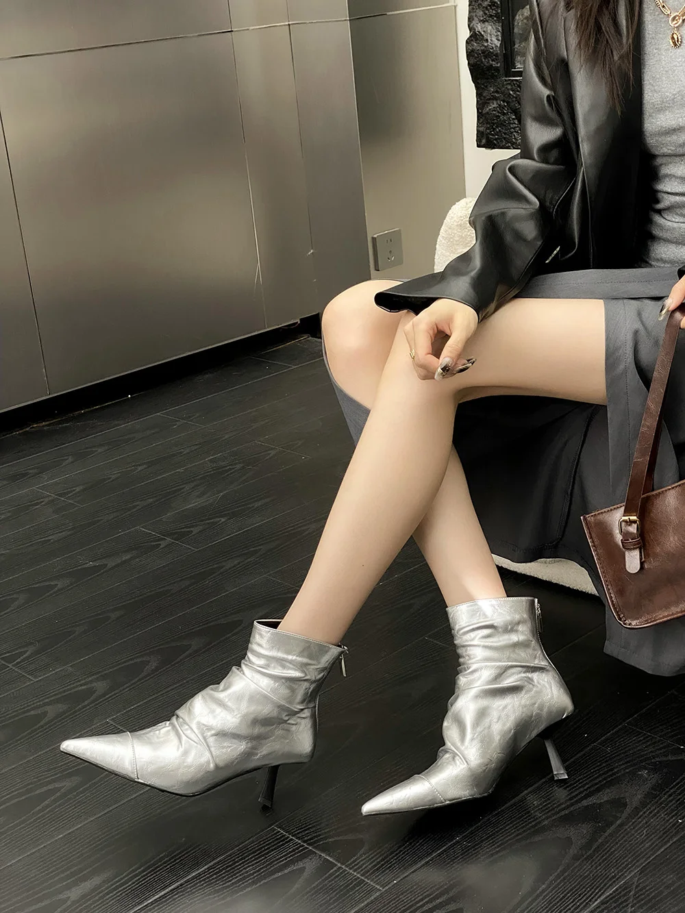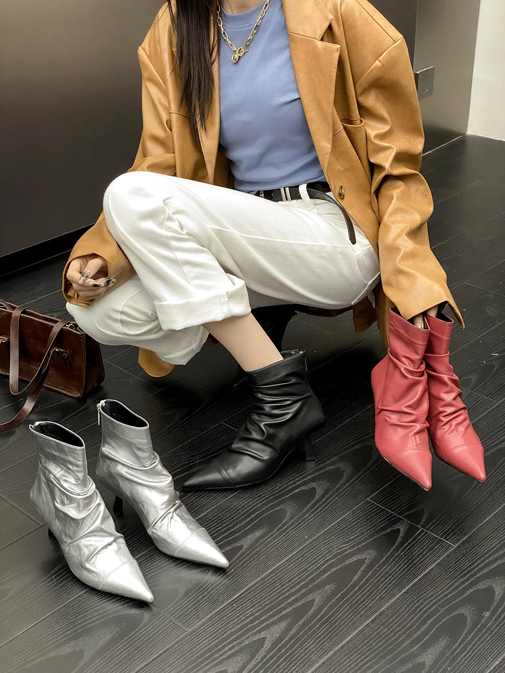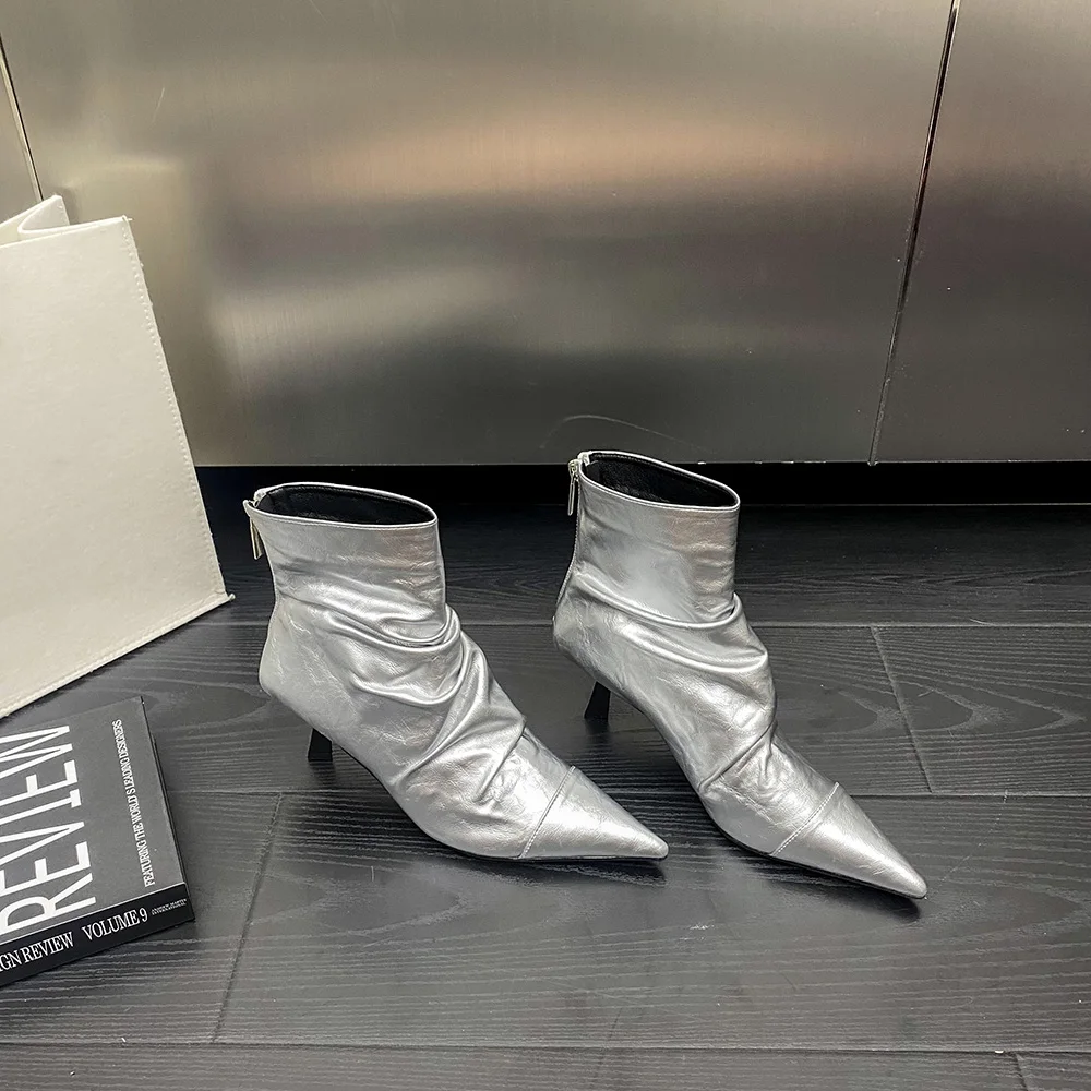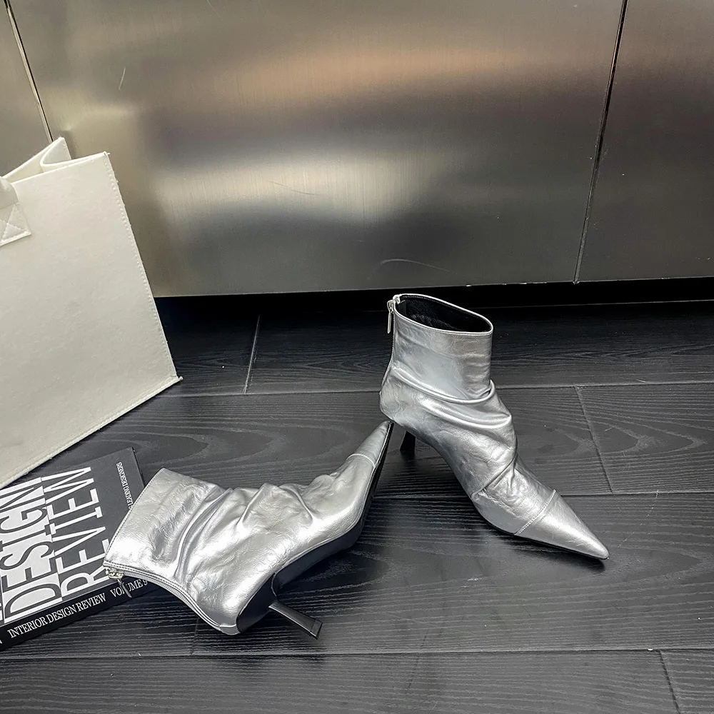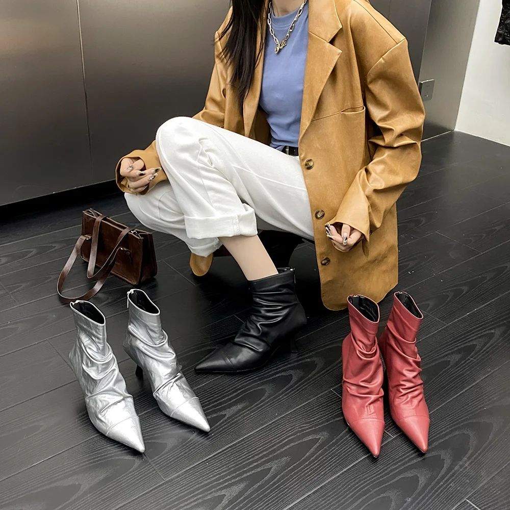 LBSFY - Silver Red Black Women Ankle Boots Pointed Toe Short Bootie Thin High Heels Back Zipper Autumn Winter Boots Woman Size 35-40