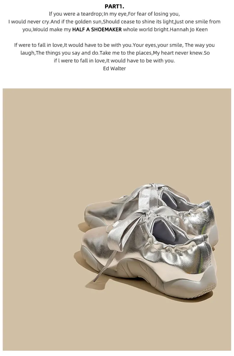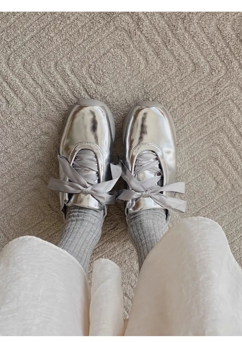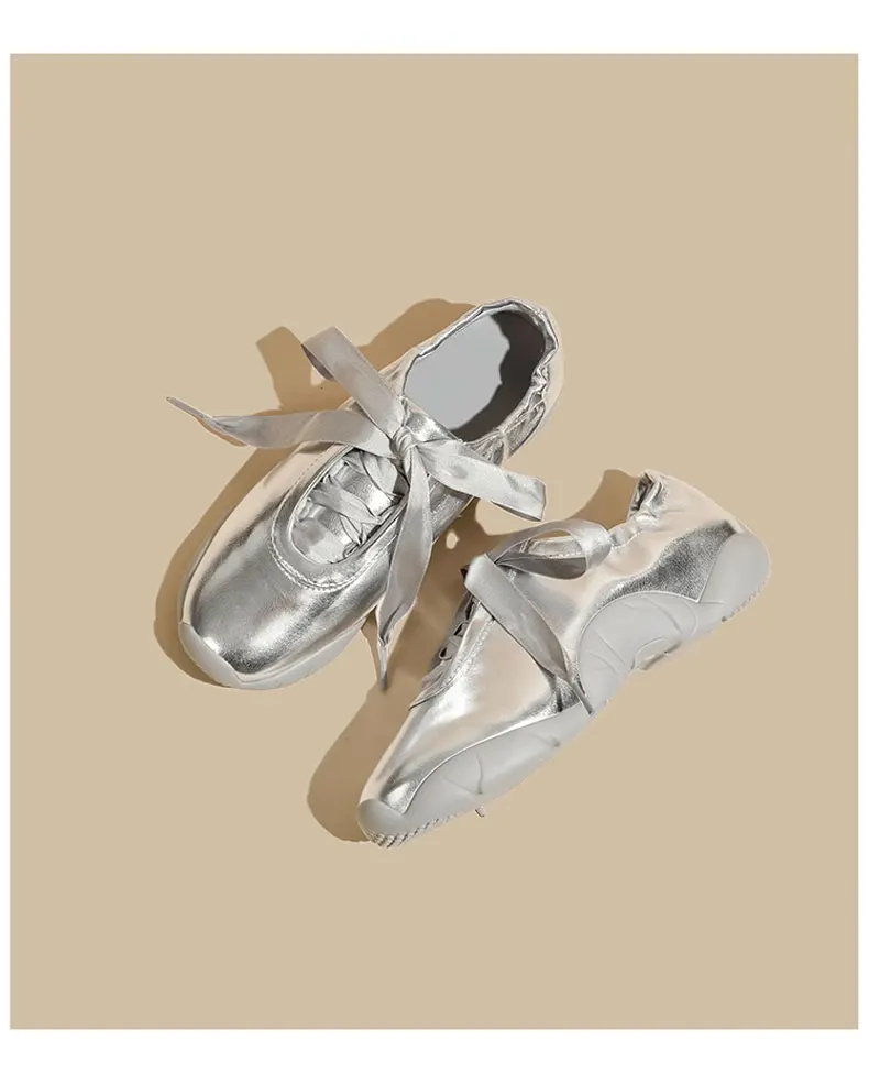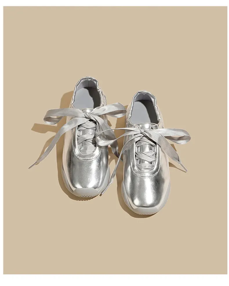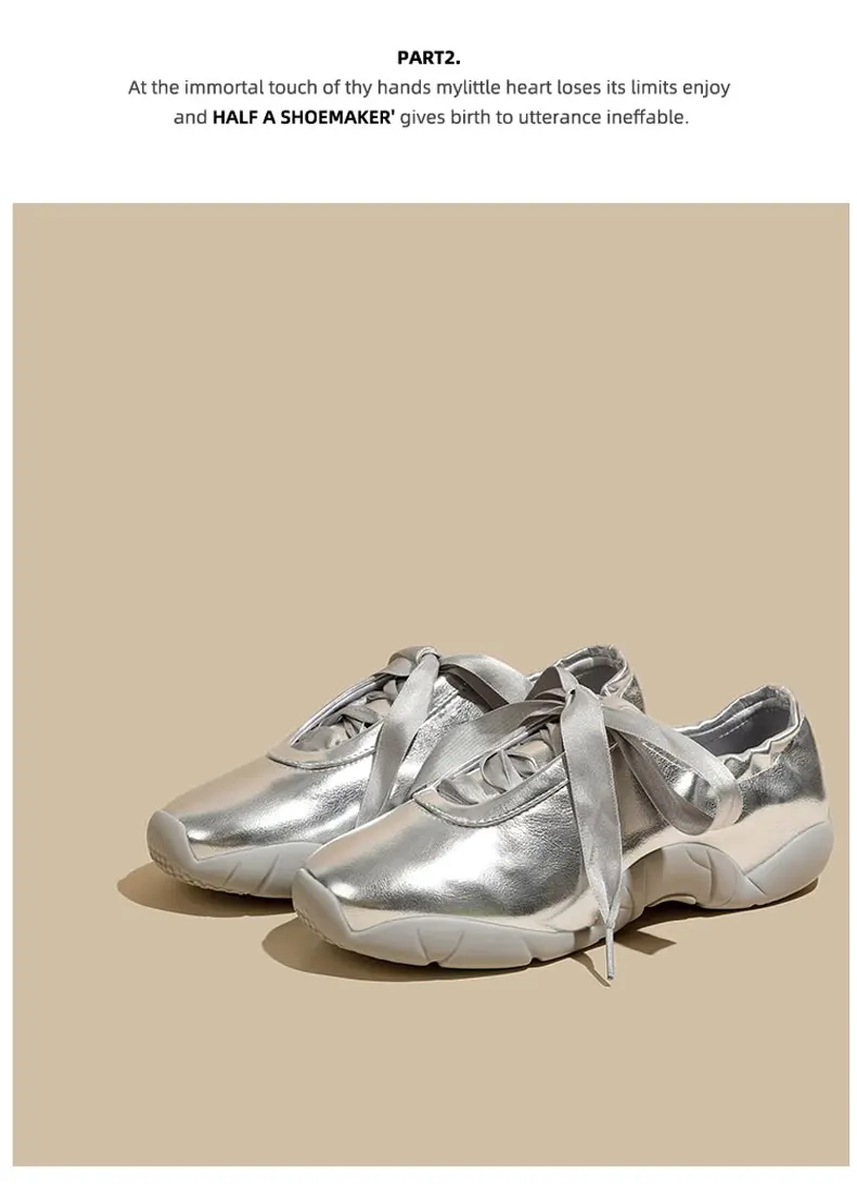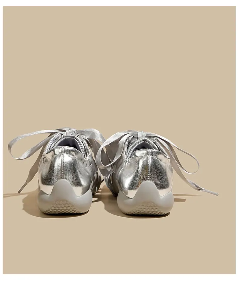 LBSFY - Silver women's ballet flats thick sole lace up genuine leather casual shoes outdoor training sneakers