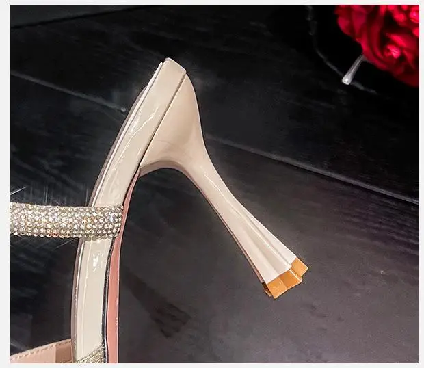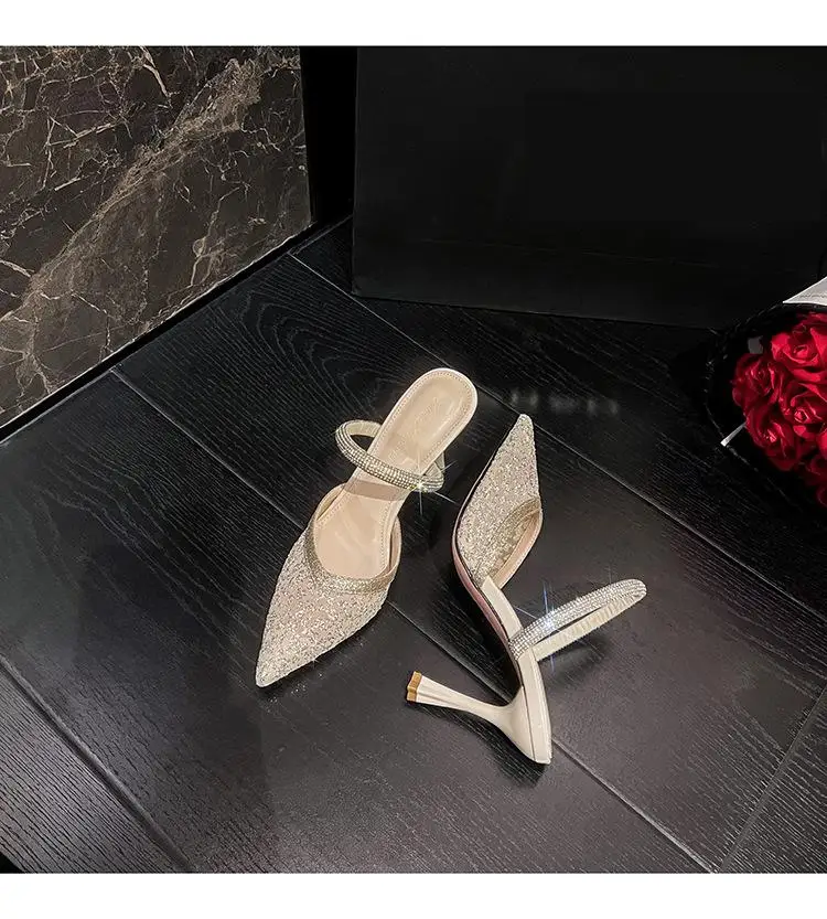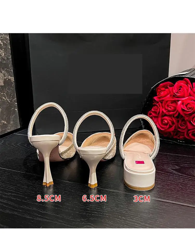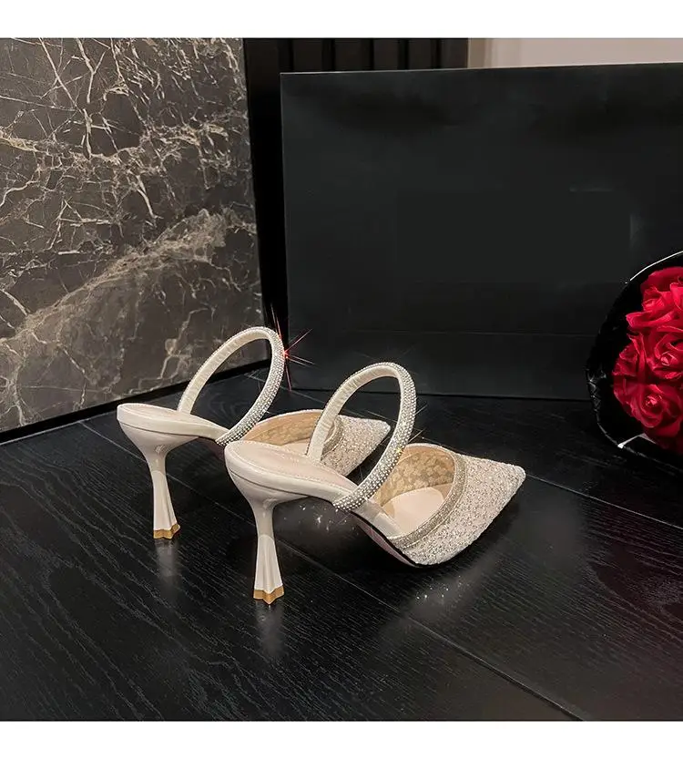 LBSFY - Size 31-43 Ladies Sandals Summer Slippers Women Outer Wear Rhinestone Lace Mesh High Heels Pointed Toe Stiletto Heel