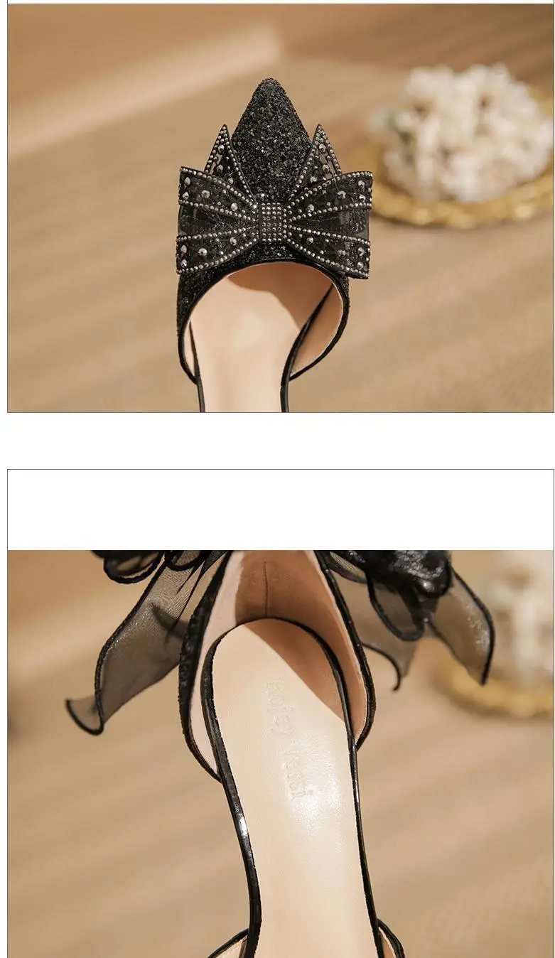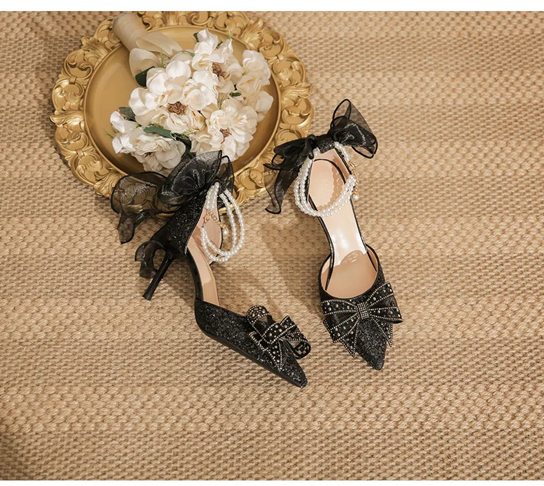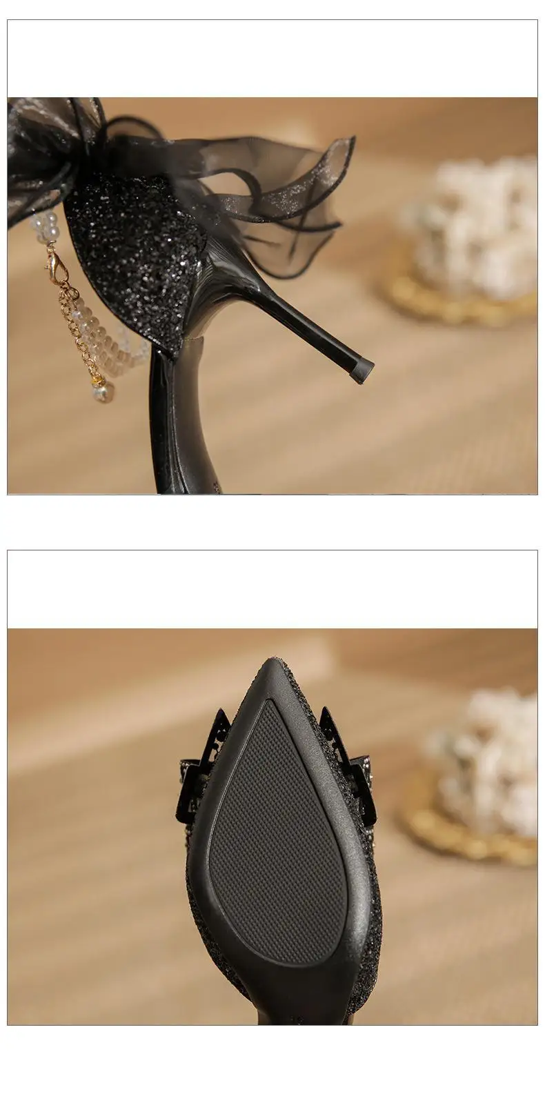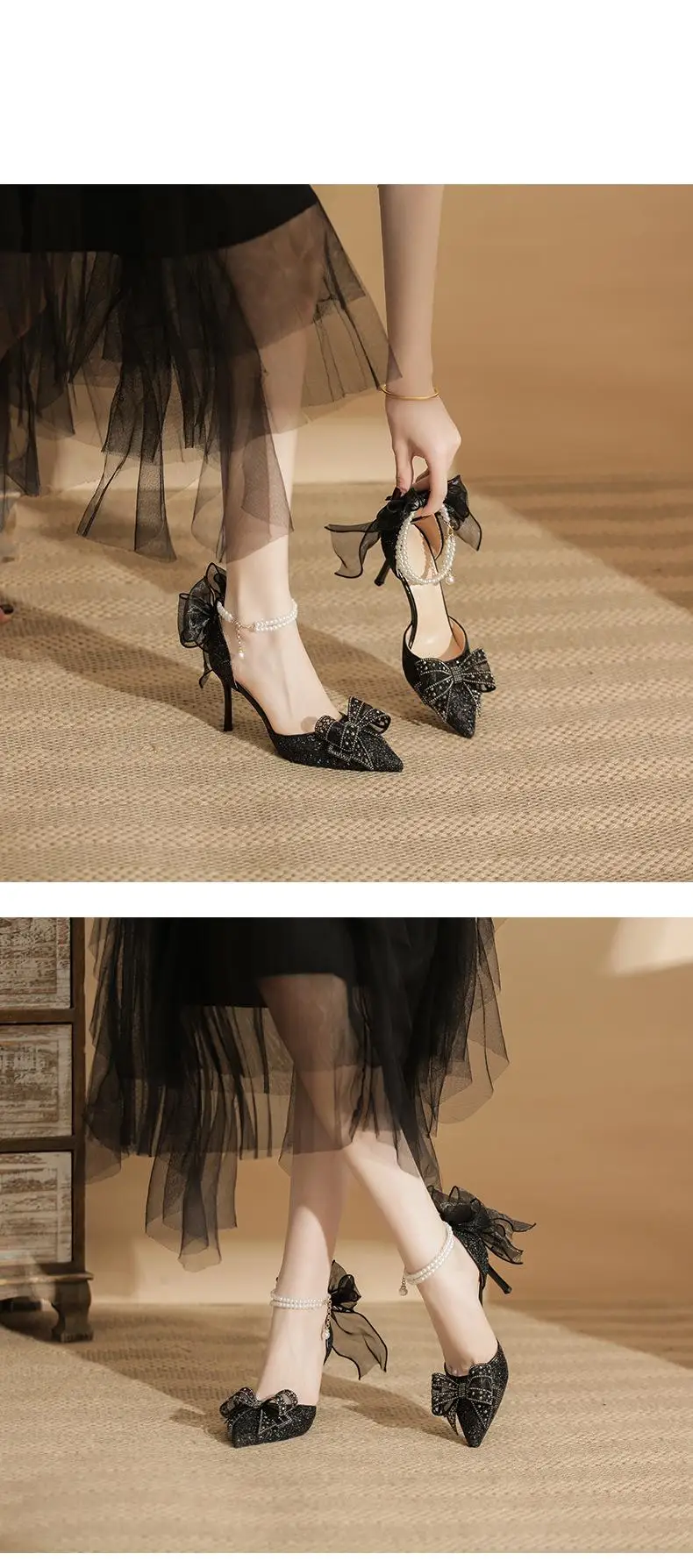 LBSFY - Size 34-40 Black High Heels Women's Stiletto Heel Pointed Pearls Buckle Bow Fashionable Thin Heel Party Dress Shoes