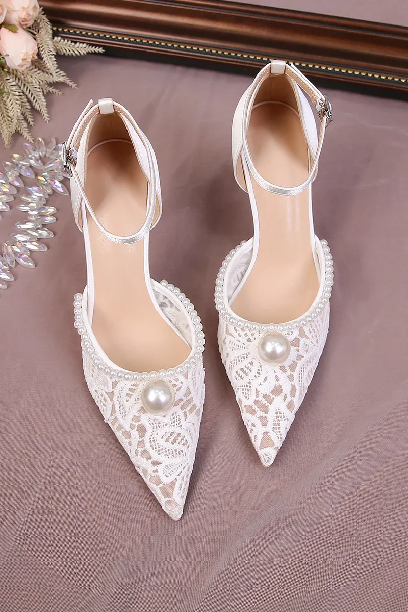 LBSFY - Size 34-42 Lace White Wedding Shoes Bridal Mesh Pearls High Heels Thin Heel Pumps Women Party Dress Shoes