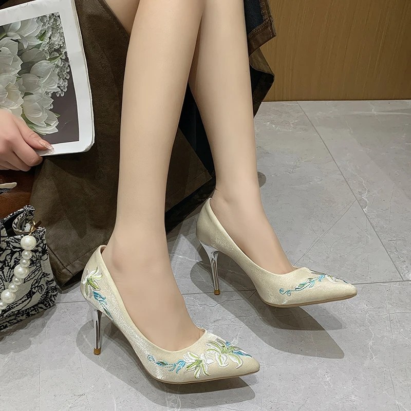 LBSFY - Slip-On Embroidery Thin Heel Pumps Women 2025 New Fashion Floral High Heels Shoes Woman Pointed Toe Embroider Party Shoes Ladies