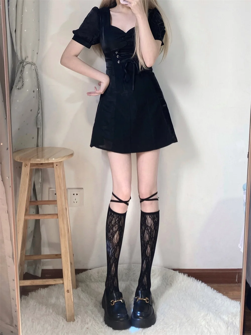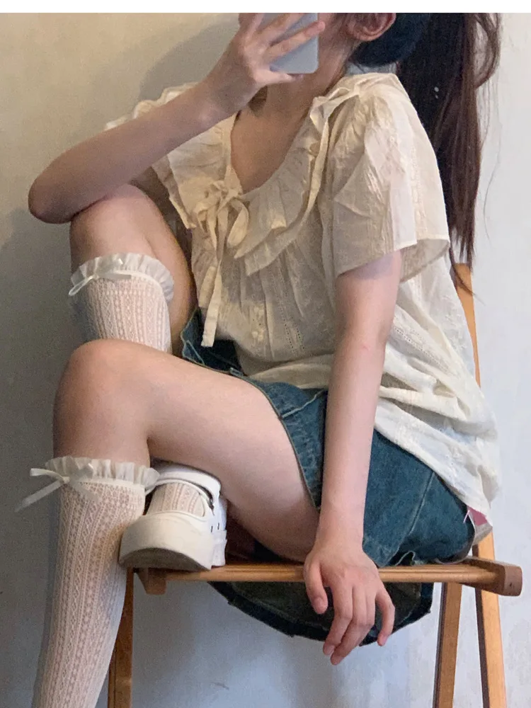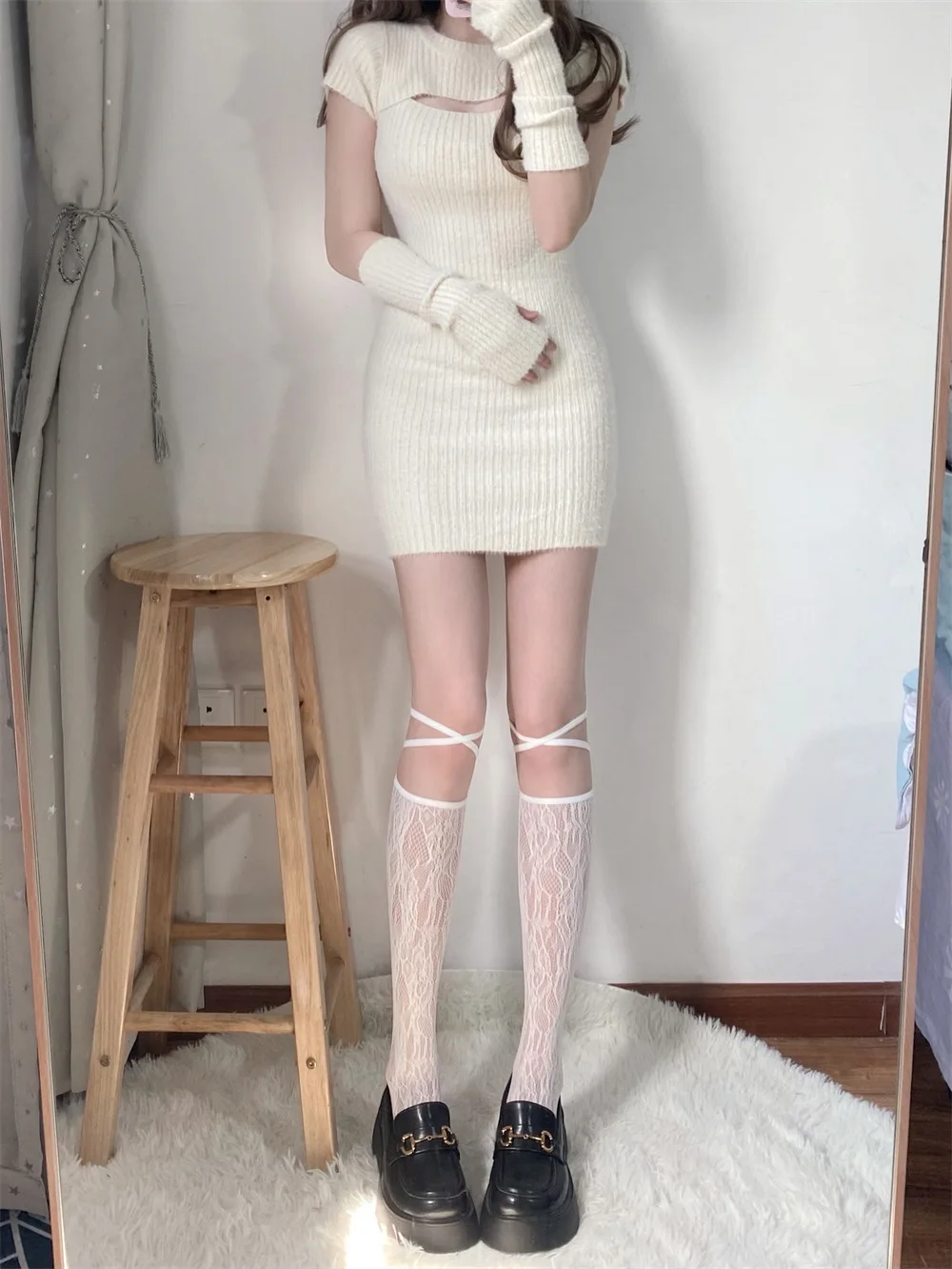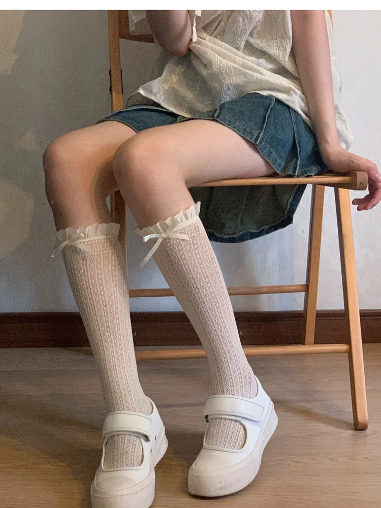 Lbsfy Solid Color Bowknot Hollow Lace Stockings Woman Summer Middle Tube JK Lolita Cute Socks Black White Fishnet Stockings for Women
