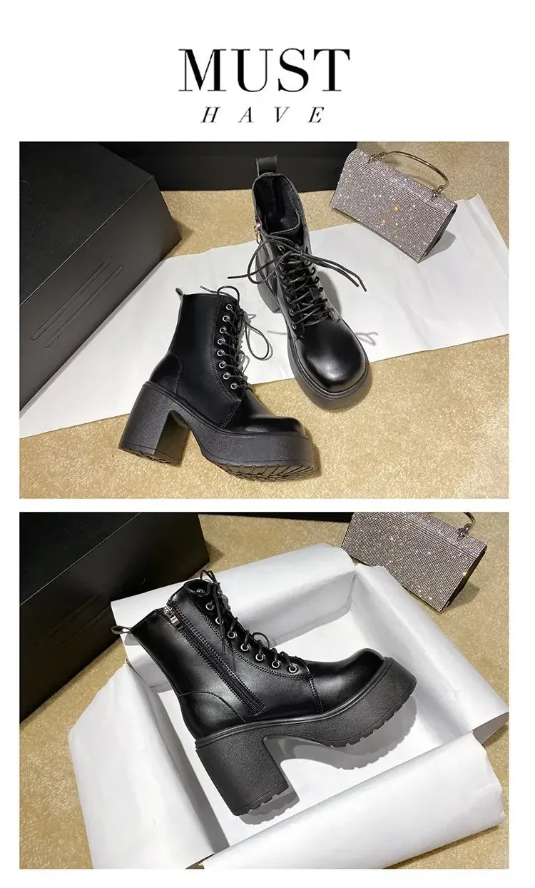 LBSFY - Spring Autumn Women Ankle Boots Waterproof Platform Lace Up Thick Heel Short Boots Fashion 9cm High Heel Leather Botas for Women