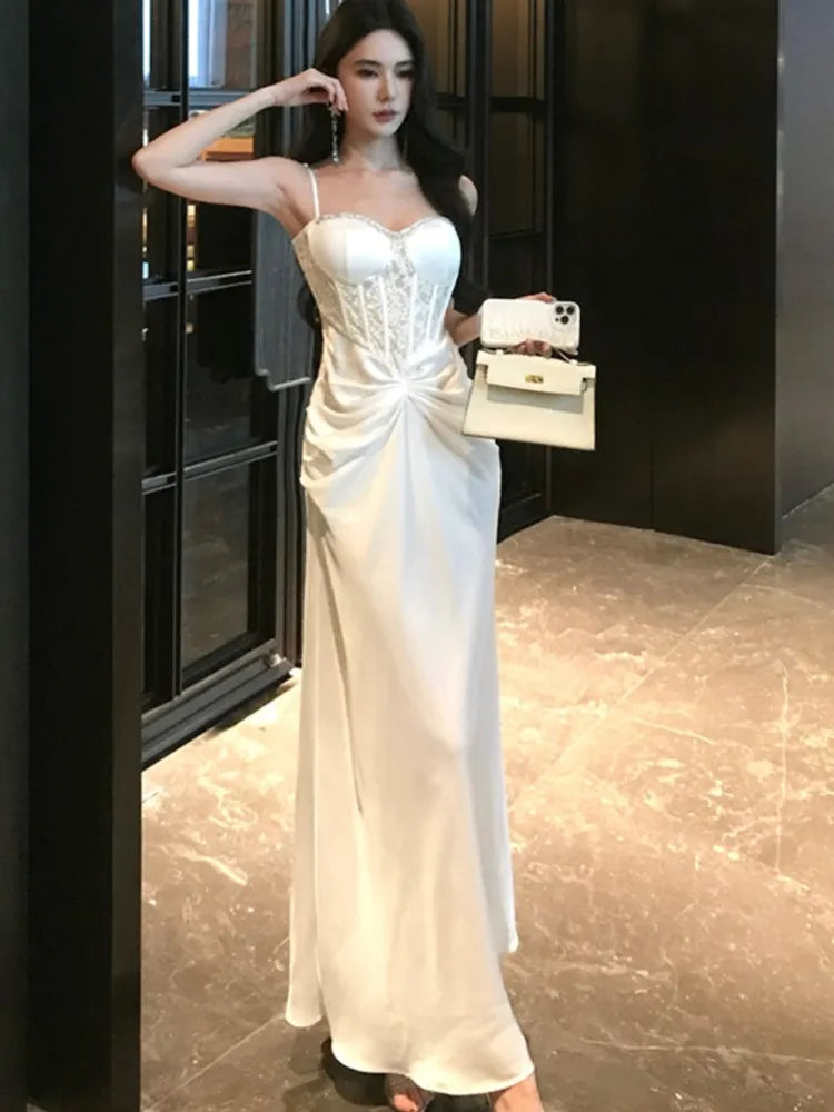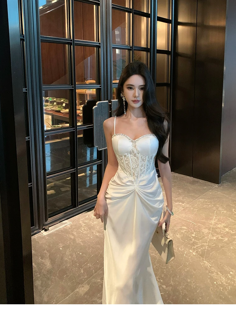LBSFY -Spring Summer French Lace Spliced Mermaid Dress Elegant Solid strap Pleated Women's Dresses Evening Party Abend Kleider 2025 New