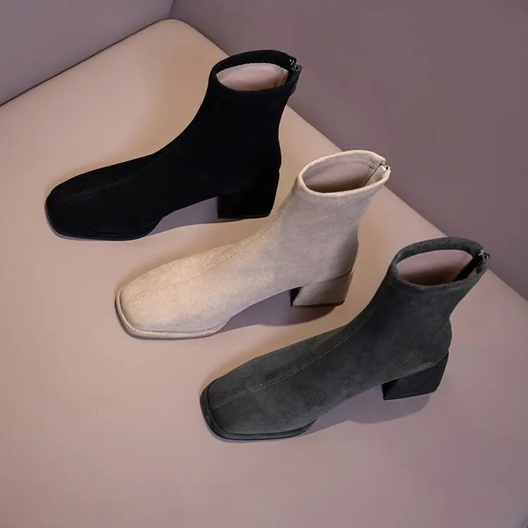 LBSFY - Square Toe Suede Short Boots Women's Autumn Winter Elastic Thick Heel Back Zip Ankle Boots Fashion Gray Black Botas De Mujer