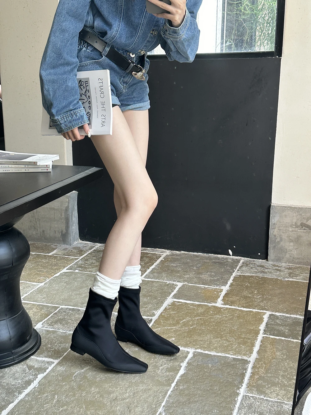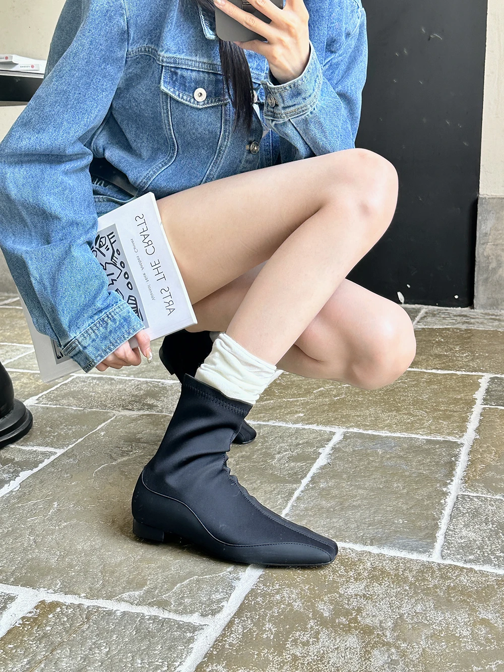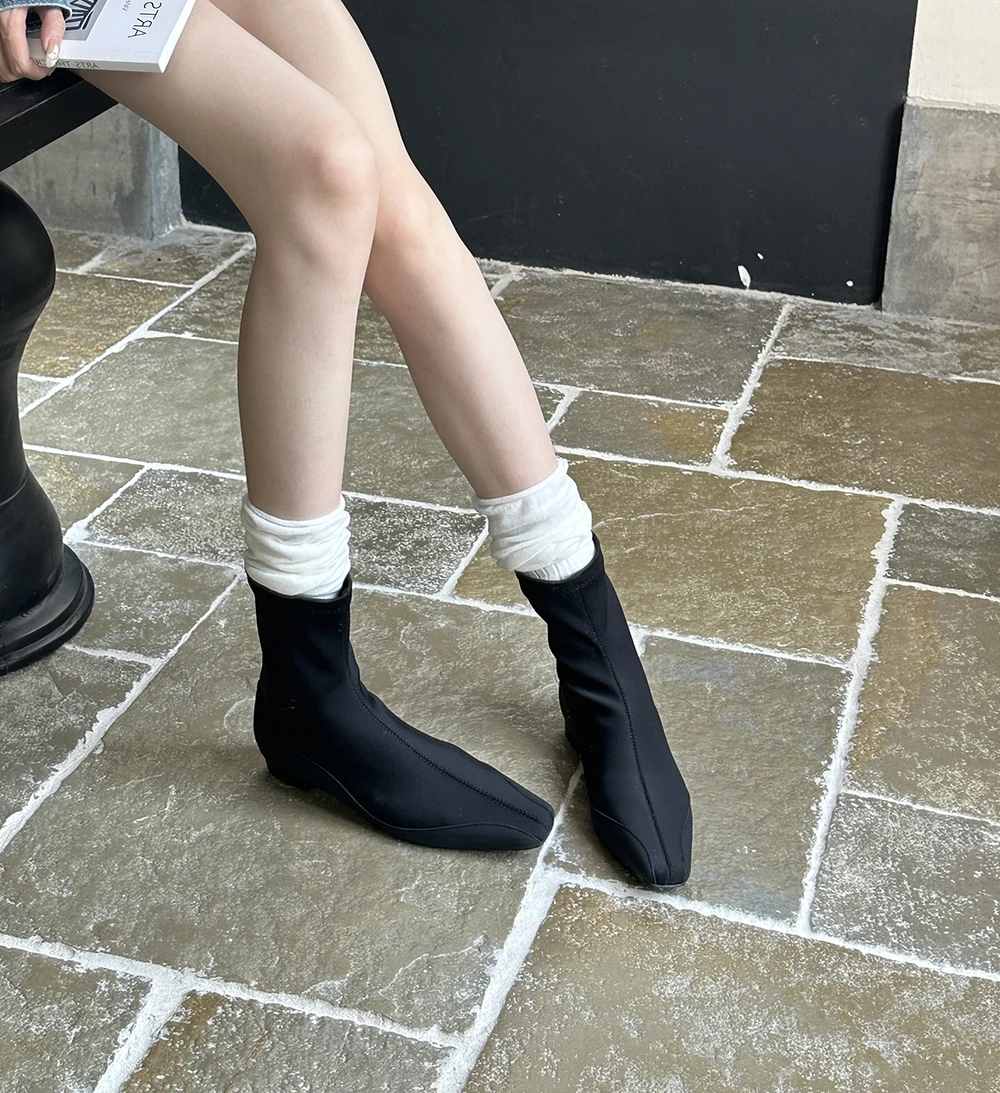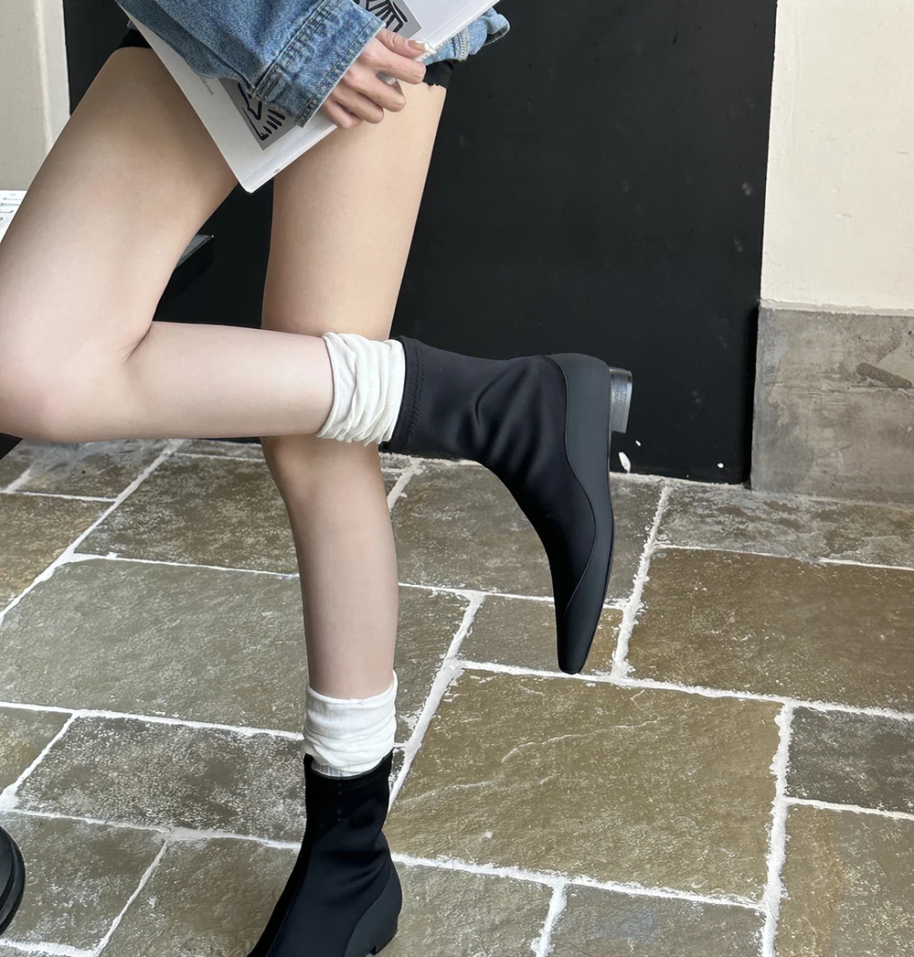 LBSFY - Square Toe Women Ankle Boots Lycra Botas 2024 New Arrivals Ankle Boots Black Cool Autumn Spring Winter Flat Low Heels Bootie 39