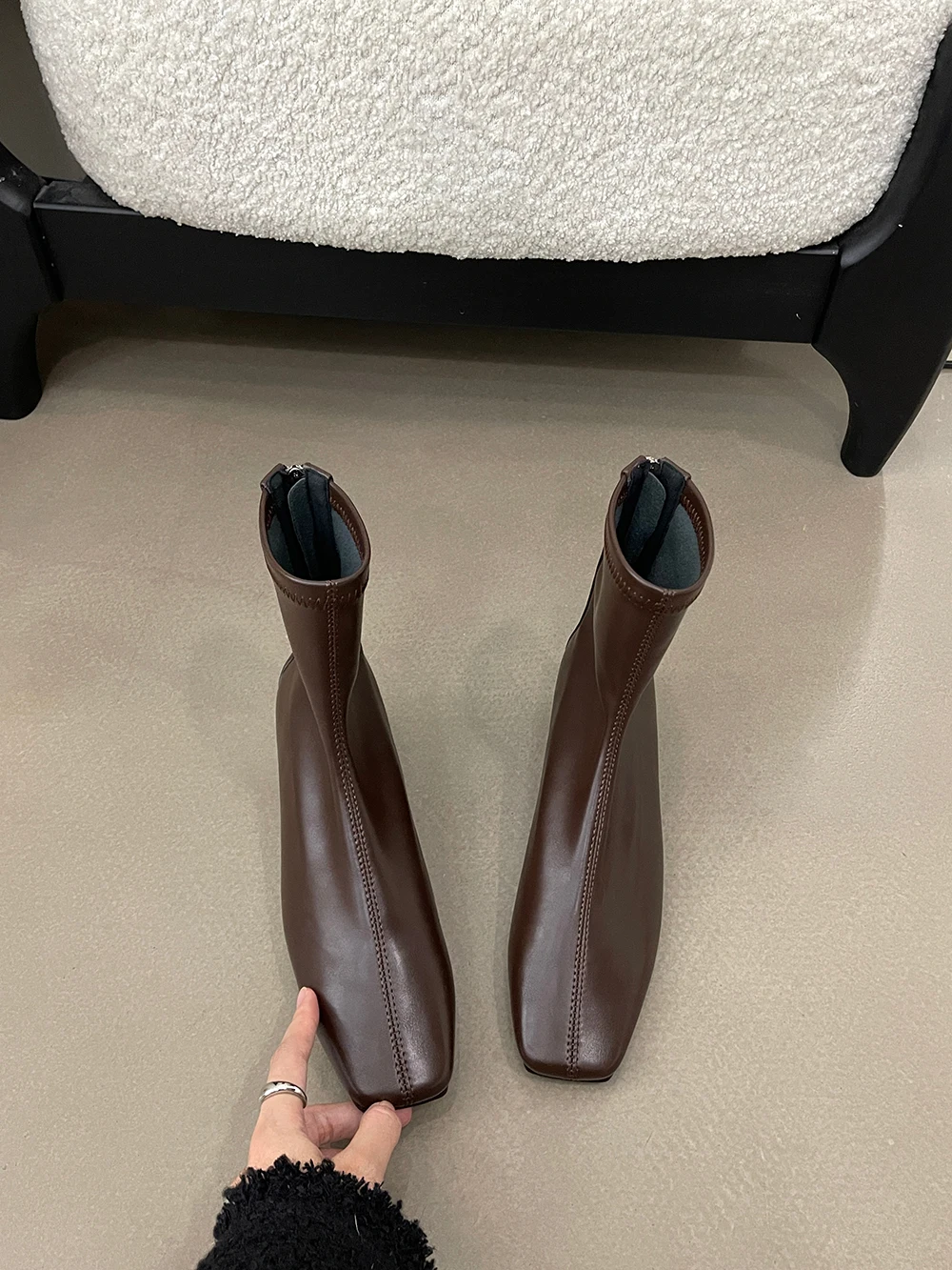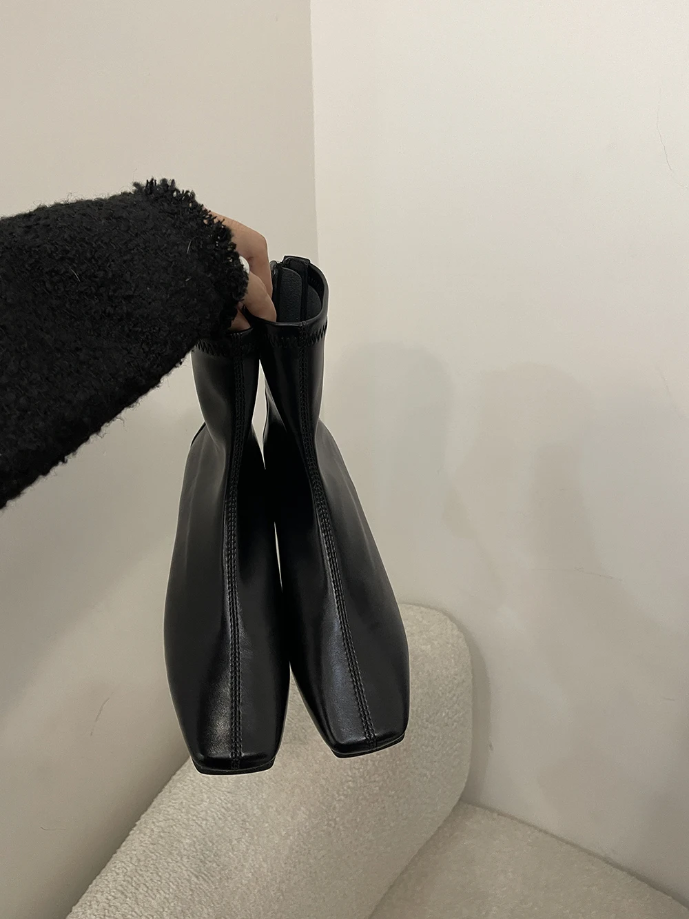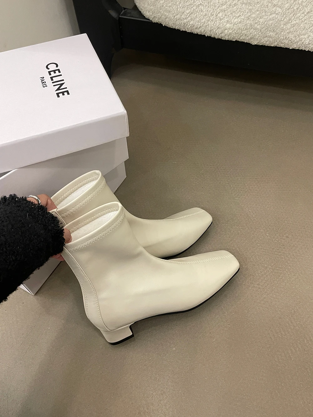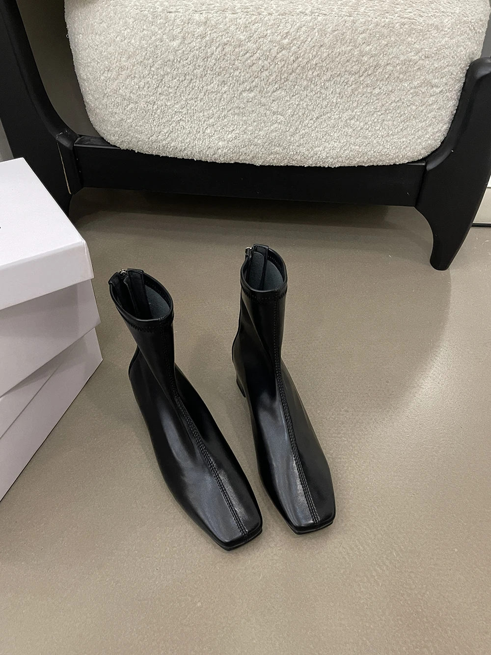 LBSFY - Square Toe Women Ankle Boots Stretch Shoes Sock Boots Back Zipper Mid Thick Flat Heeled Black White Brown Winter Autumn Boots