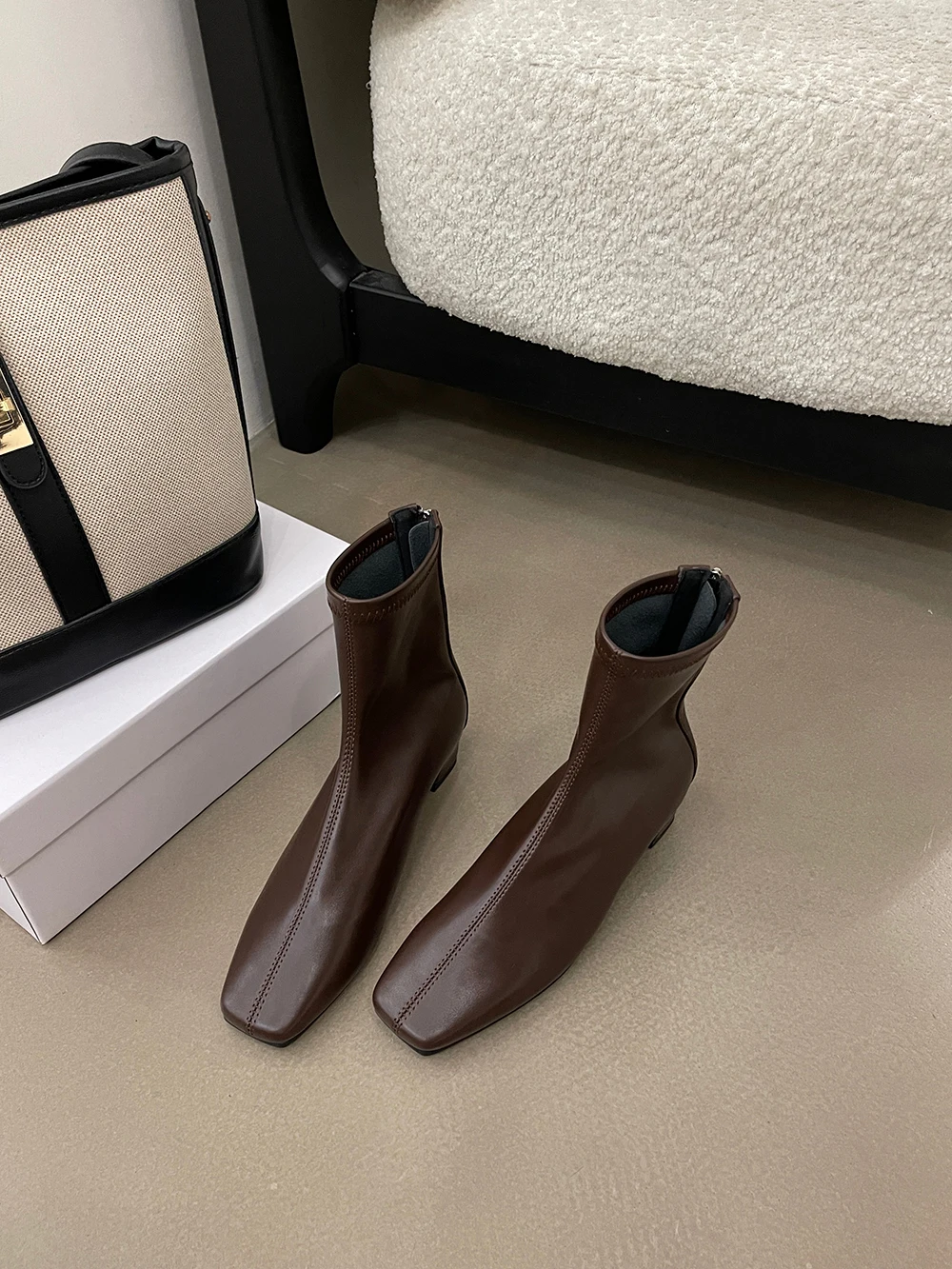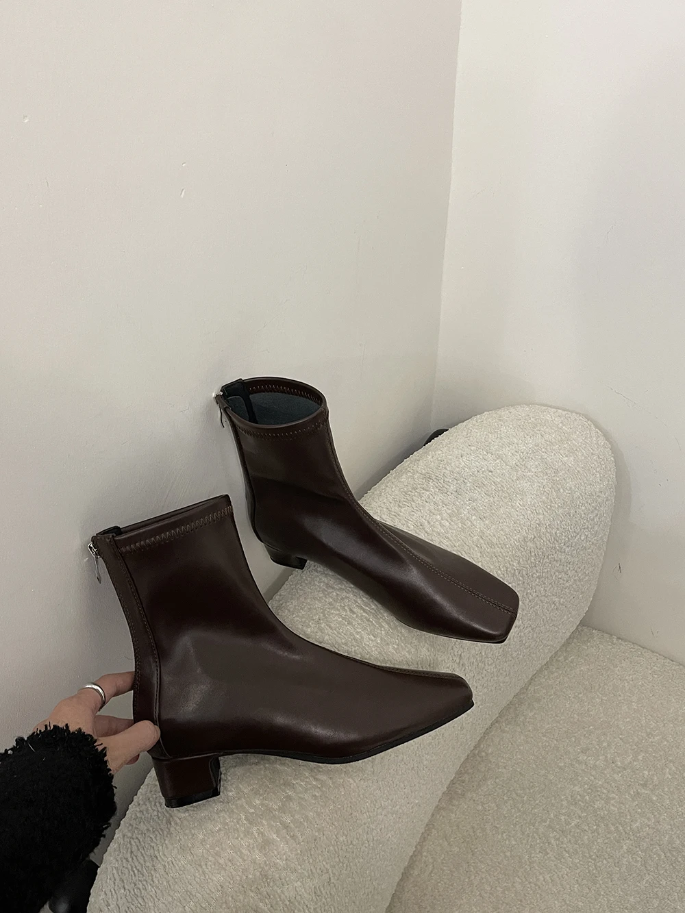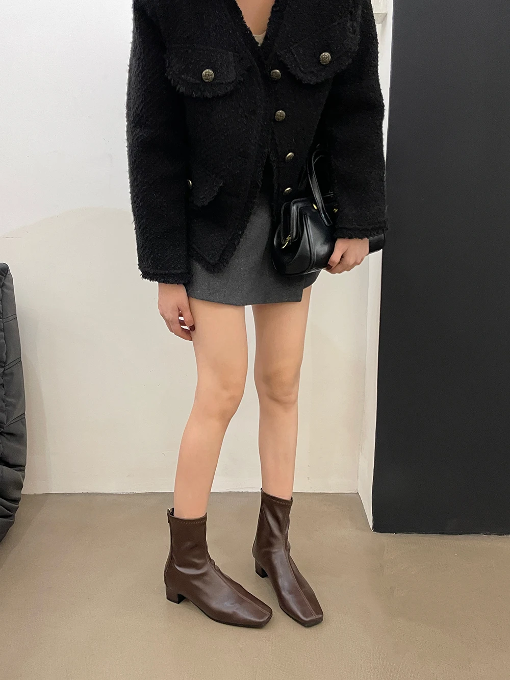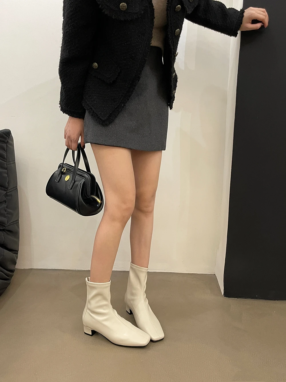 LBSFY - Square Toe Women Ankle Boots Stretch Shoes Sock Boots Back Zipper Mid Thick Flat Heeled Black White Brown Winter Autumn Boots