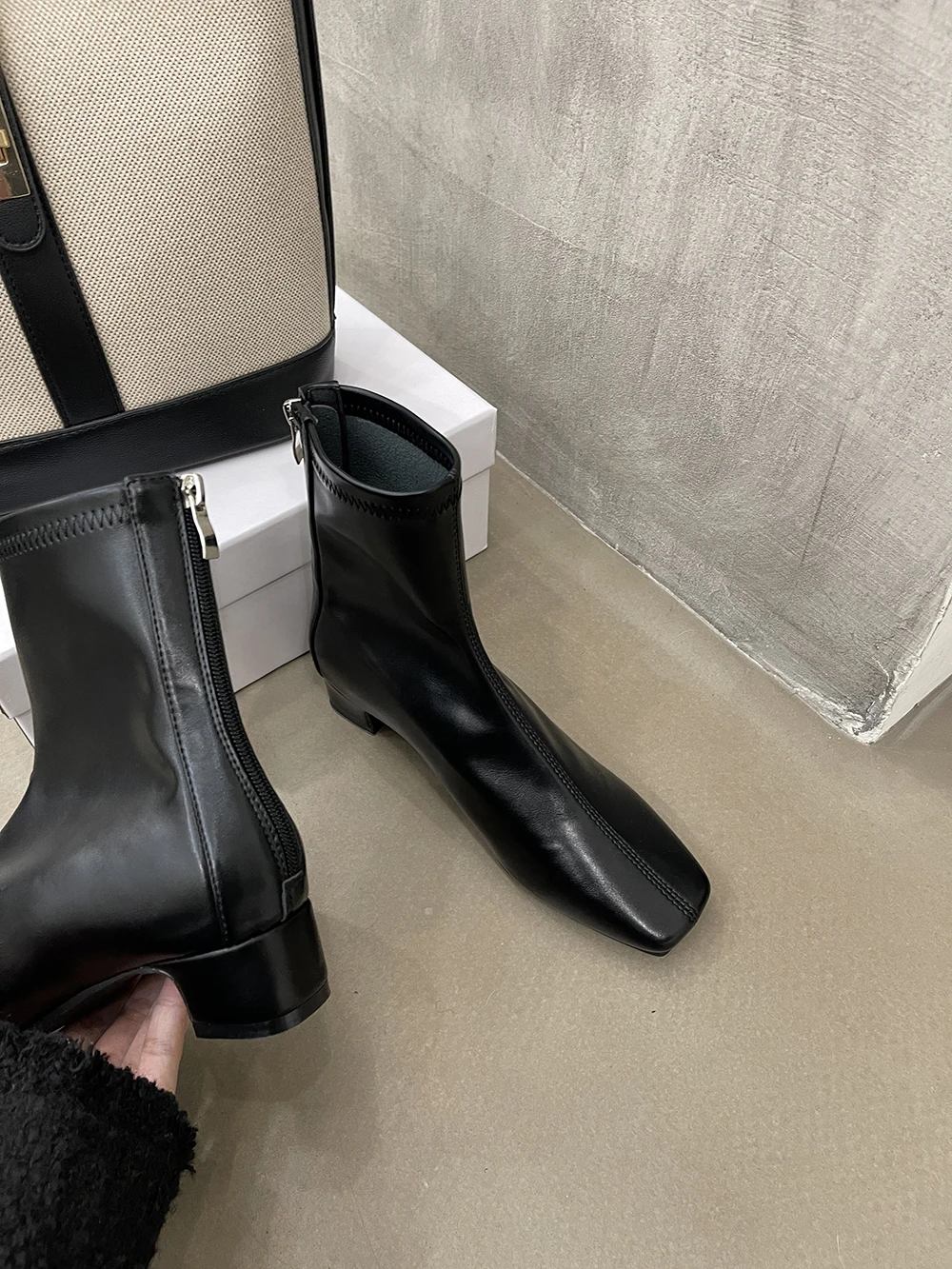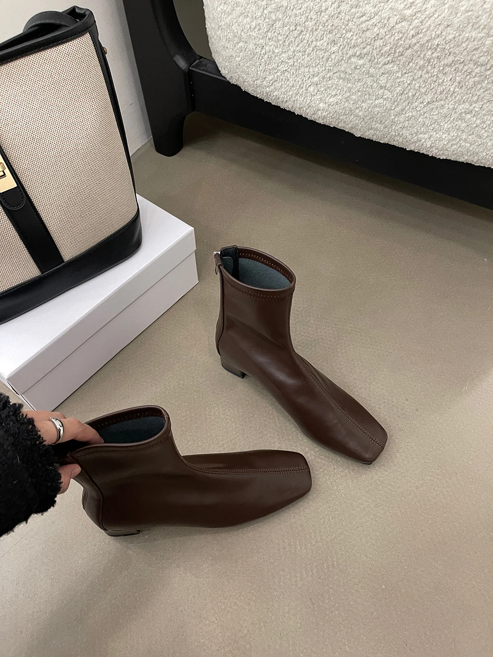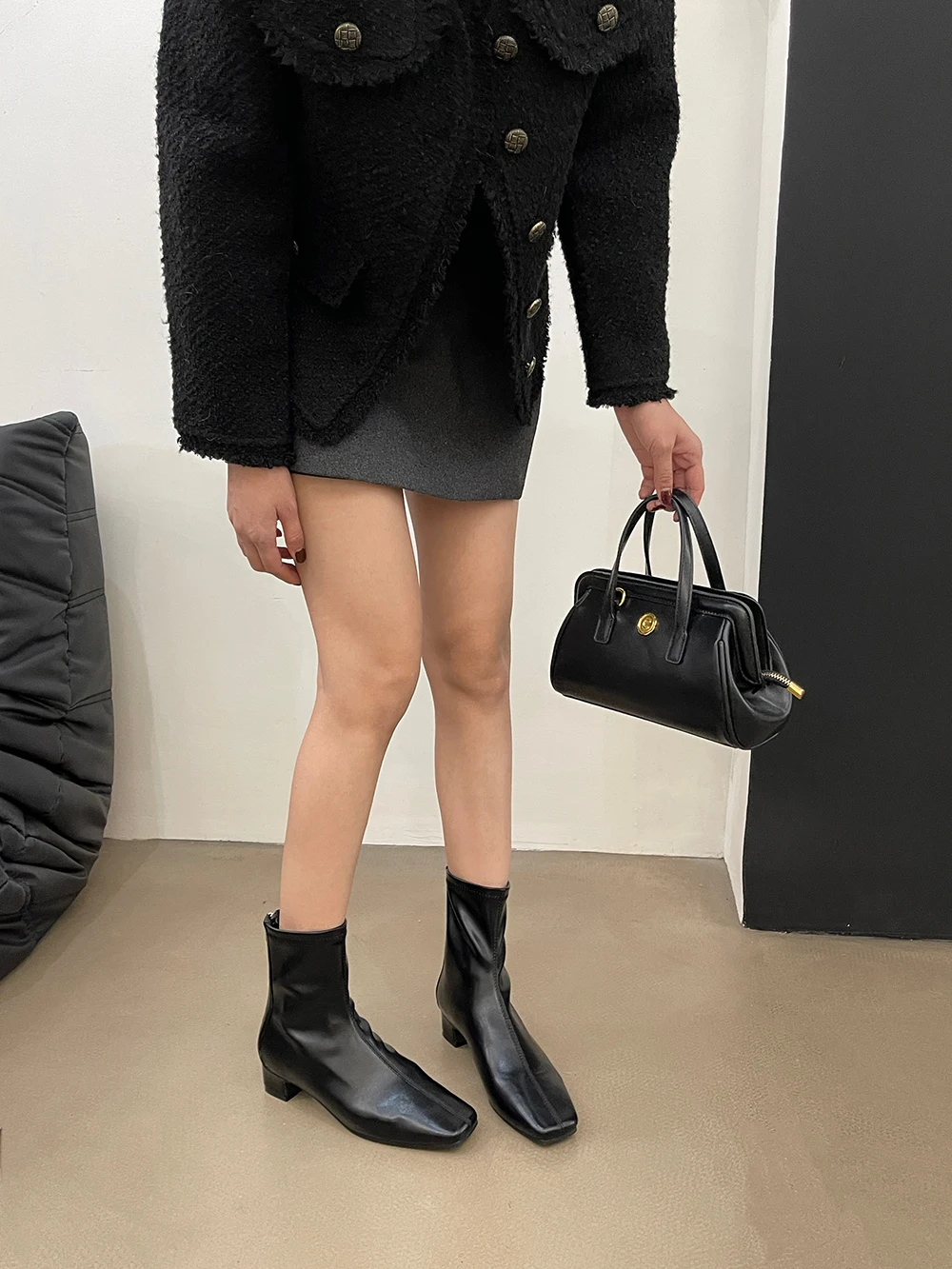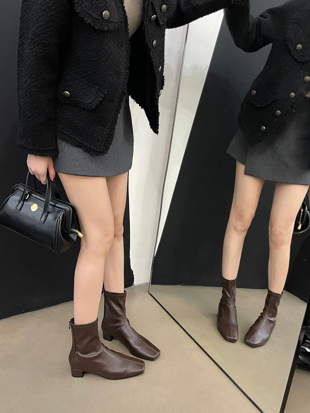LBSFY - Square Toe Women Ankle Boots Stretch Shoes Sock Boots Back Zipper Mid Thick Flat Heeled Black White Brown Winter Autumn Boots