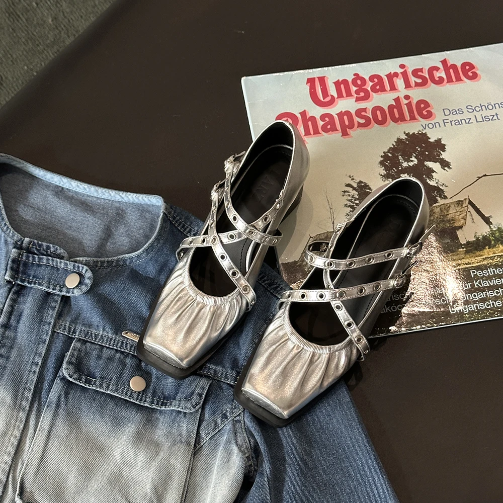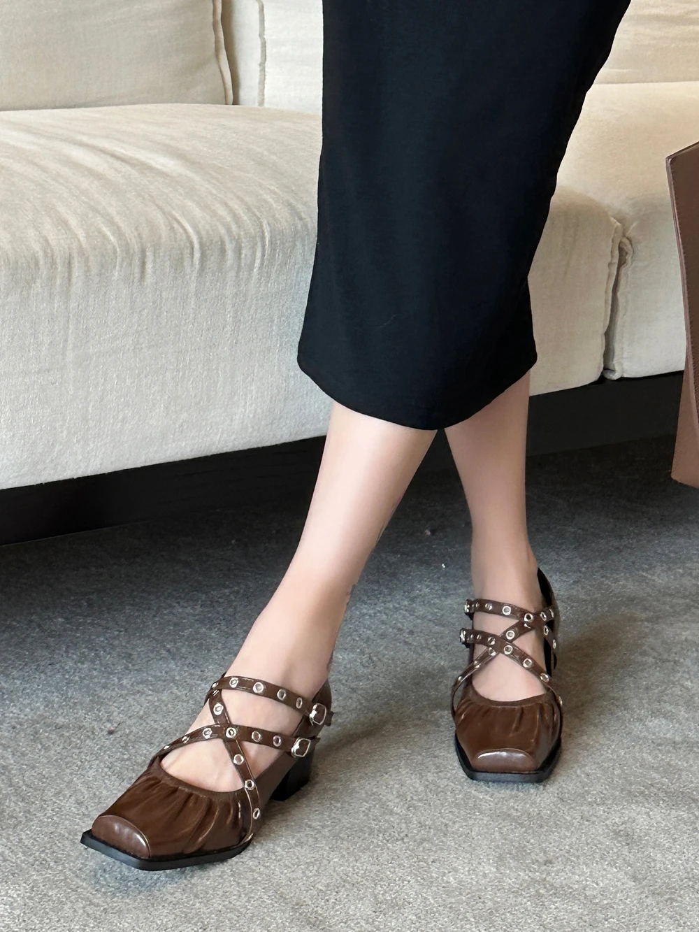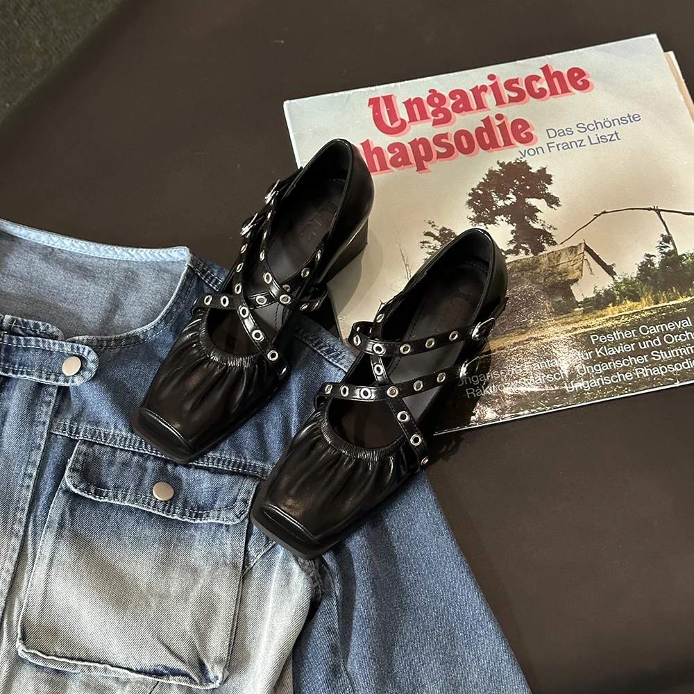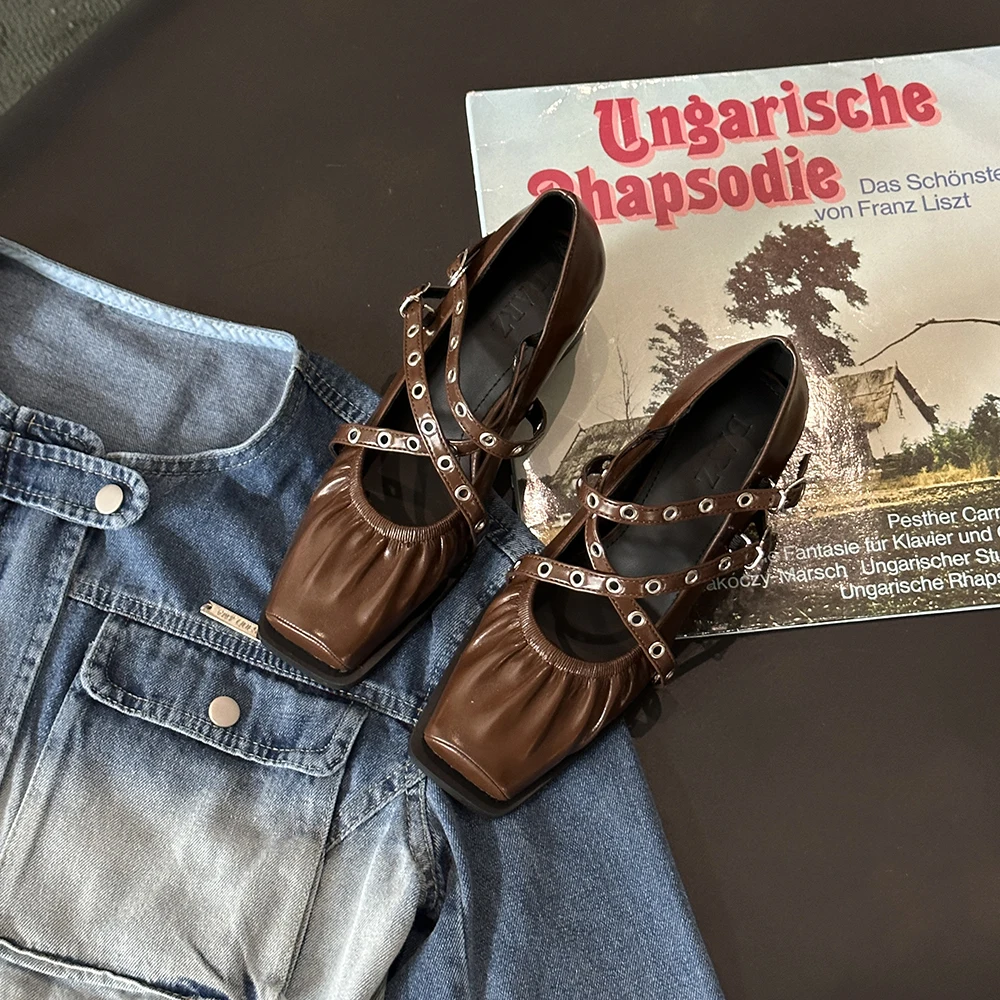 LBSFY - Square Toe Women Pumps 2024 New Arrivals Black Brown Silver Rivet Design Cross Strap Ankle Strap Fashion Party Pumps 35-39