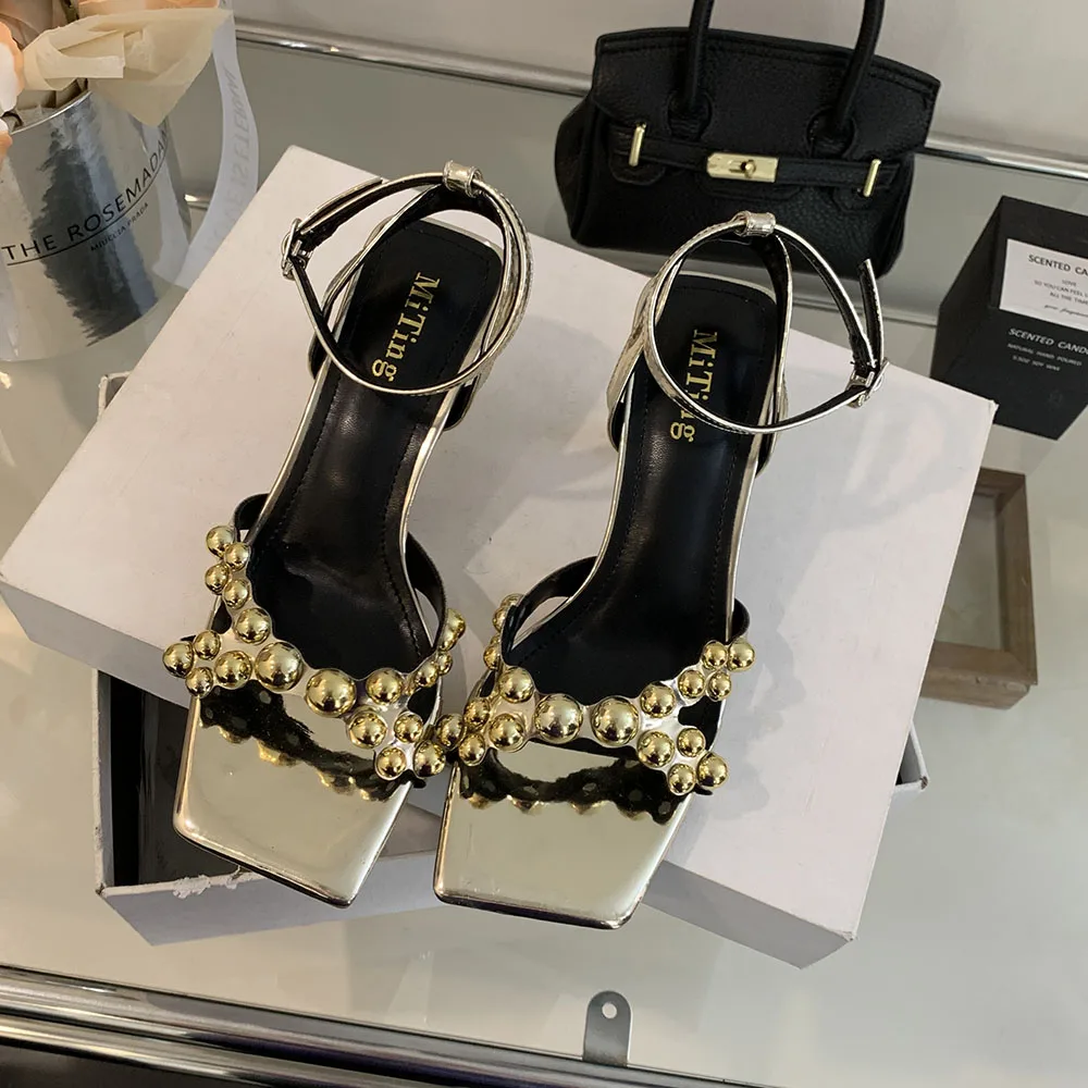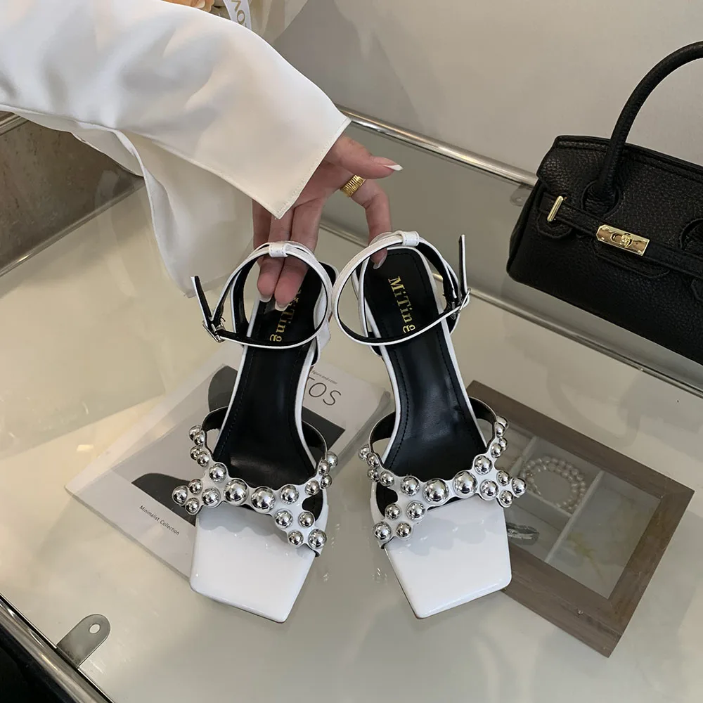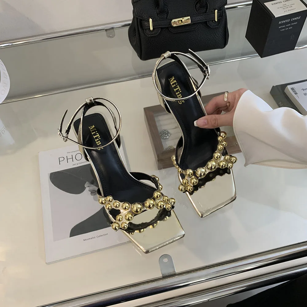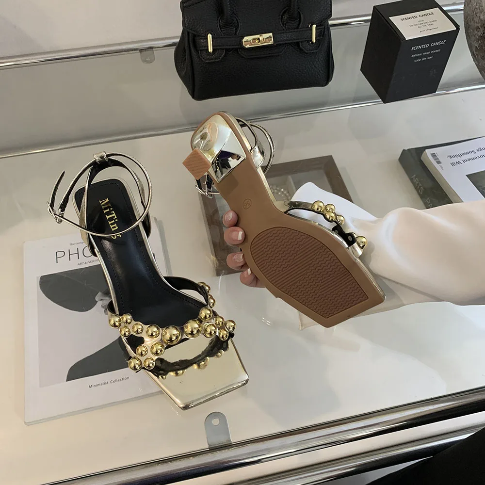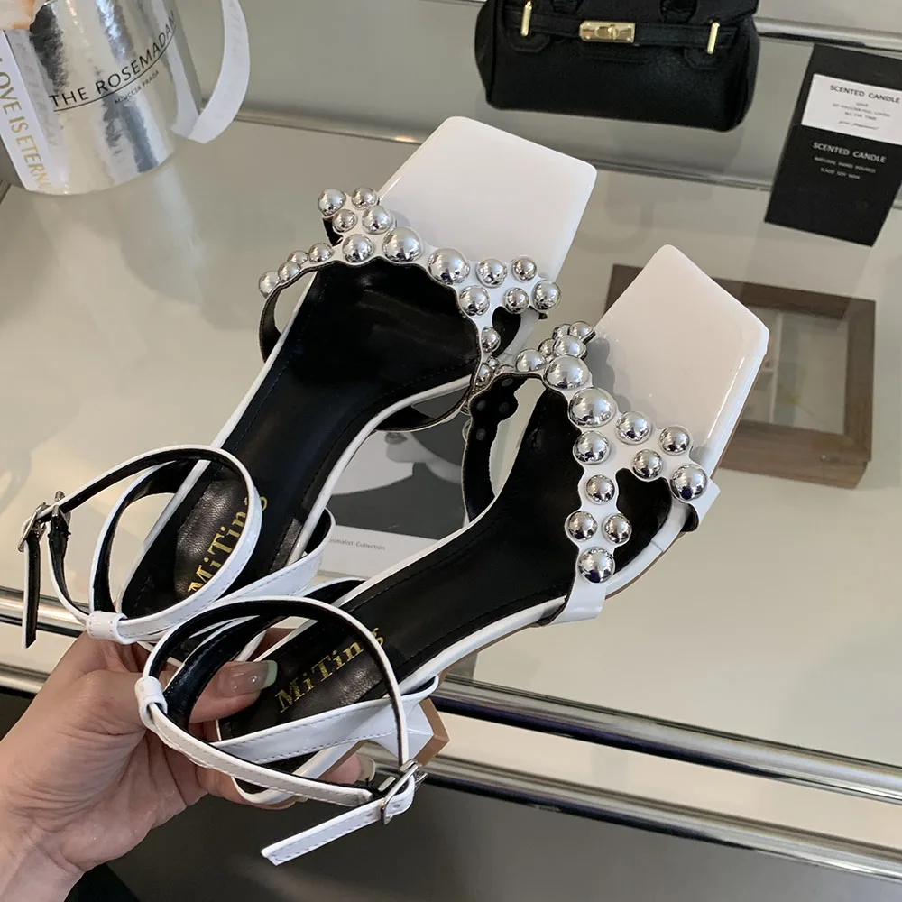 LBSFY - Square Toe Women Sandals Rivet Design Black Gold Silver White Ankle Strap Summer Party Sandals Thin High Heels Slides Mules 39