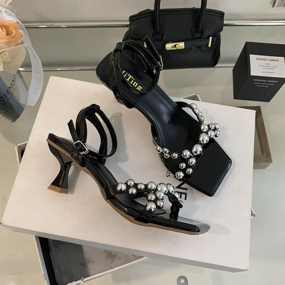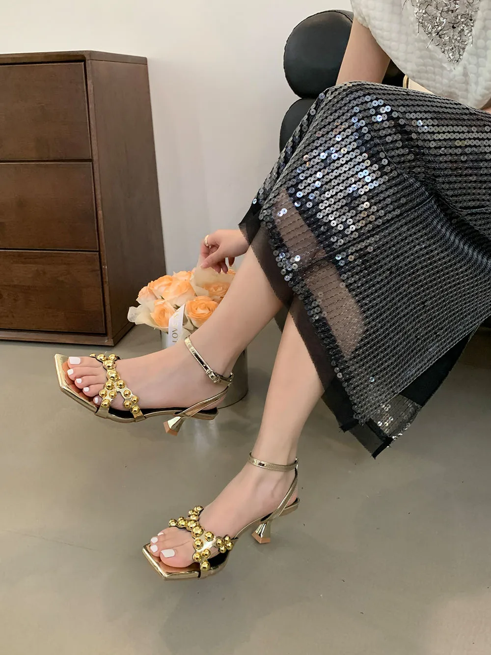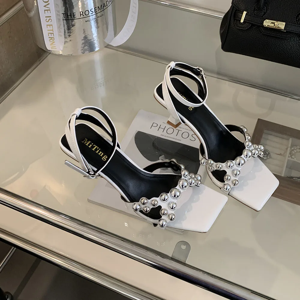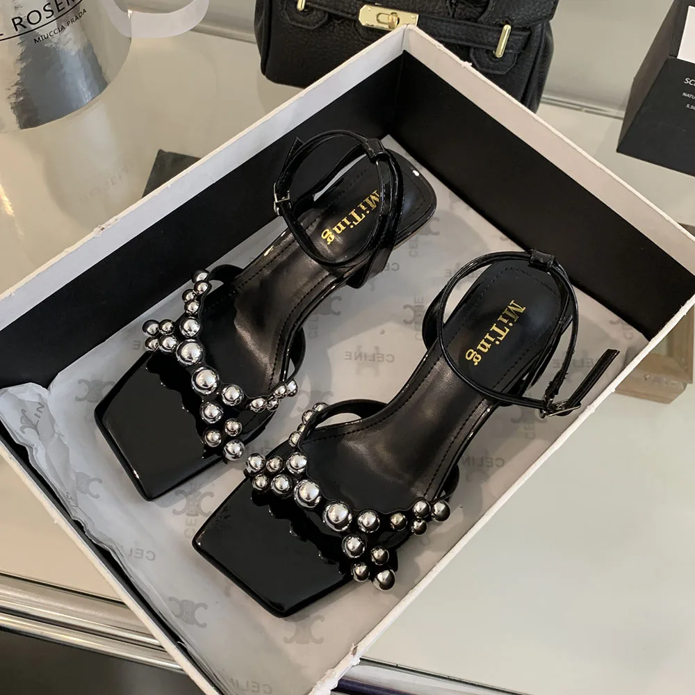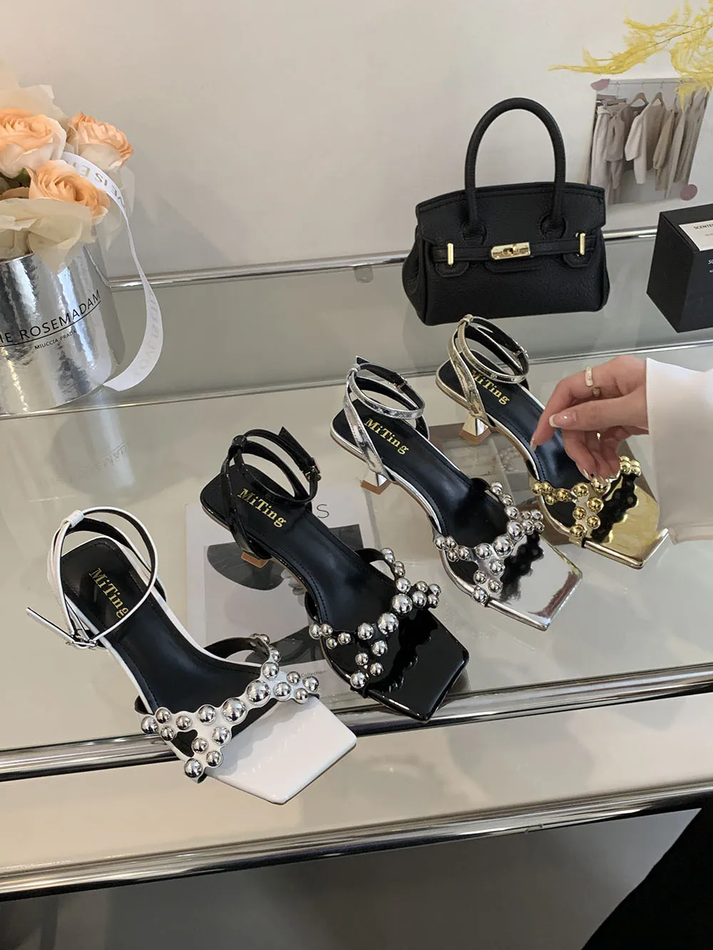 LBSFY - Square Toe Women Sandals Rivet Design Black Gold Silver White Ankle Strap Summer Party Sandals Thin High Heels Slides Mules 39