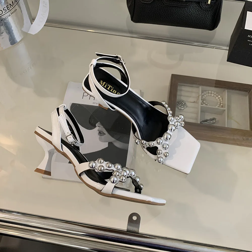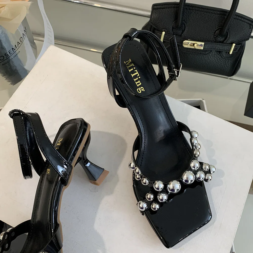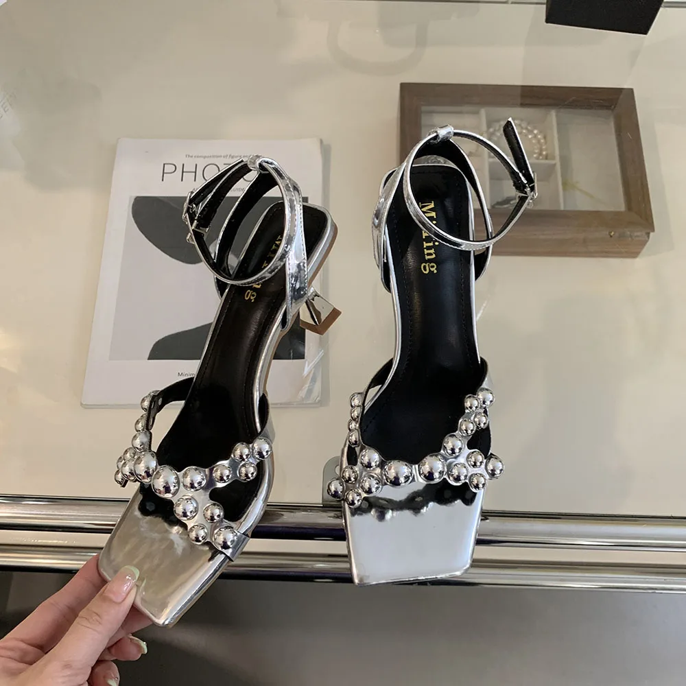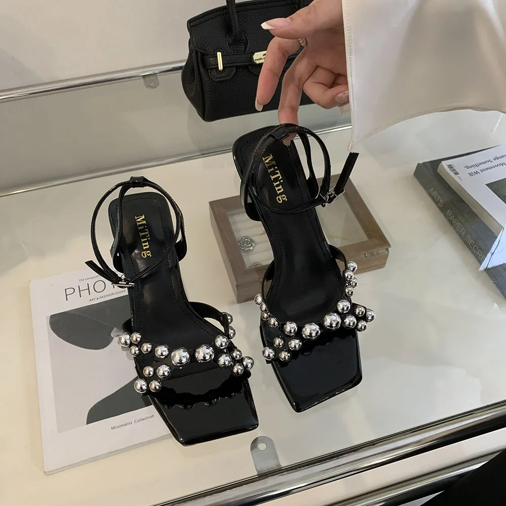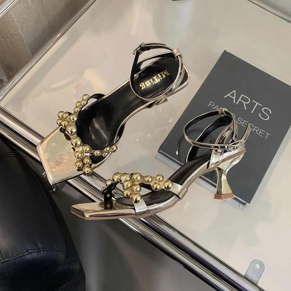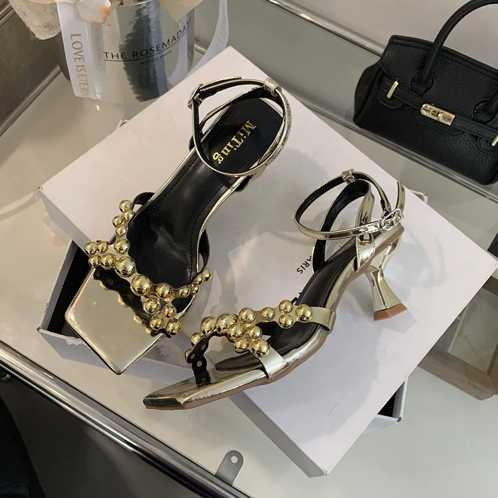 LBSFY - Square Toe Women Sandals Rivet Design Black Gold Silver White Ankle Strap Summer Party Sandals Thin High Heels Slides Mules 39