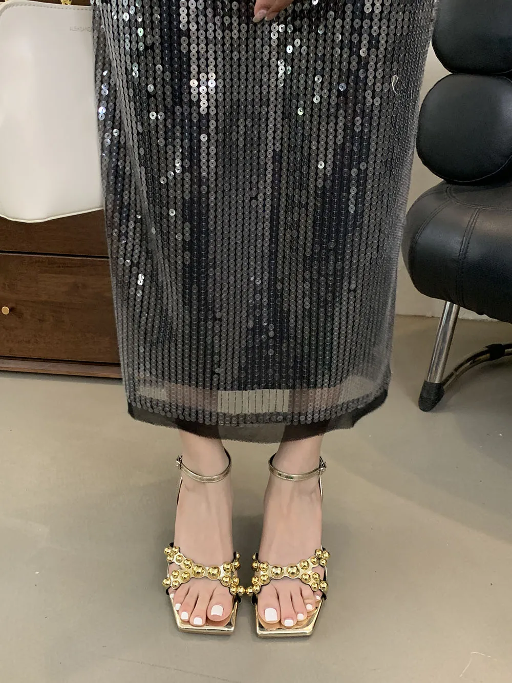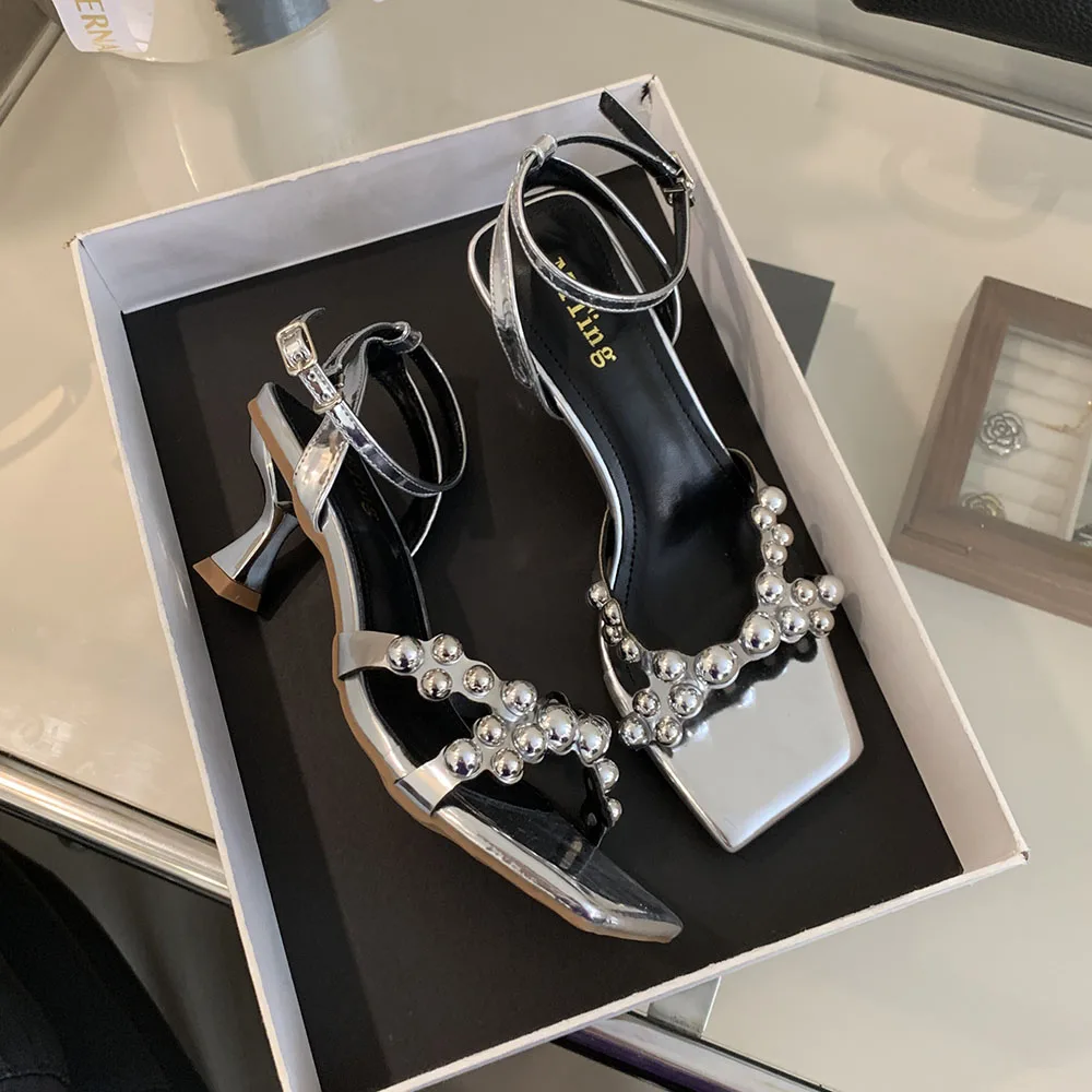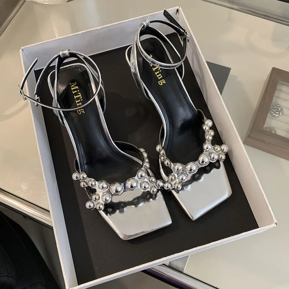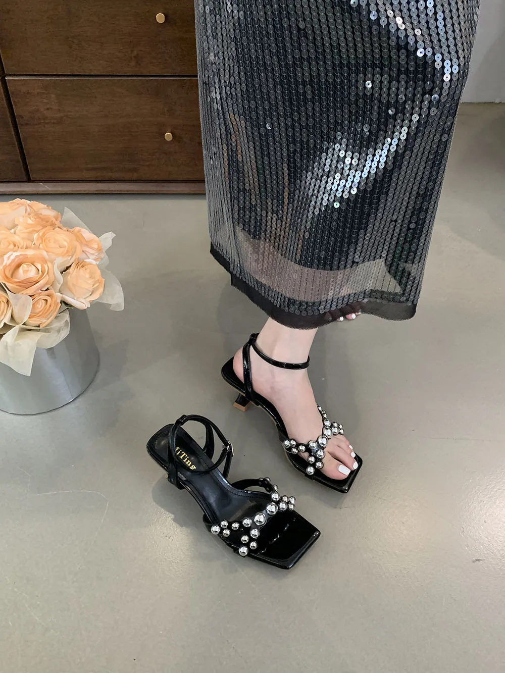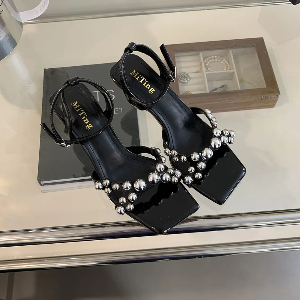 LBSFY - Square Toe Women Sandals Rivet Design Black Gold Silver White Ankle Strap Summer Party Sandals Thin High Heels Slides Mules 39