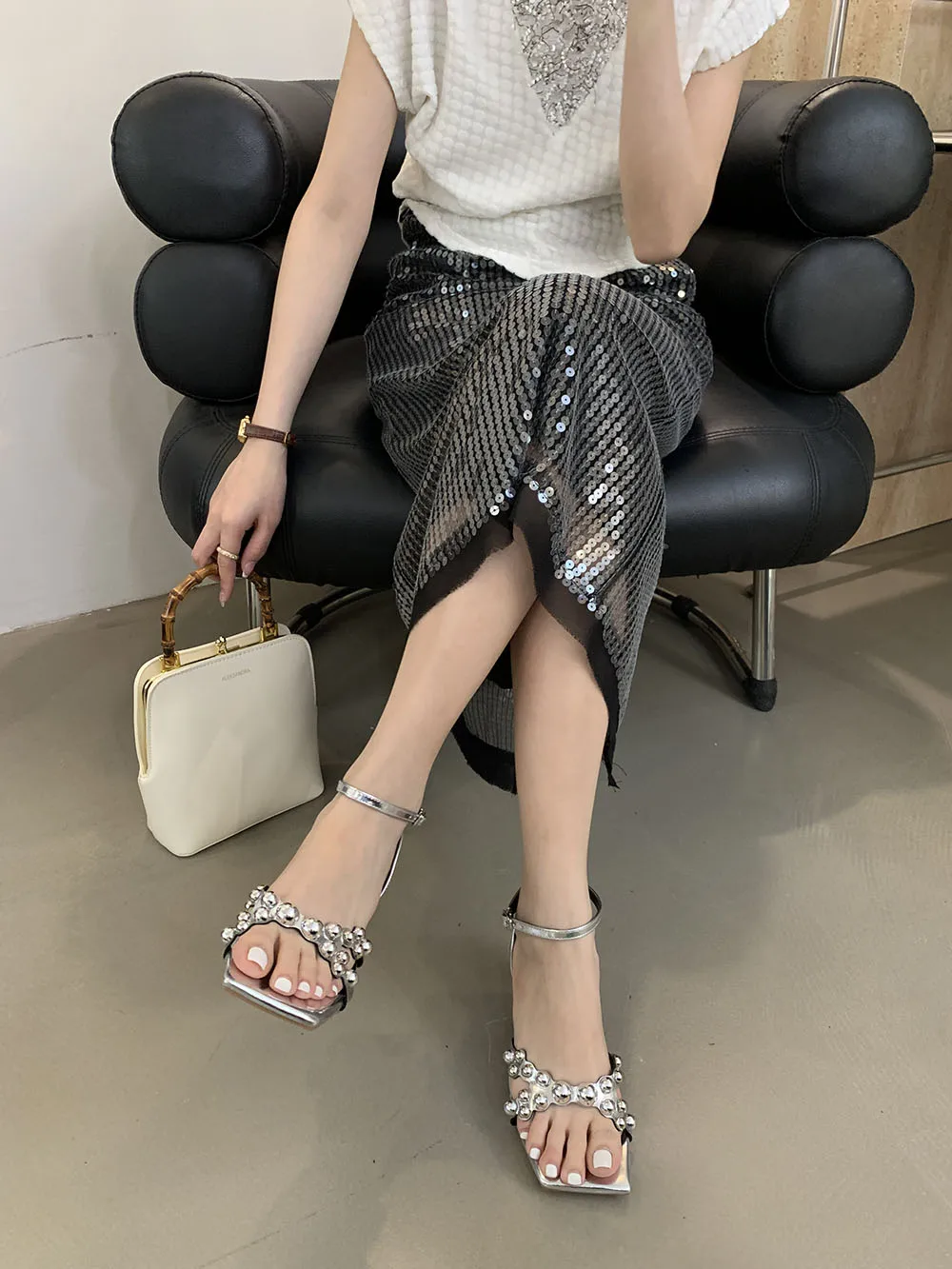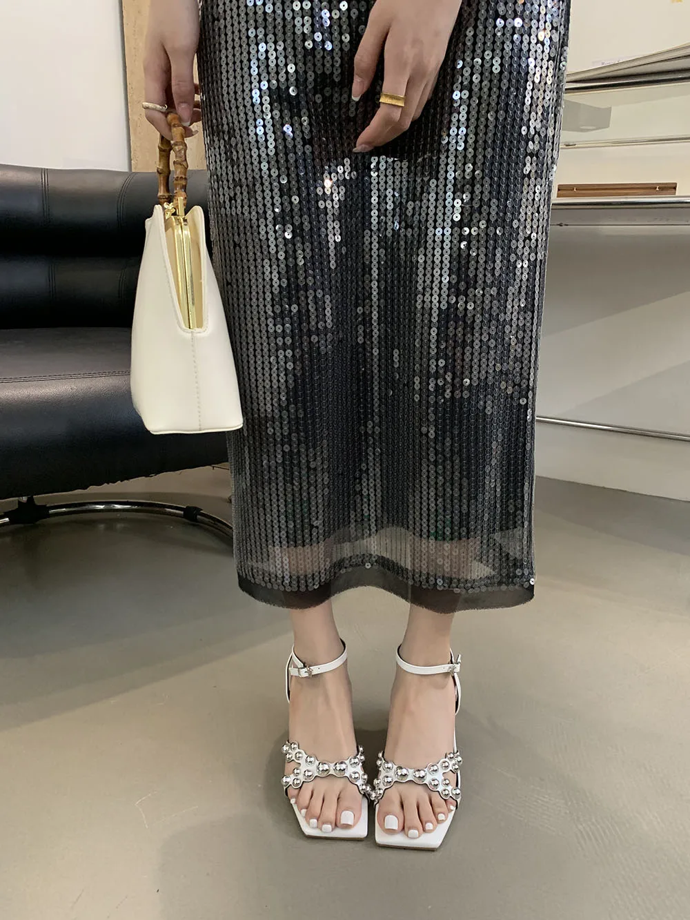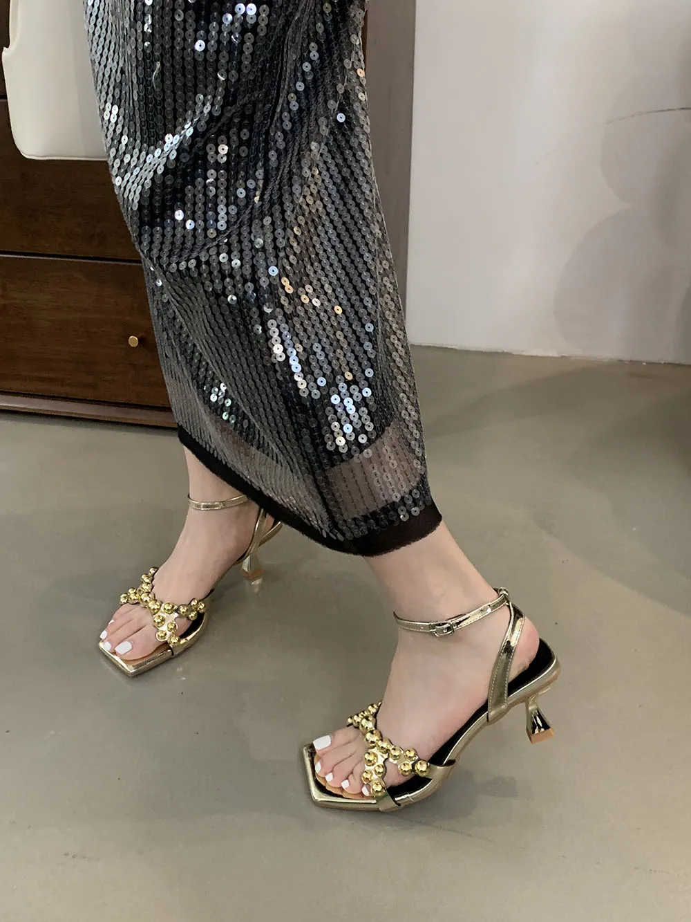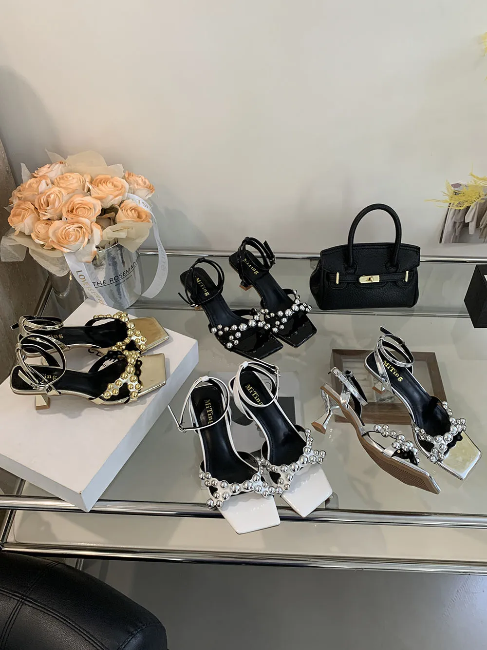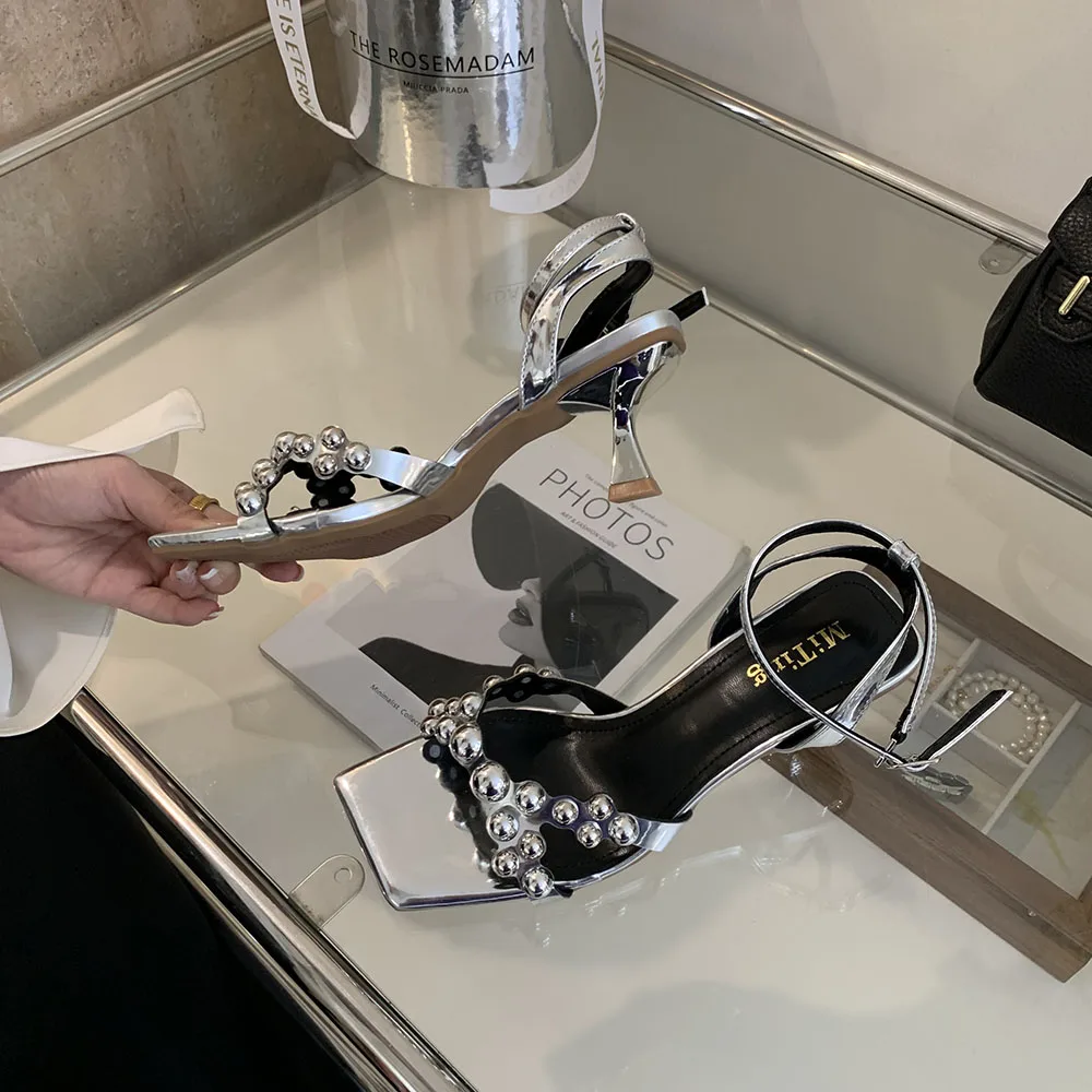 LBSFY - Square Toe Women Sandals Rivet Design Black Gold Silver White Ankle Strap Summer Party Sandals Thin High Heels Slides Mules 39