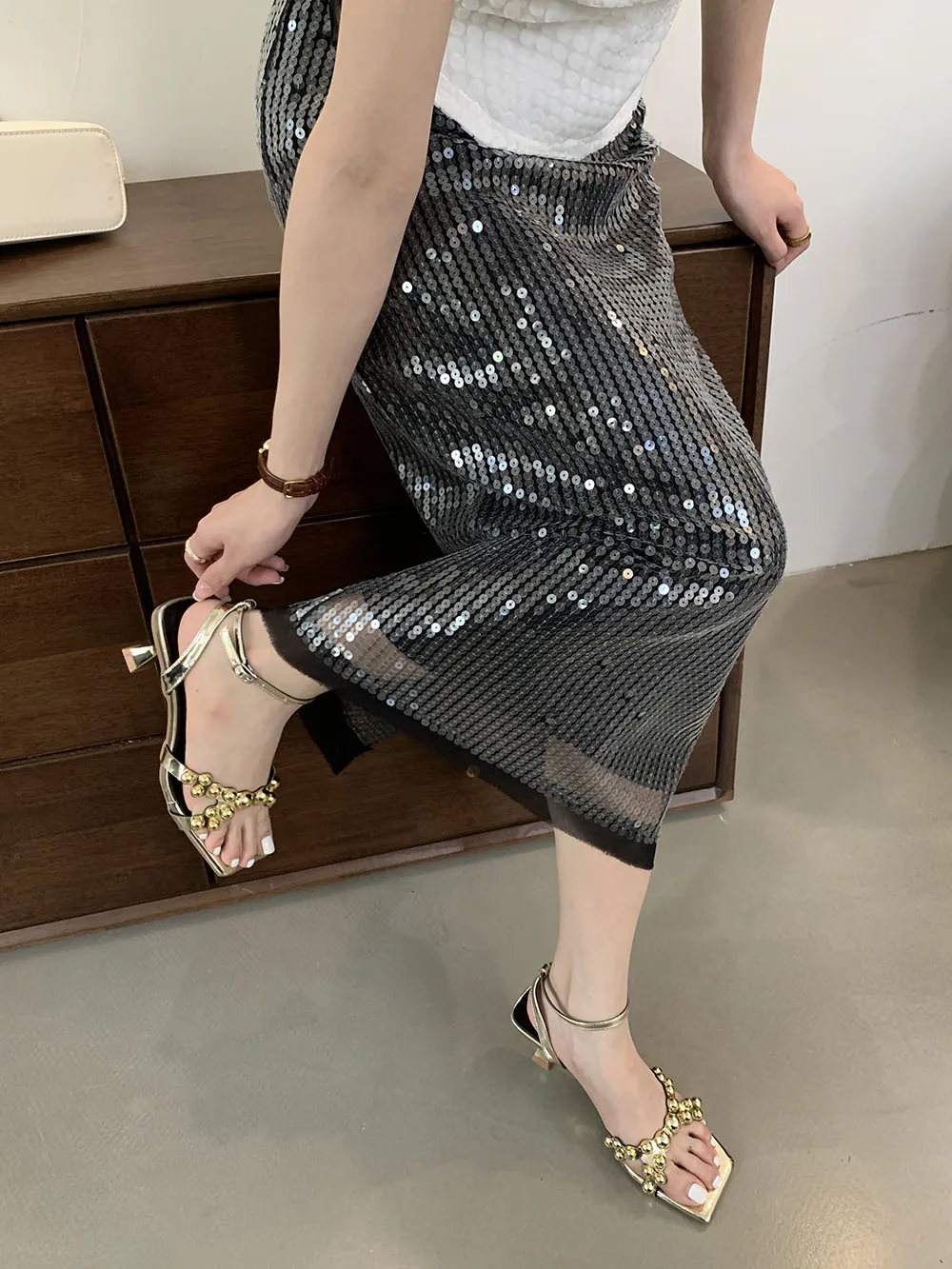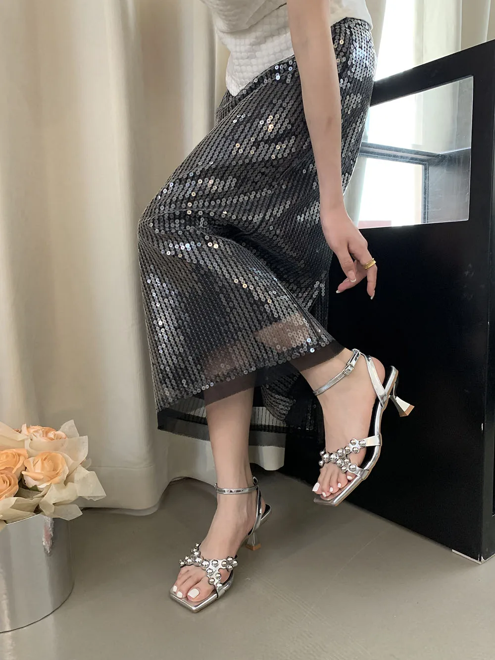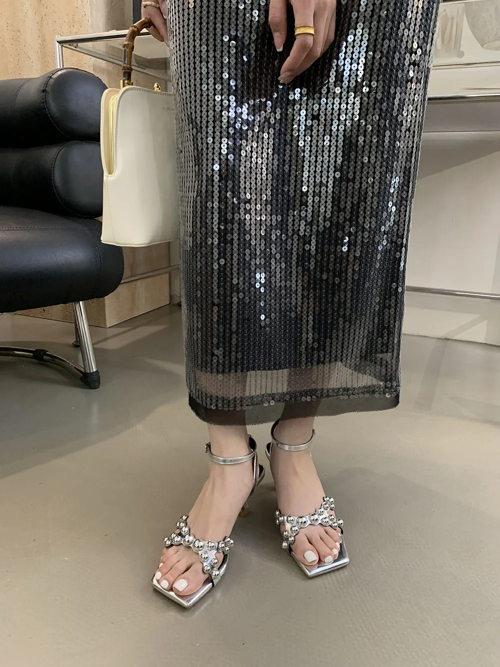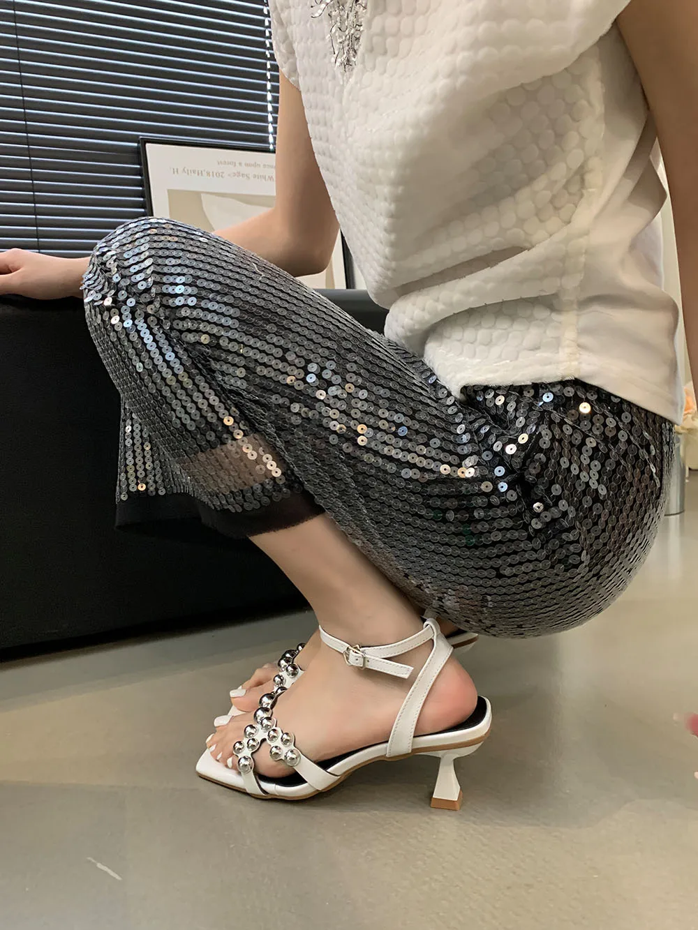 LBSFY - Square Toe Women Sandals Rivet Design Black Gold Silver White Ankle Strap Summer Party Sandals Thin High Heels Slides Mules 39