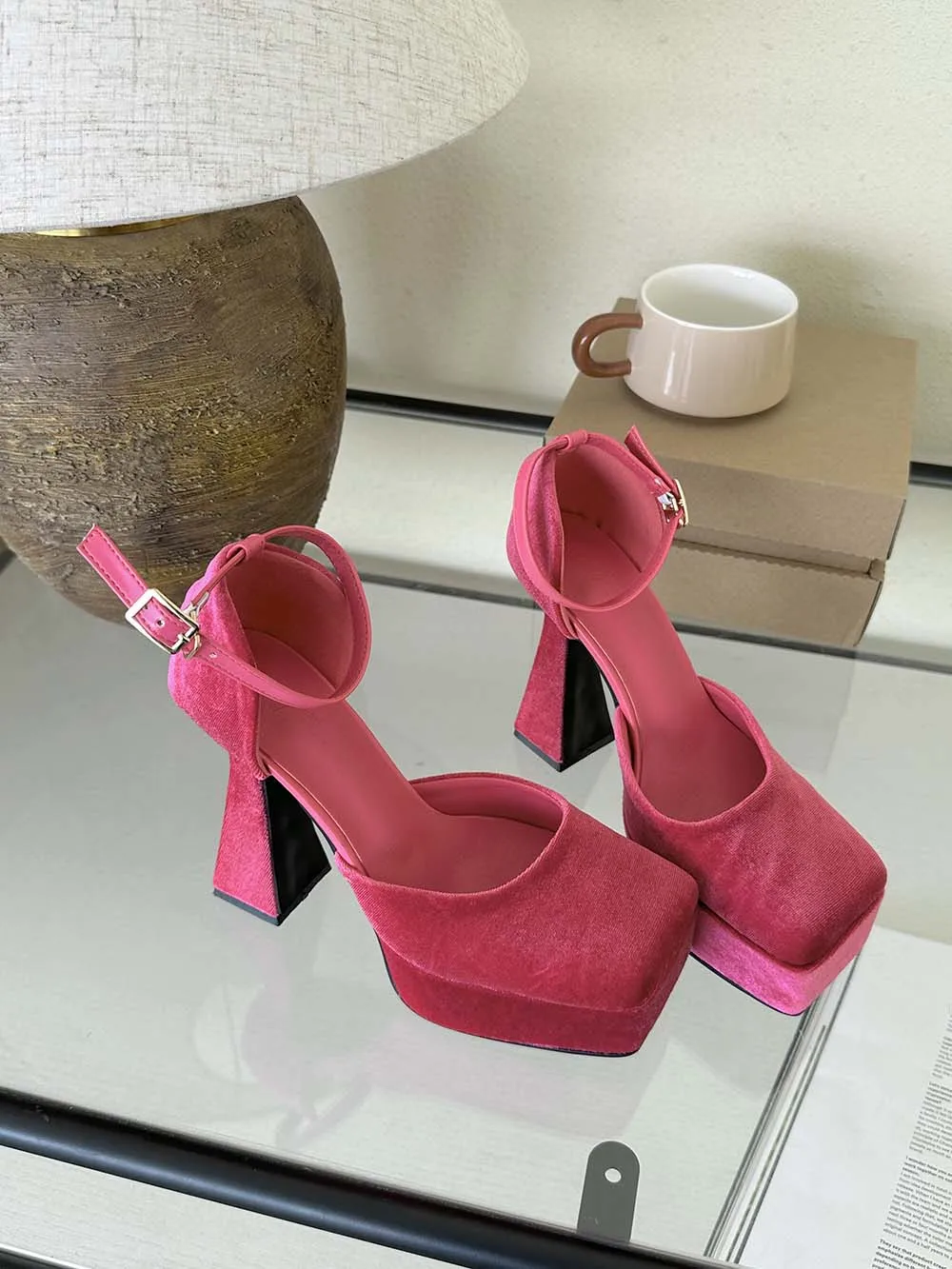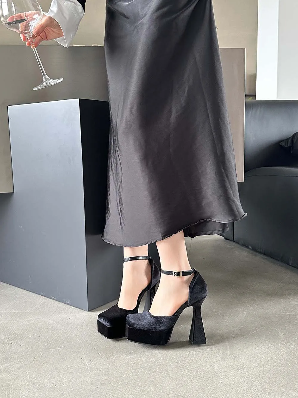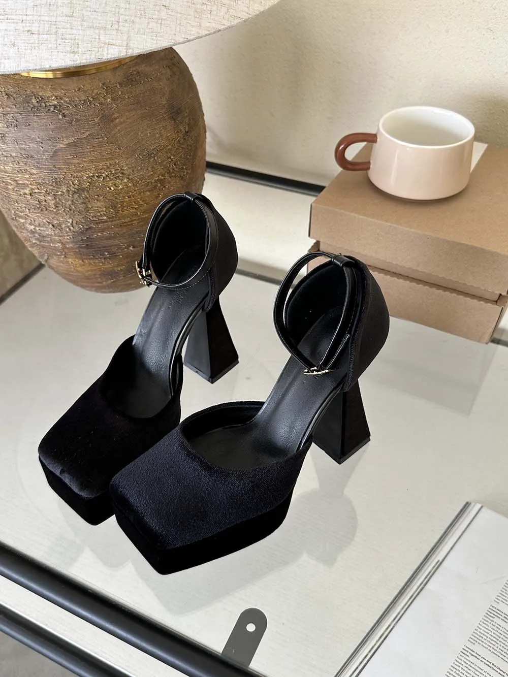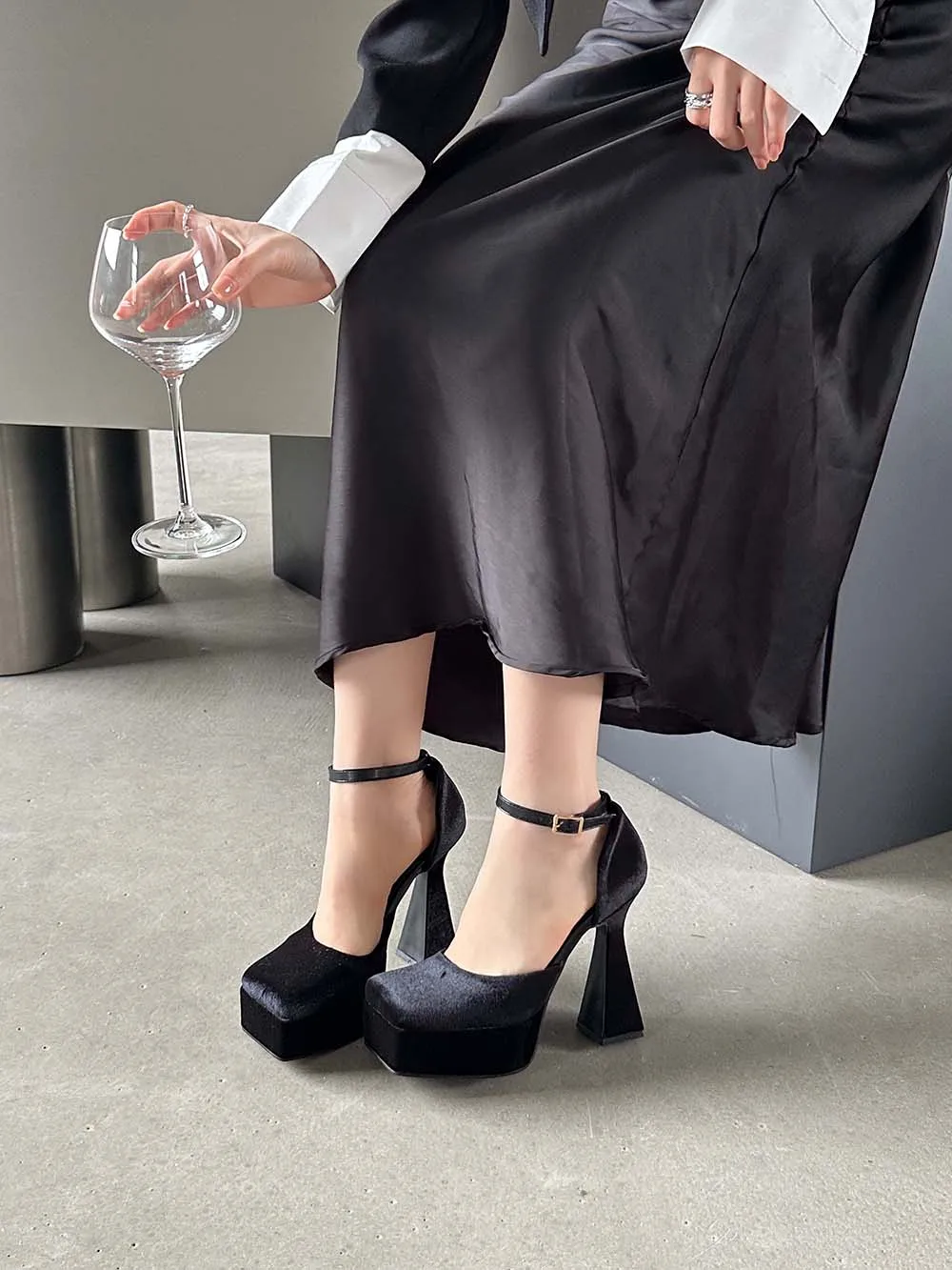 LBSFY - Square Toe Women Sandals Satin Summer Dress Shoes Wedding Pumps Thick High Heels Black Rose Grey Ankle Strap Party Pumps 35-39
