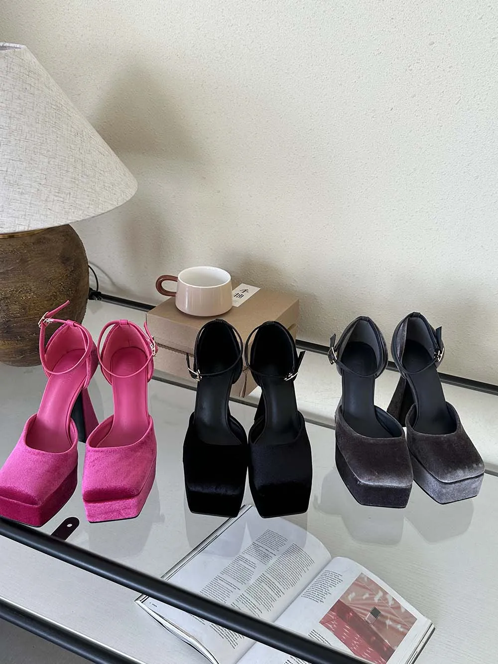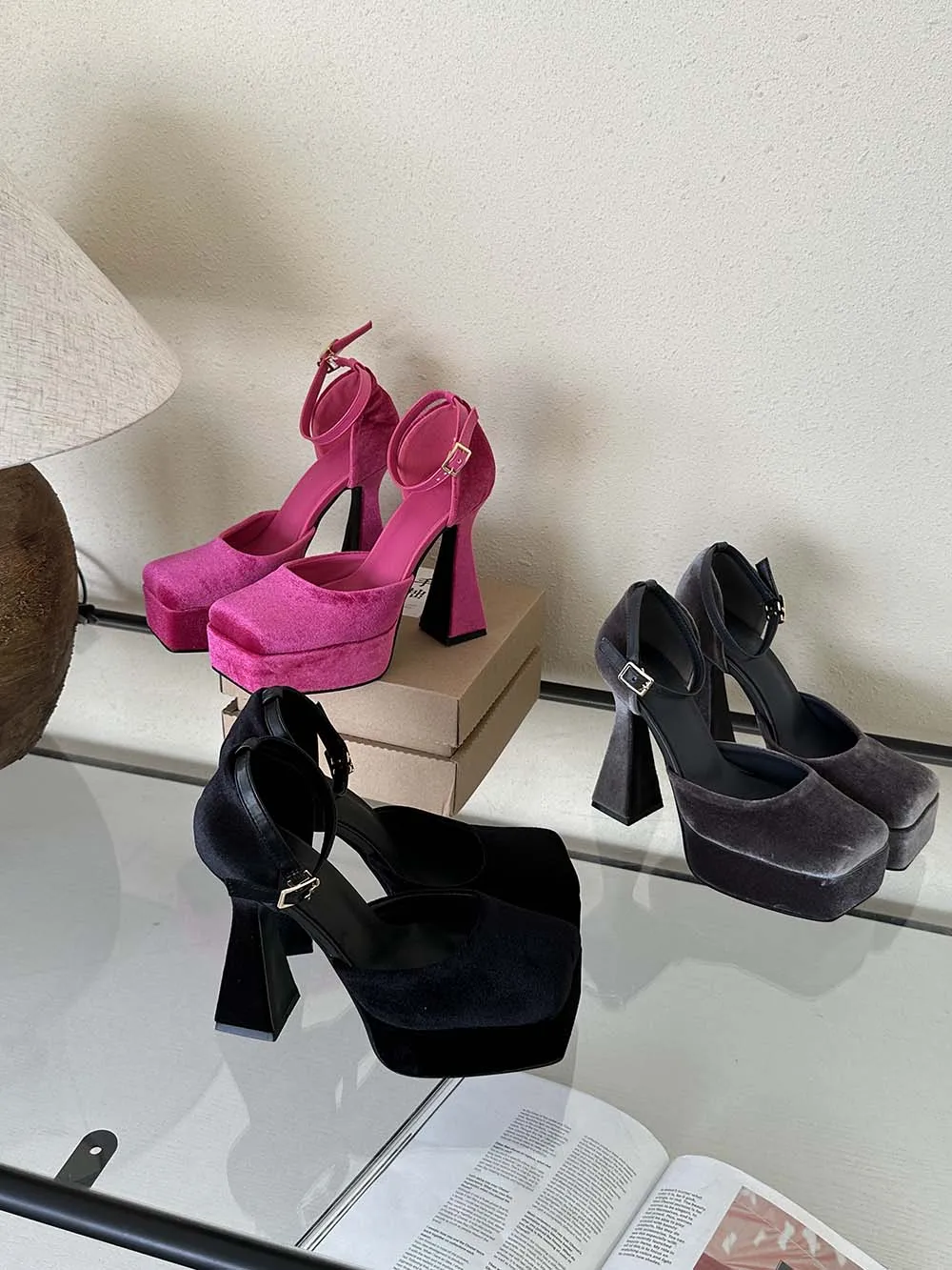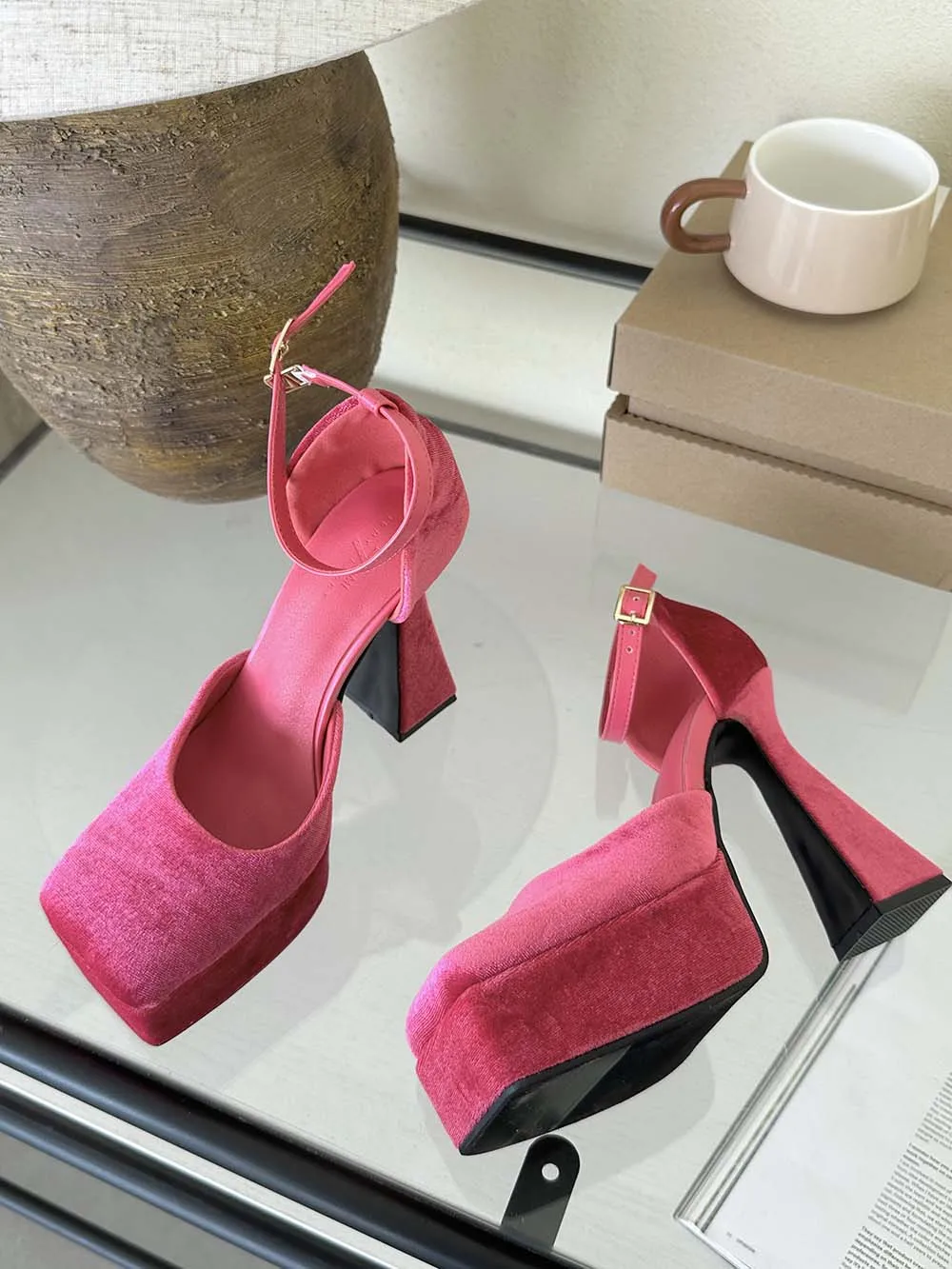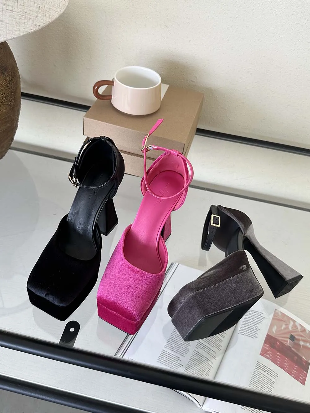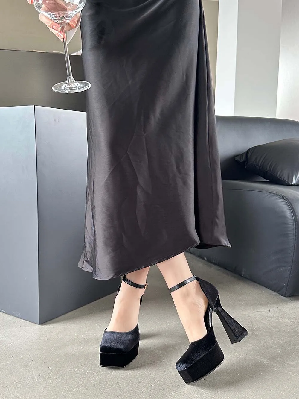 LBSFY - Square Toe Women Sandals Satin Summer Dress Shoes Wedding Pumps Thick High Heels Black Rose Grey Ankle Strap Party Pumps 35-39