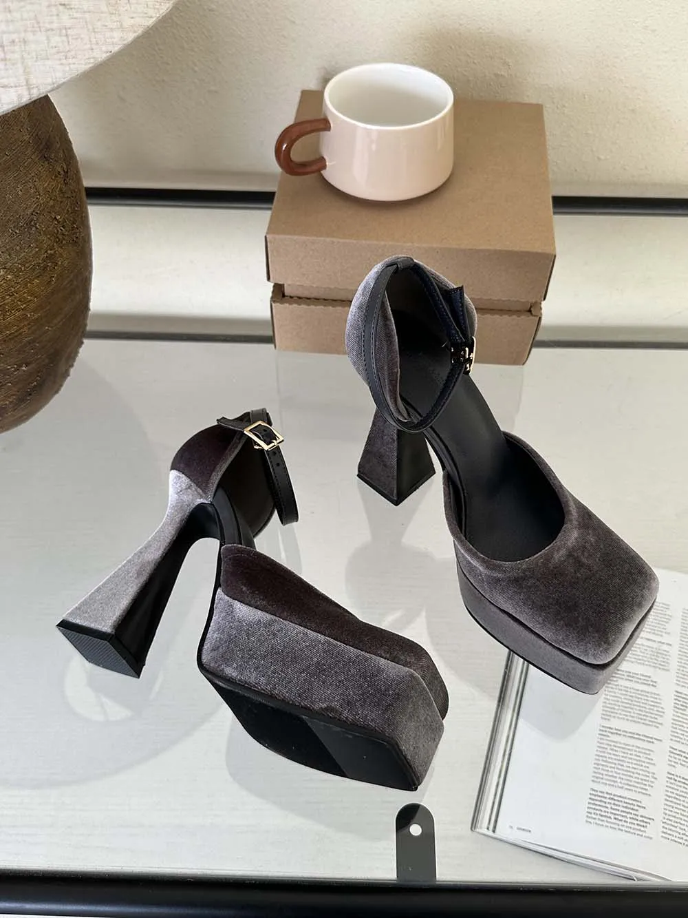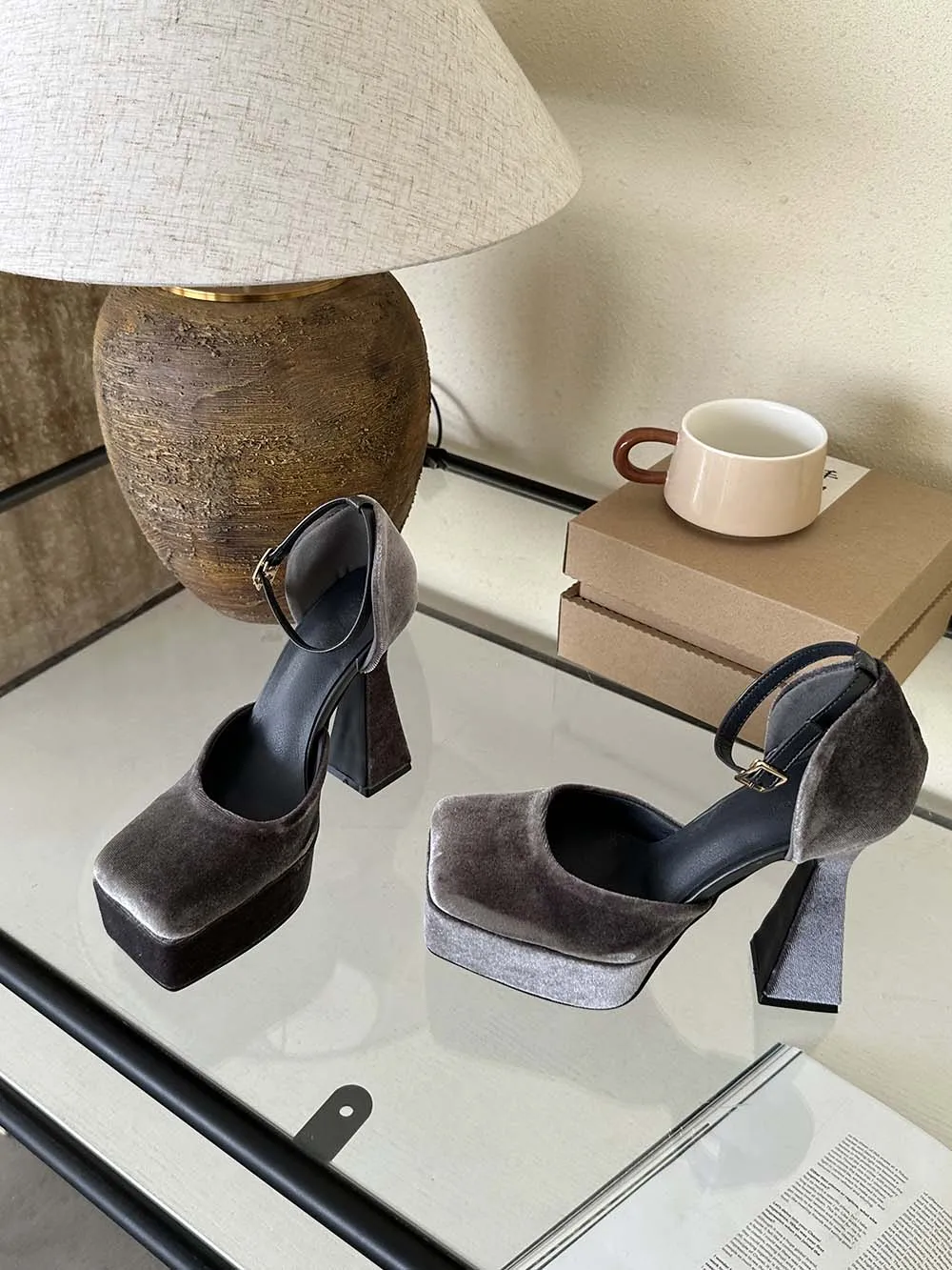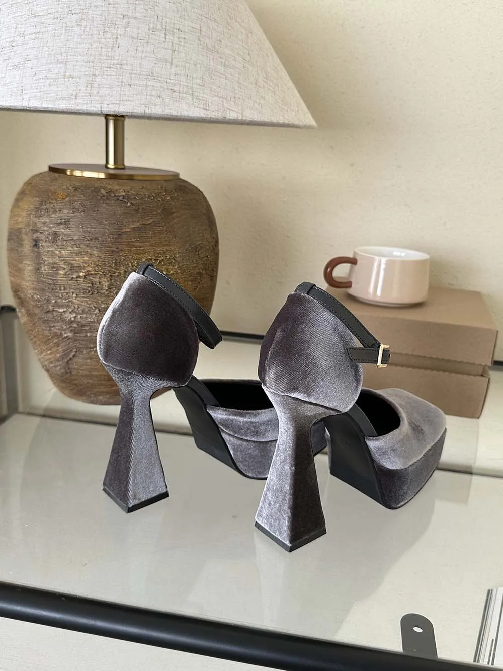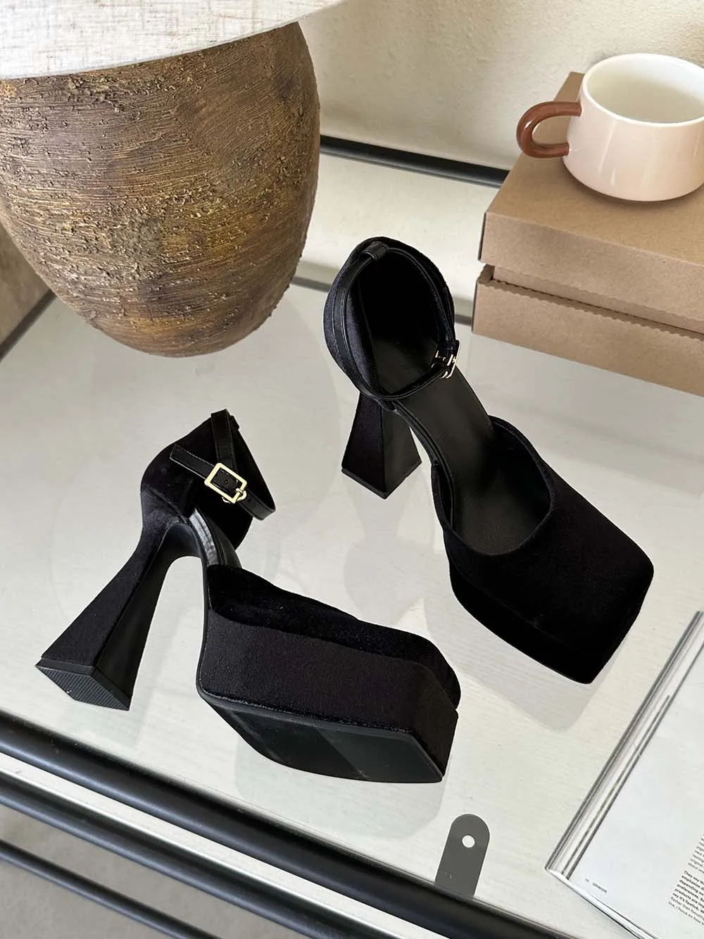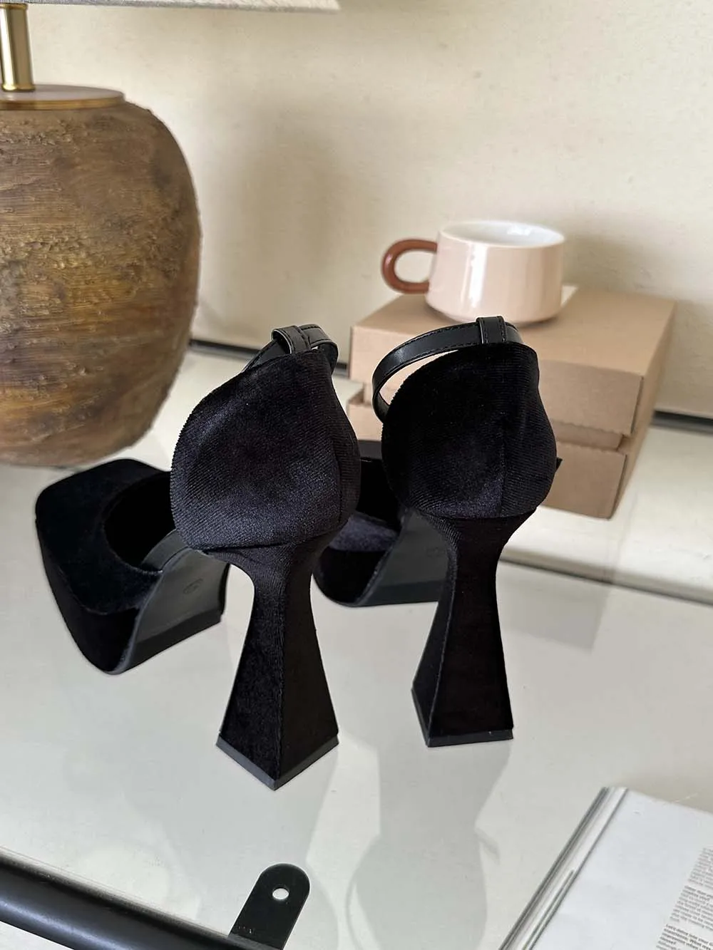 LBSFY - Square Toe Women Sandals Satin Summer Dress Shoes Wedding Pumps Thick High Heels Black Rose Grey Ankle Strap Party Pumps 35-39