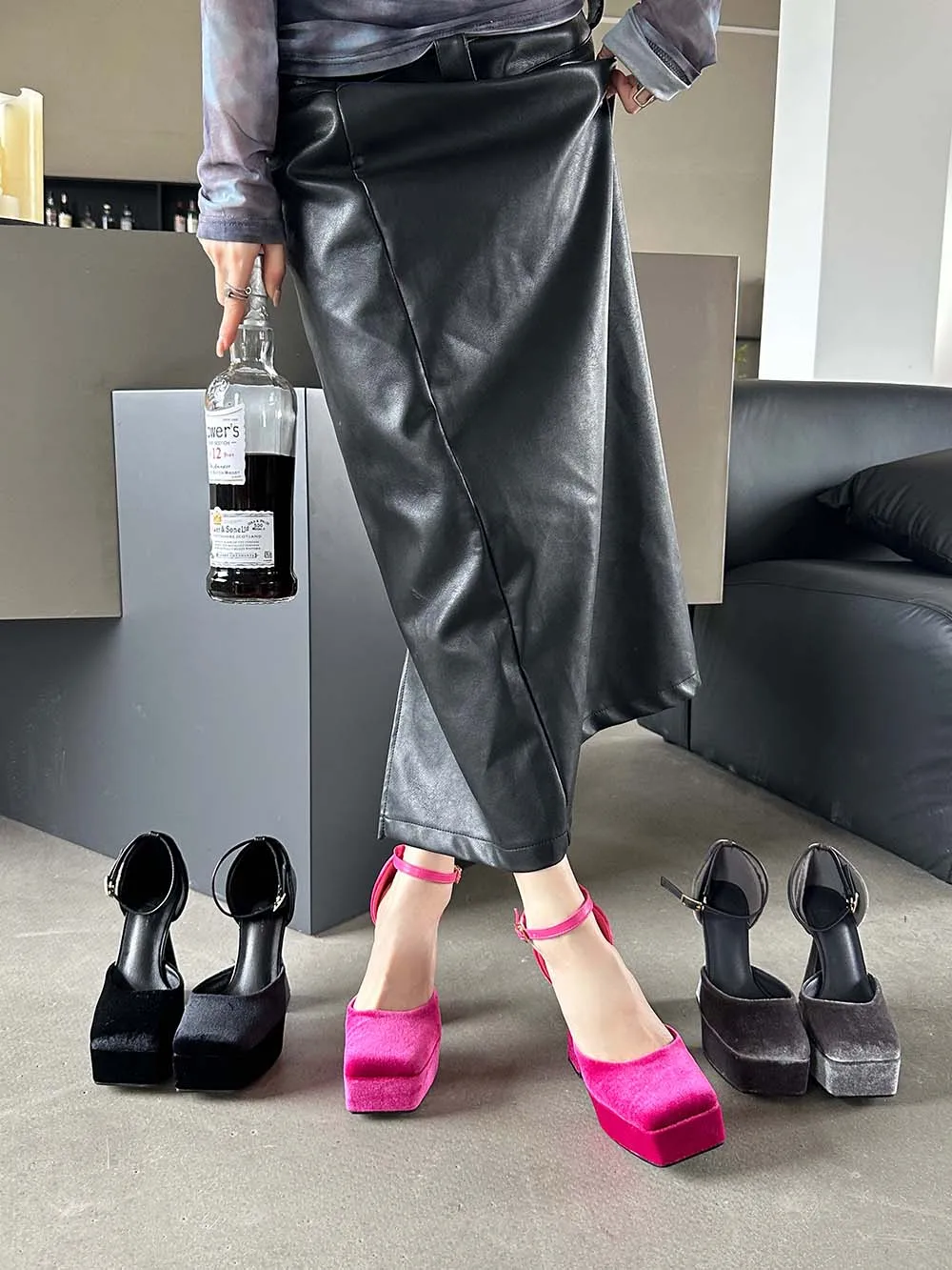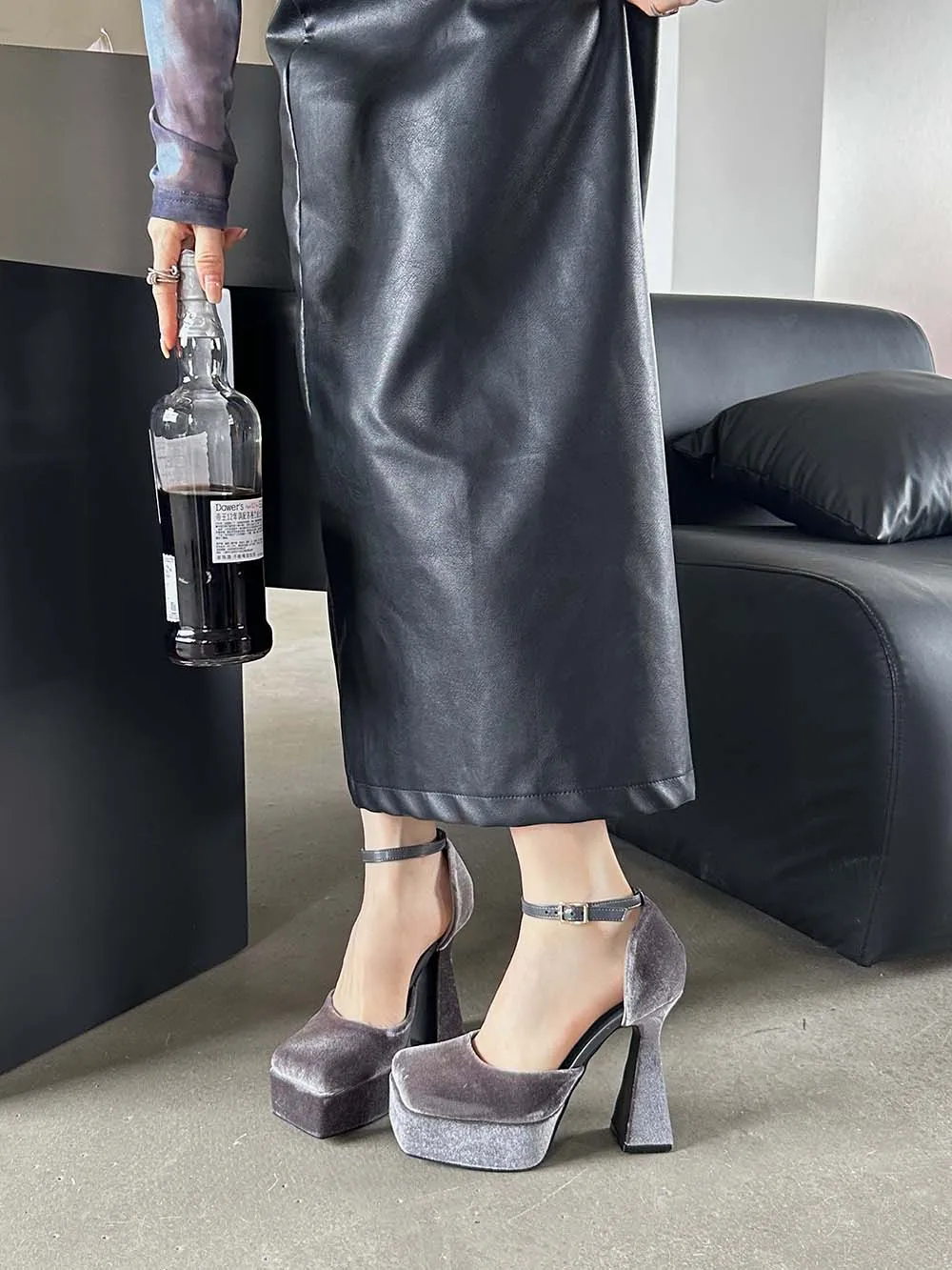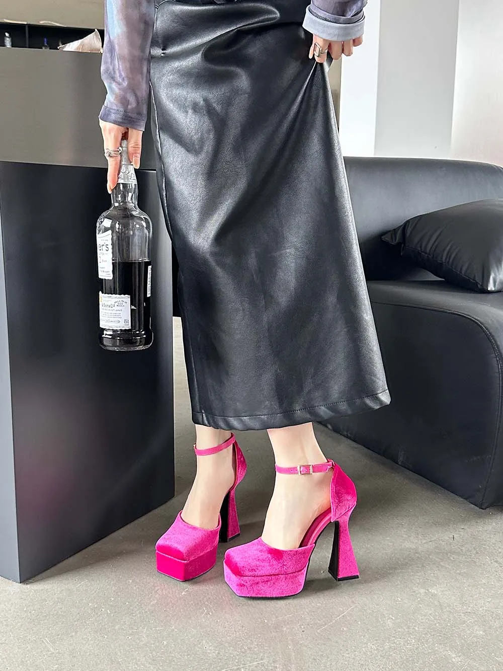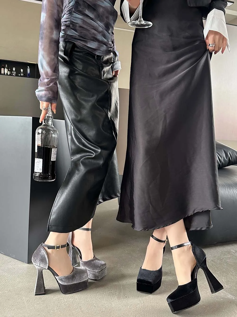 LBSFY - Square Toe Women Sandals Satin Summer Dress Shoes Wedding Pumps Thick High Heels Black Rose Grey Ankle Strap Party Pumps 35-39