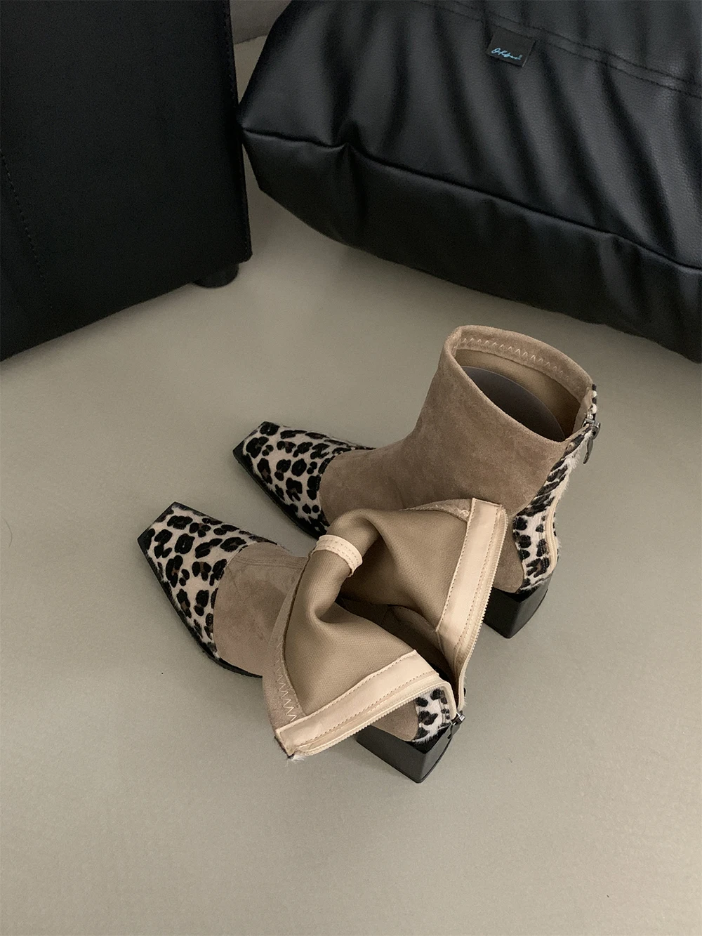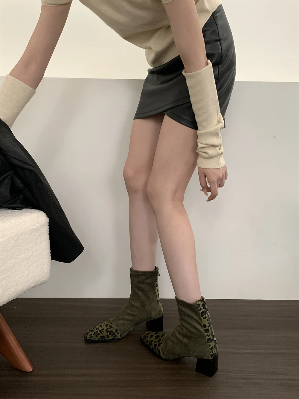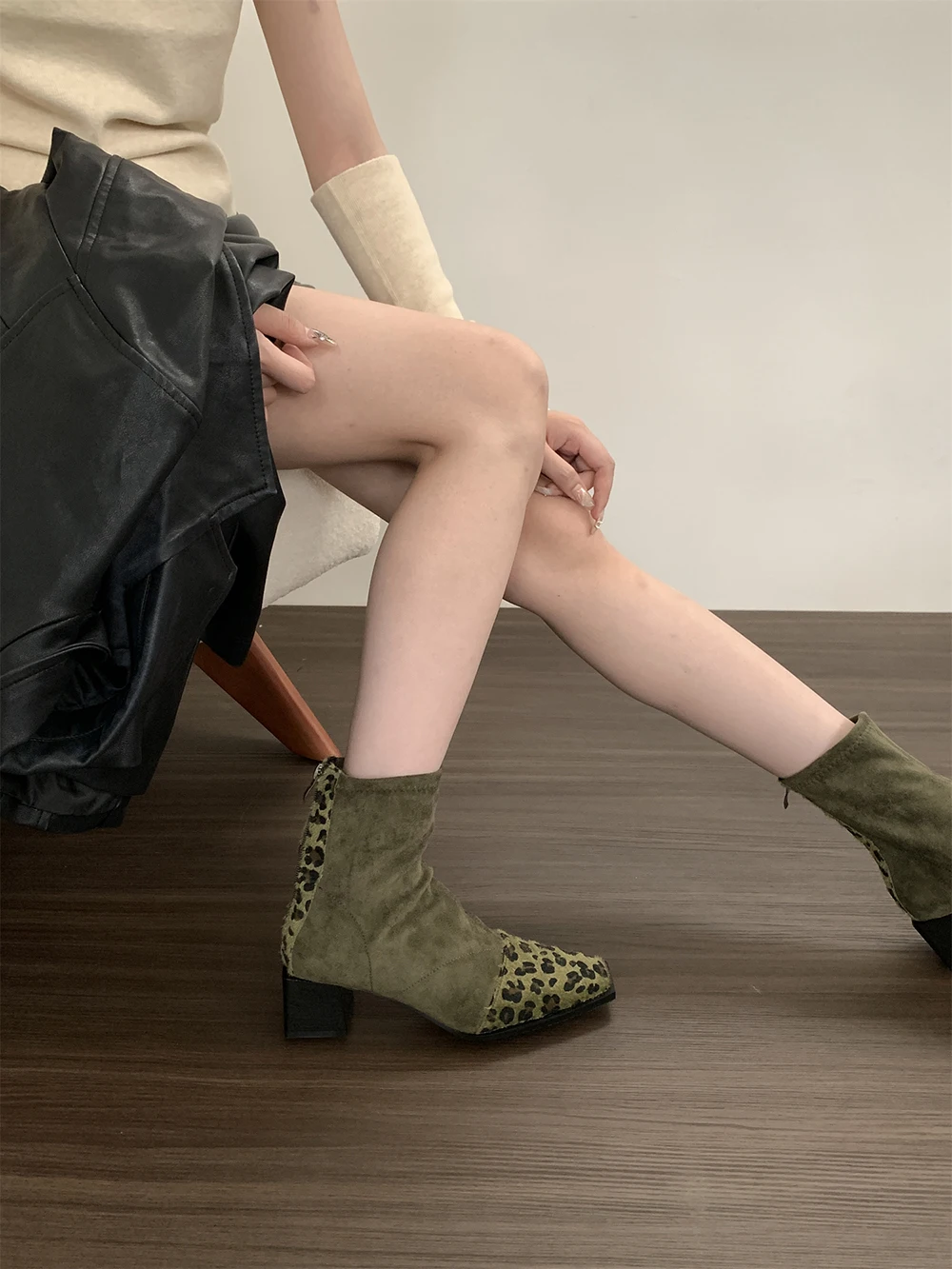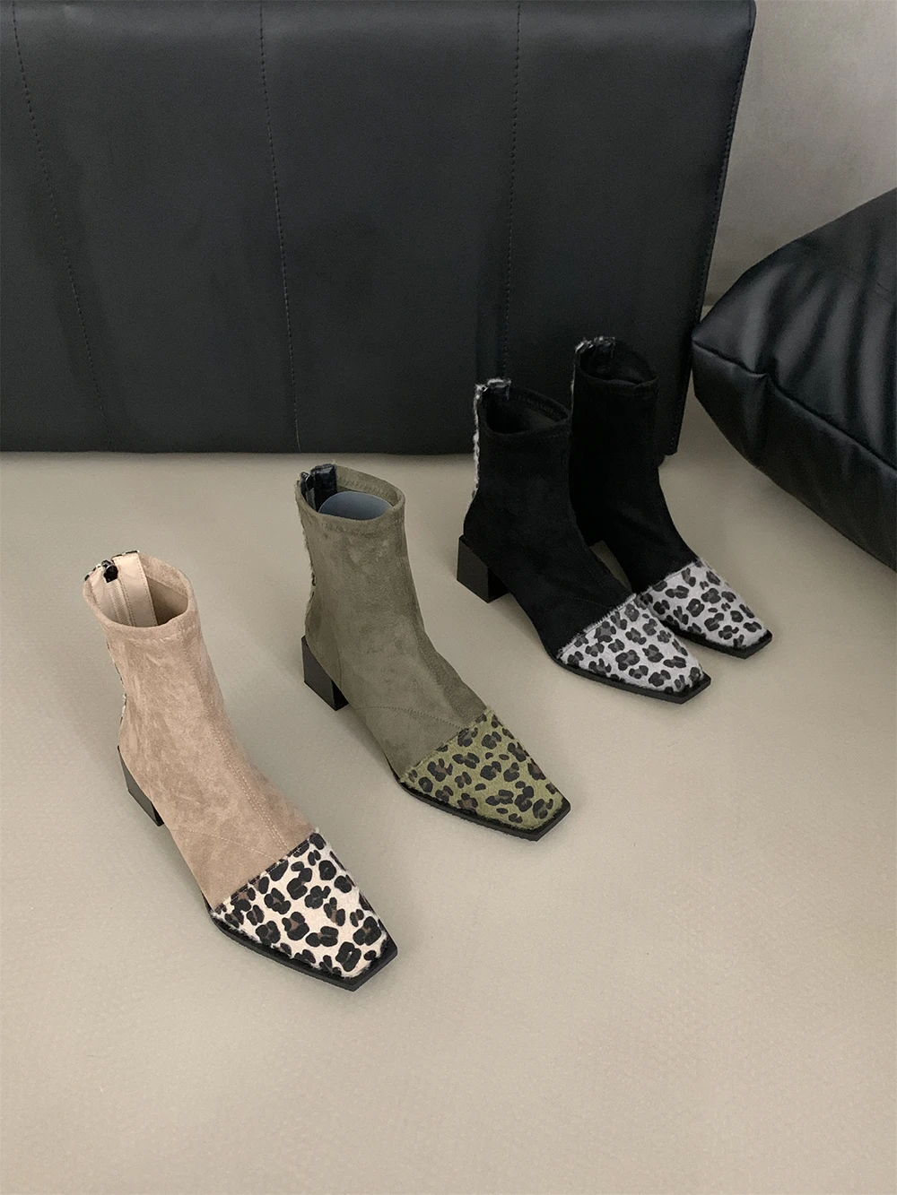 LBSFY - Square Toe Women Sock Boots Leopard Mixed Color Back Zipper Square Mid Heels Sock Bota Black Beige Green Dress Shoes Woman 39