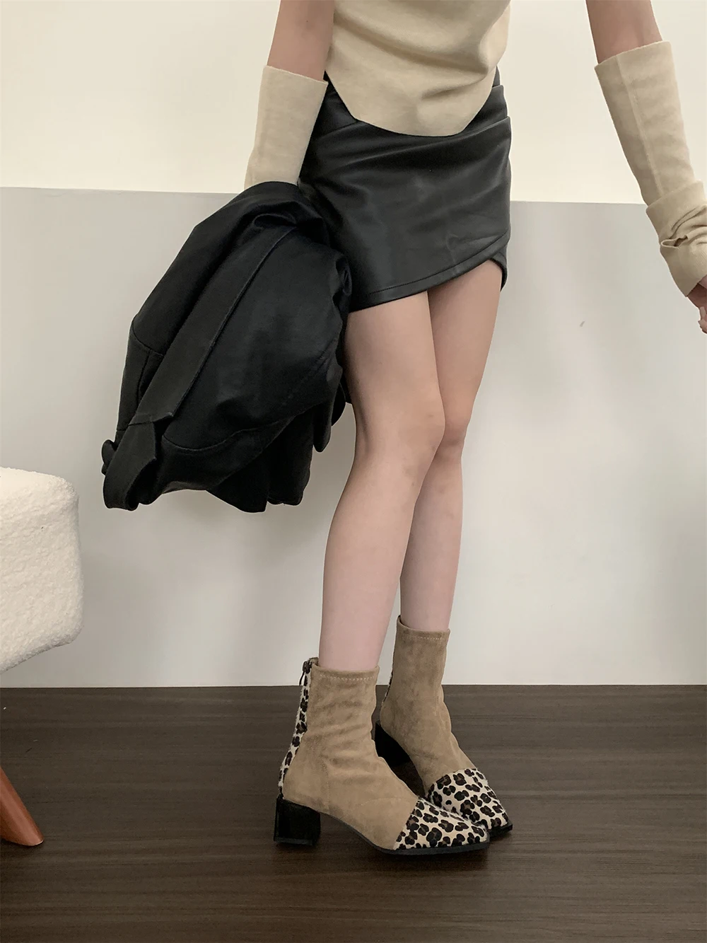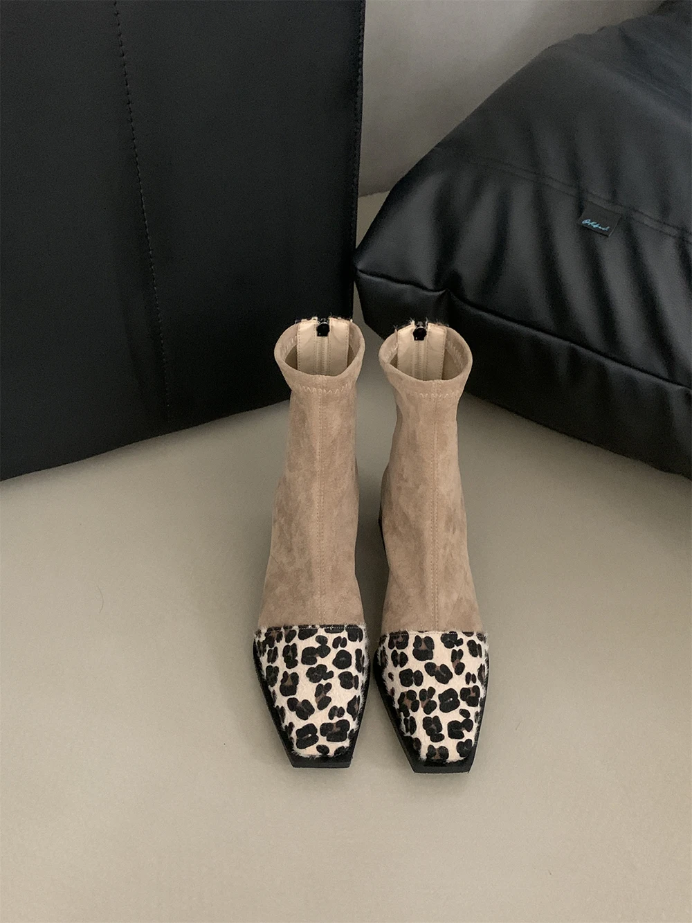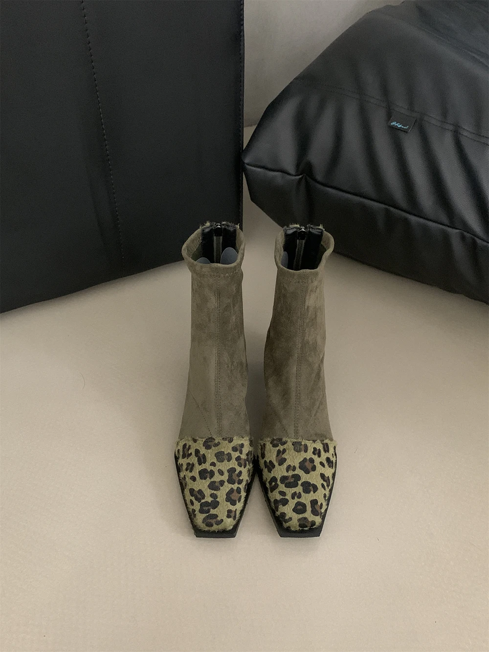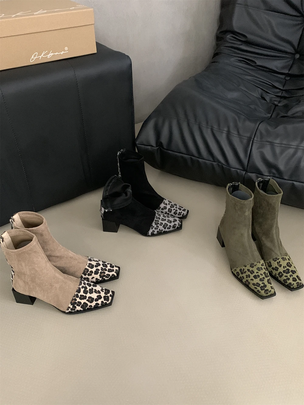 LBSFY - Square Toe Women Sock Boots Leopard Mixed Color Back Zipper Square Mid Heels Sock Bota Black Beige Green Dress Shoes Woman 39