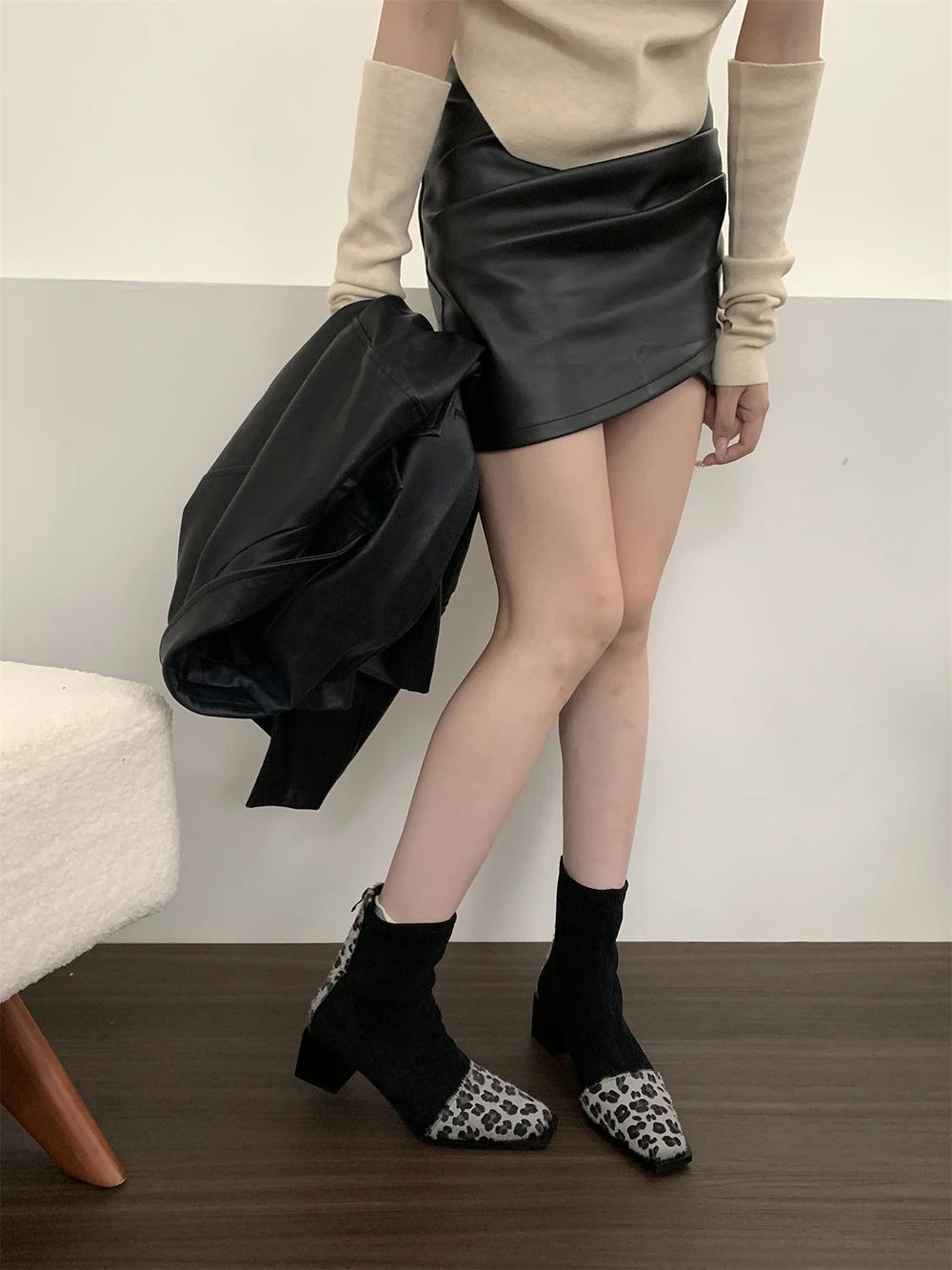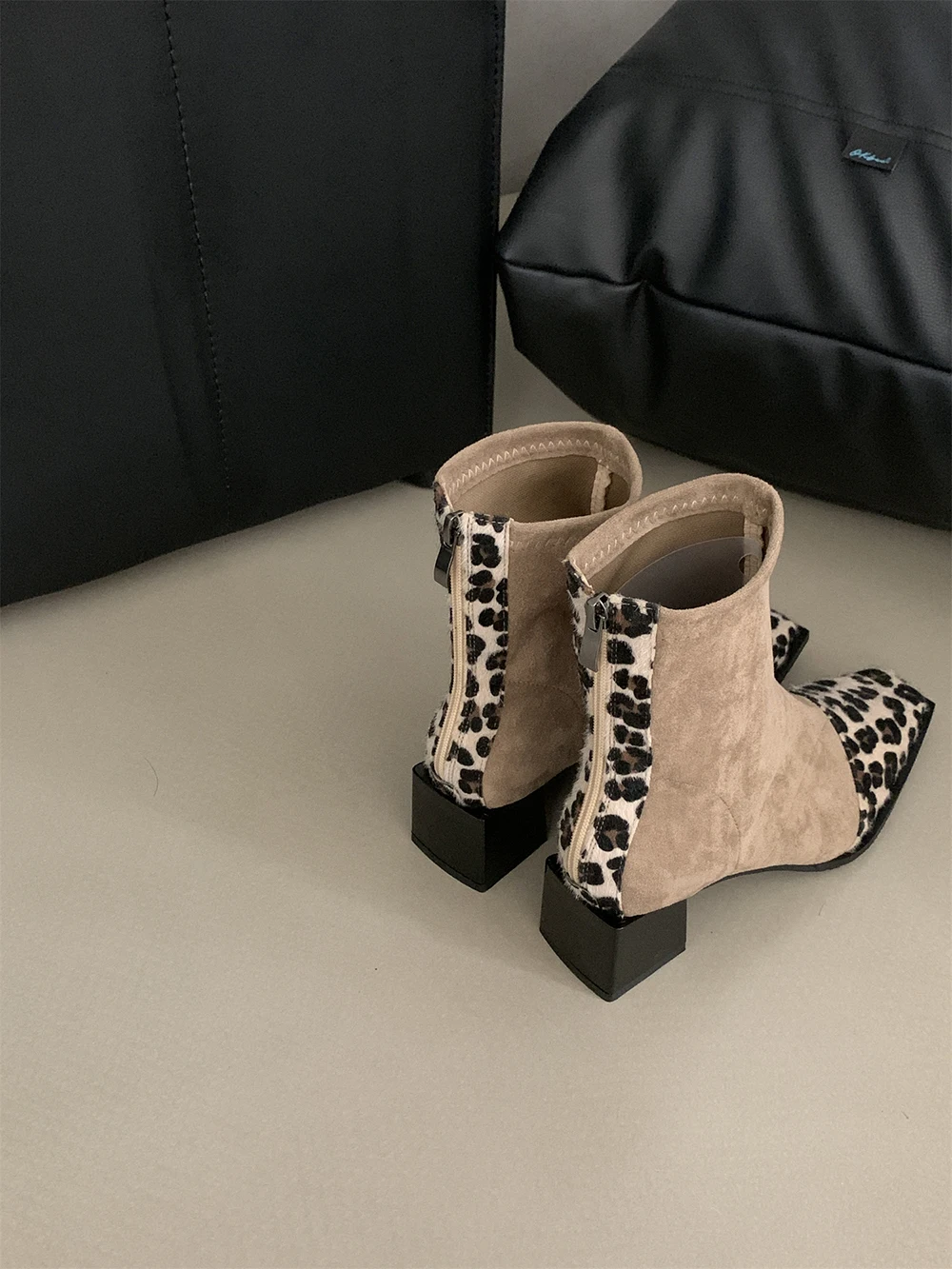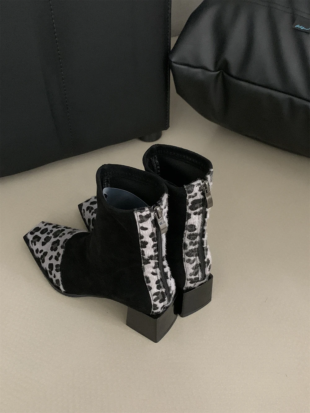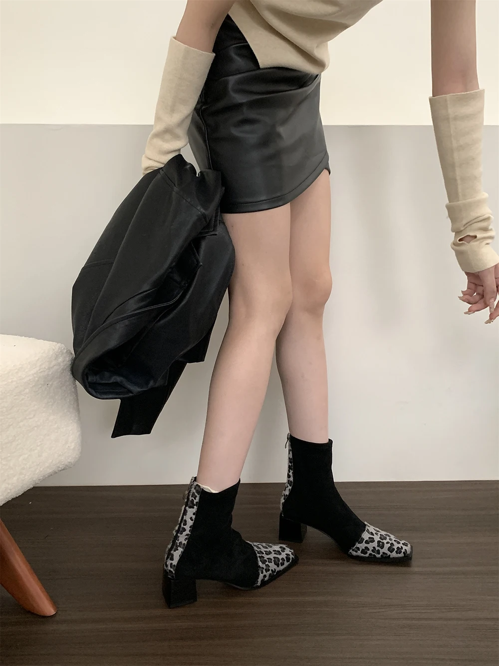 LBSFY - Square Toe Women Sock Boots Leopard Mixed Color Back Zipper Square Mid Heels Sock Bota Black Beige Green Dress Shoes Woman 39
