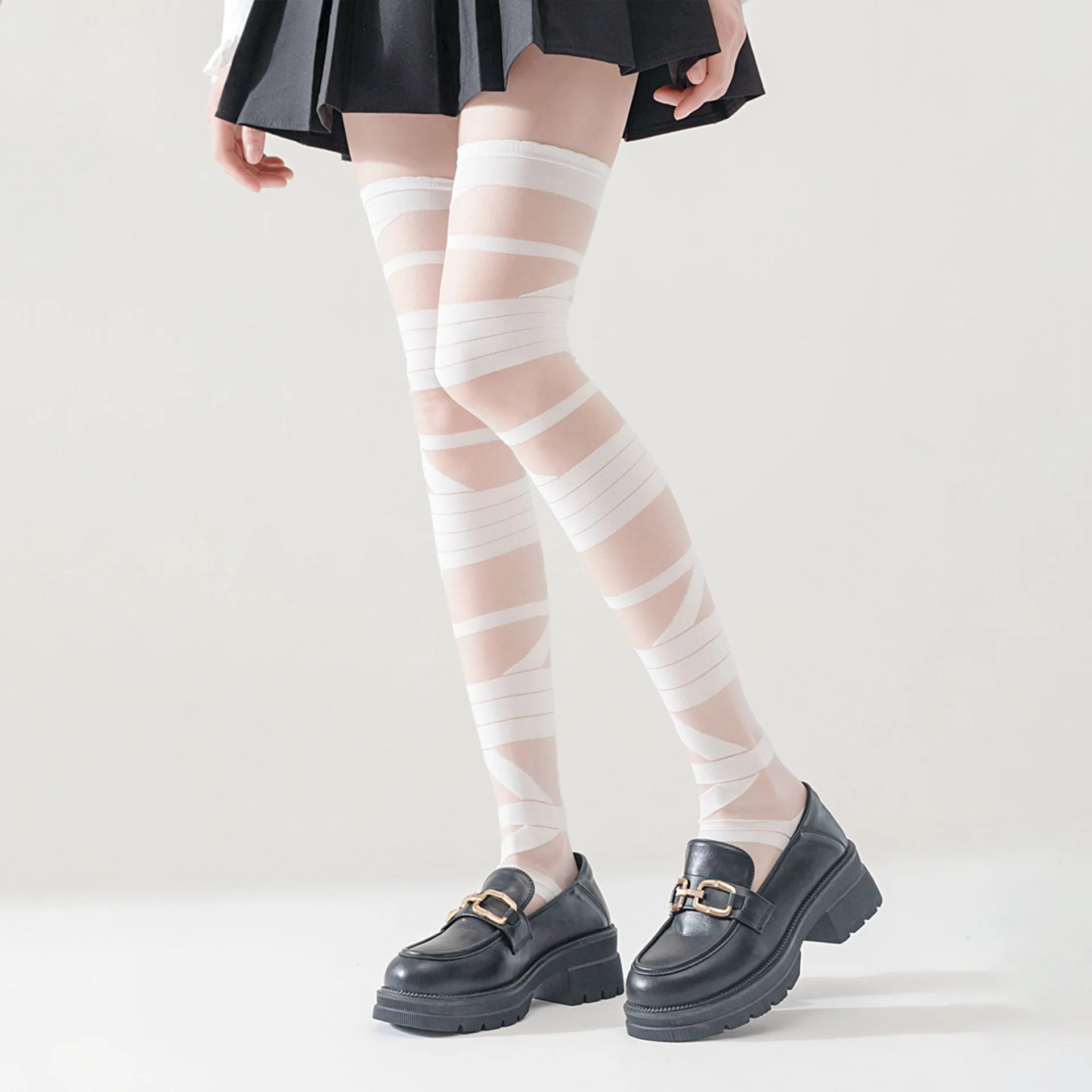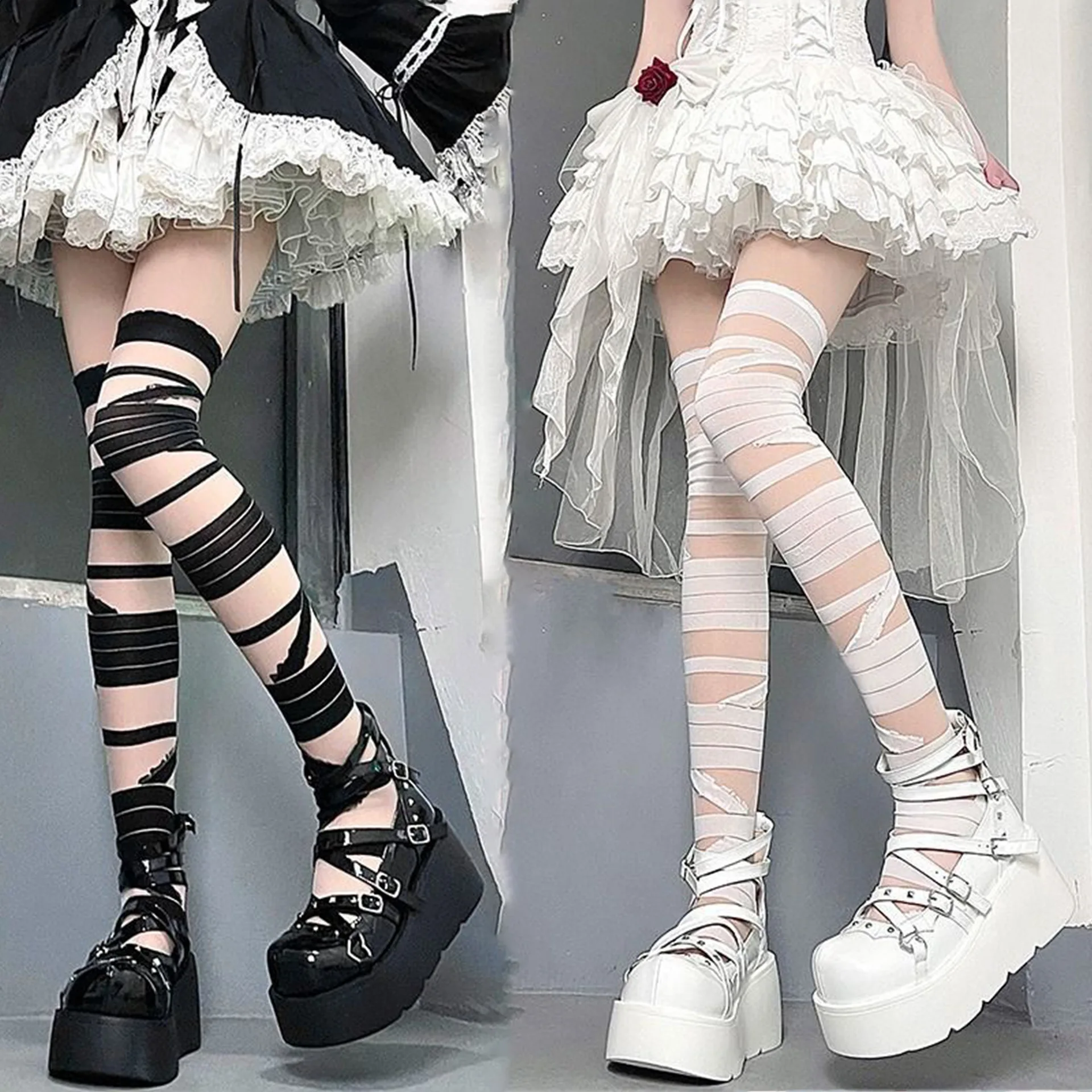 Lbsfy Stockings Women Thin Lolita Cute Girl Black Thigh High Socks Cross Bandage White Over the Knee Stockings