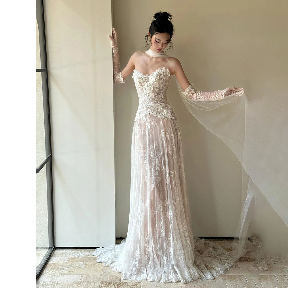 LBSFY -Strapless Wedding Dresses Sleeveless Luxury Lace Wedding Gown With Court Train Claccis A-line Brides Wedding Dresses Customized
