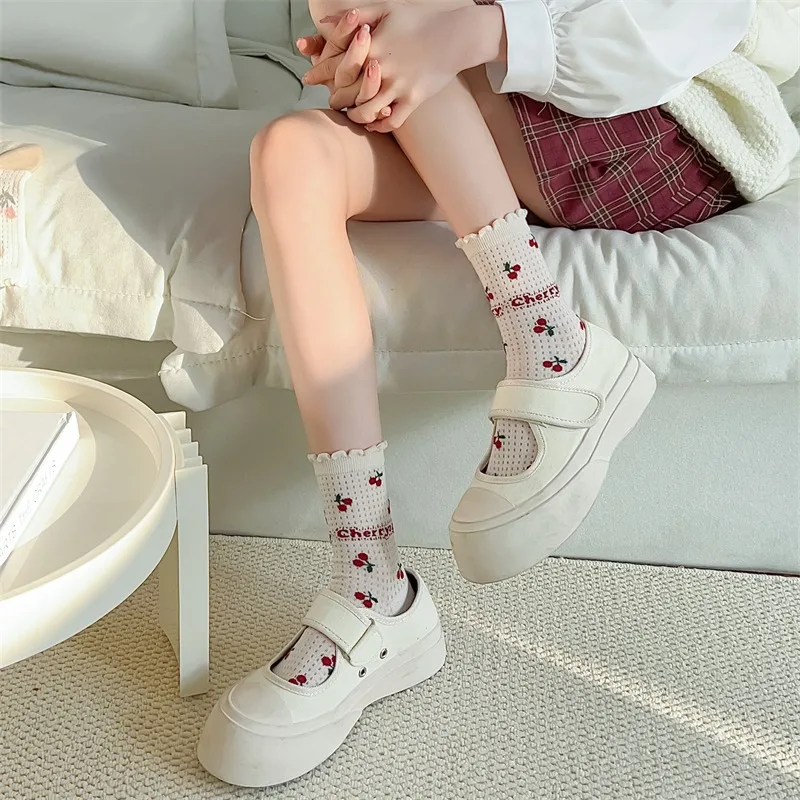 Lbsfy Summer Cherry Print Socks Female Thin Mesh Socks Students Girls Cute Kawaii Harajuku Socks For Girls Gift Streetwear Ruffle Soks