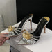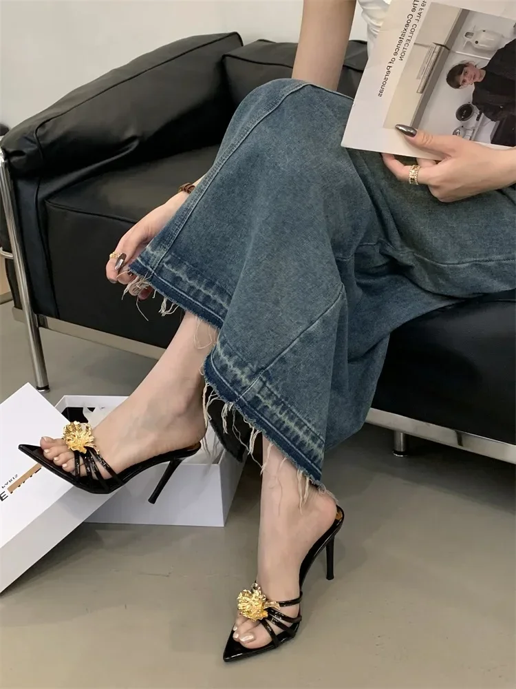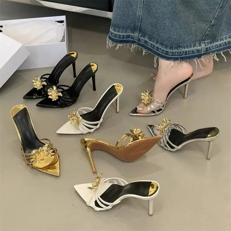LBSFY -Summer Design Metal Flower Narrow Band Pointed Toe Women Slippers Thin Heels Party Prom Slide Shoes Zapatillas De Mujer