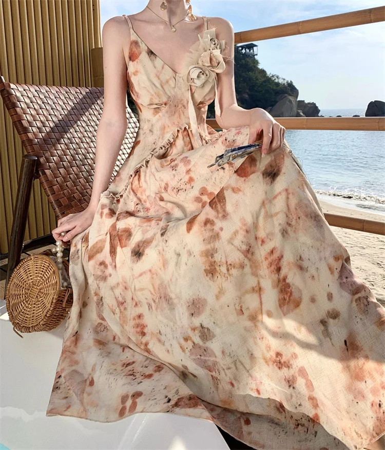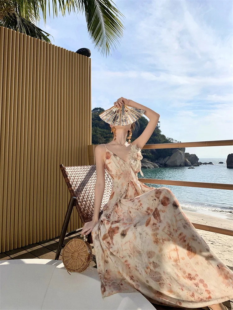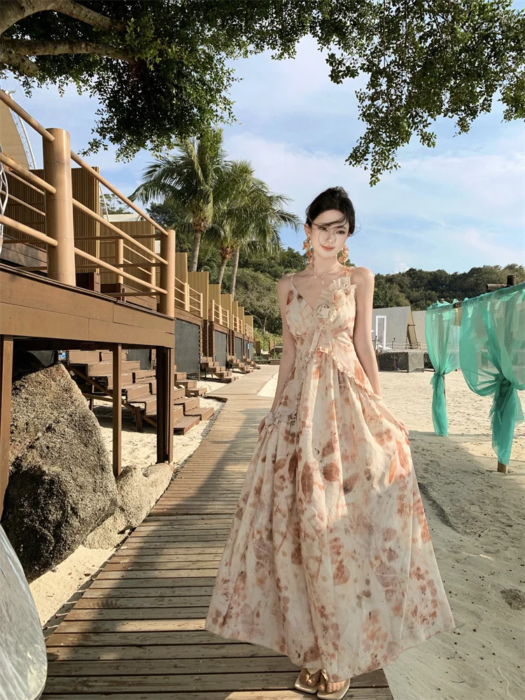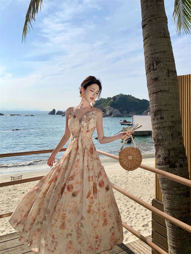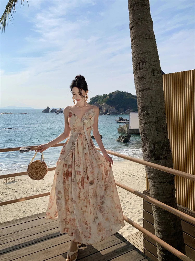 LBSFY -Summer Elegant Vintage Fashion Print Long Women's Dresses 2025 New French Party V-Neck Dress Casual Holiday Beach Fairy Vestidos