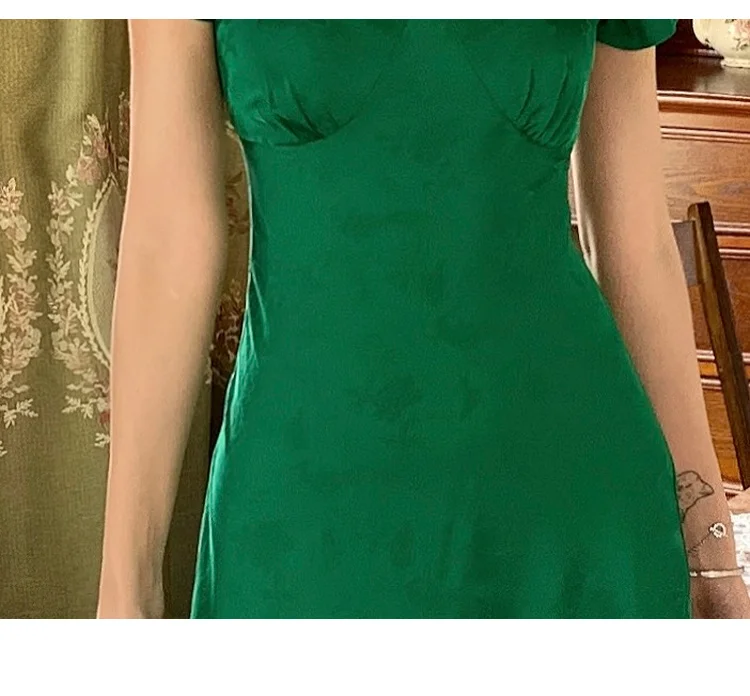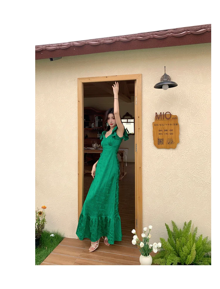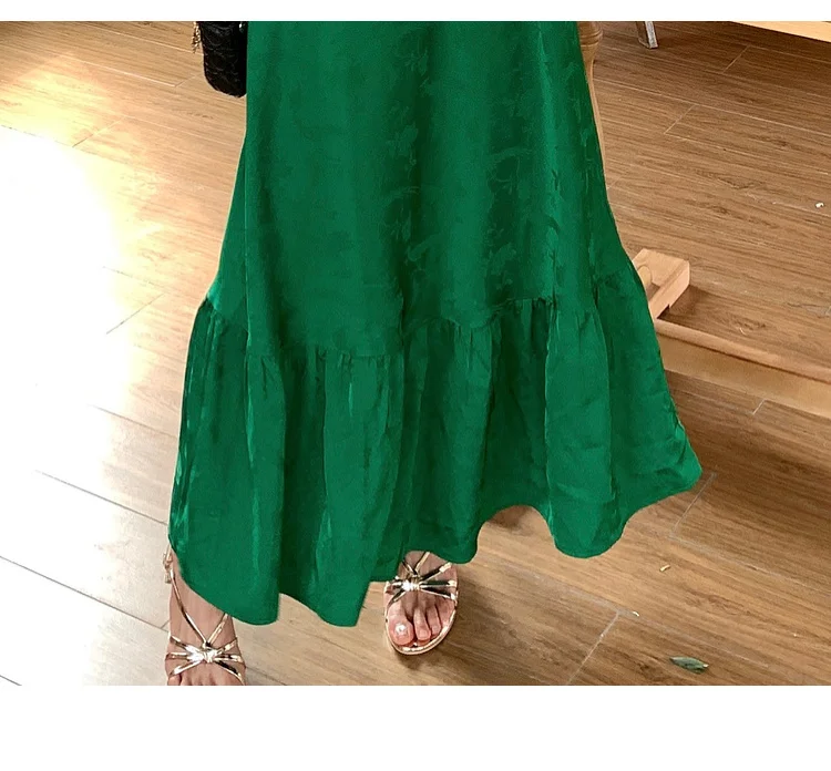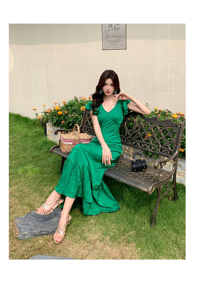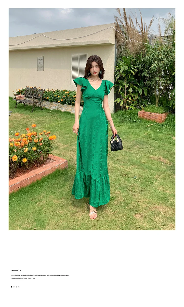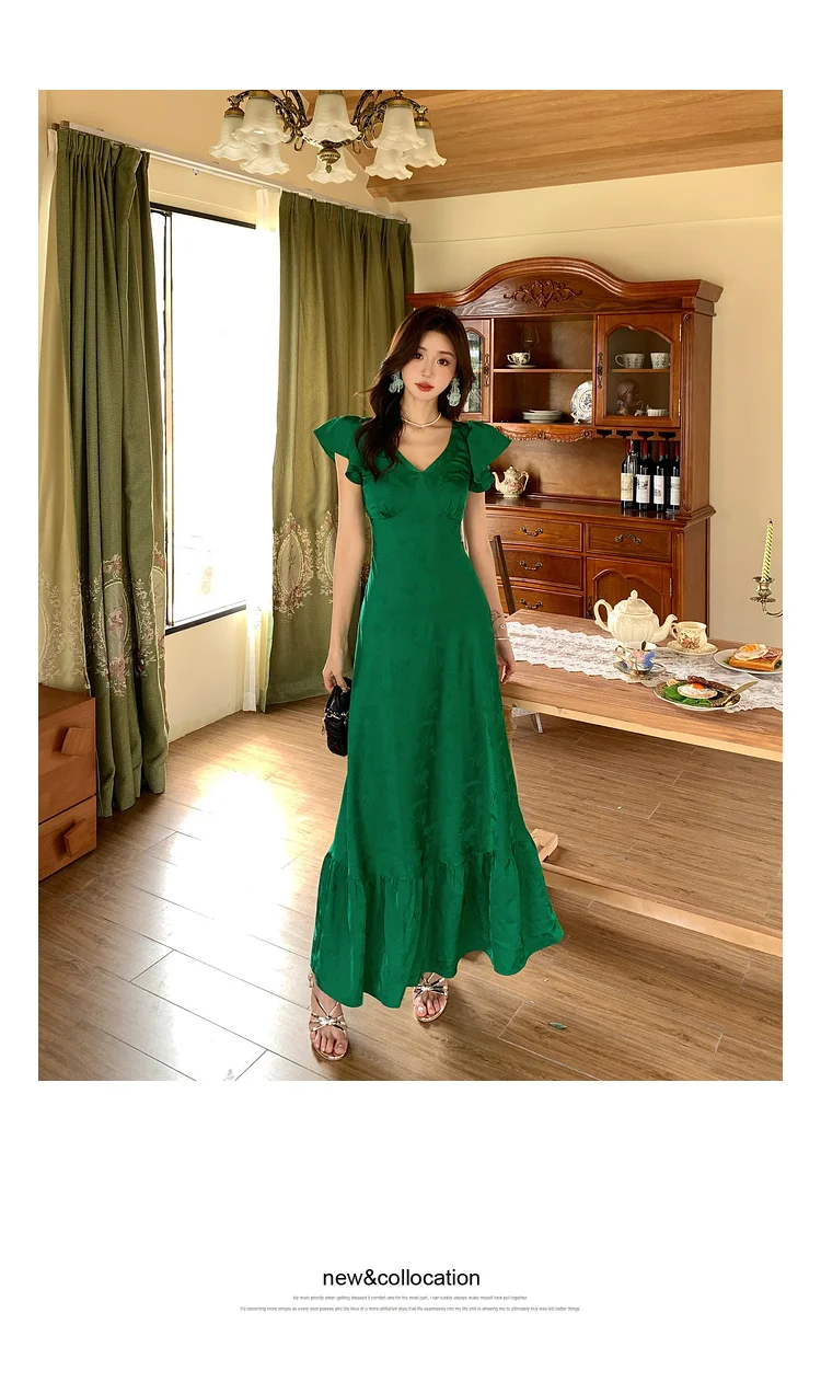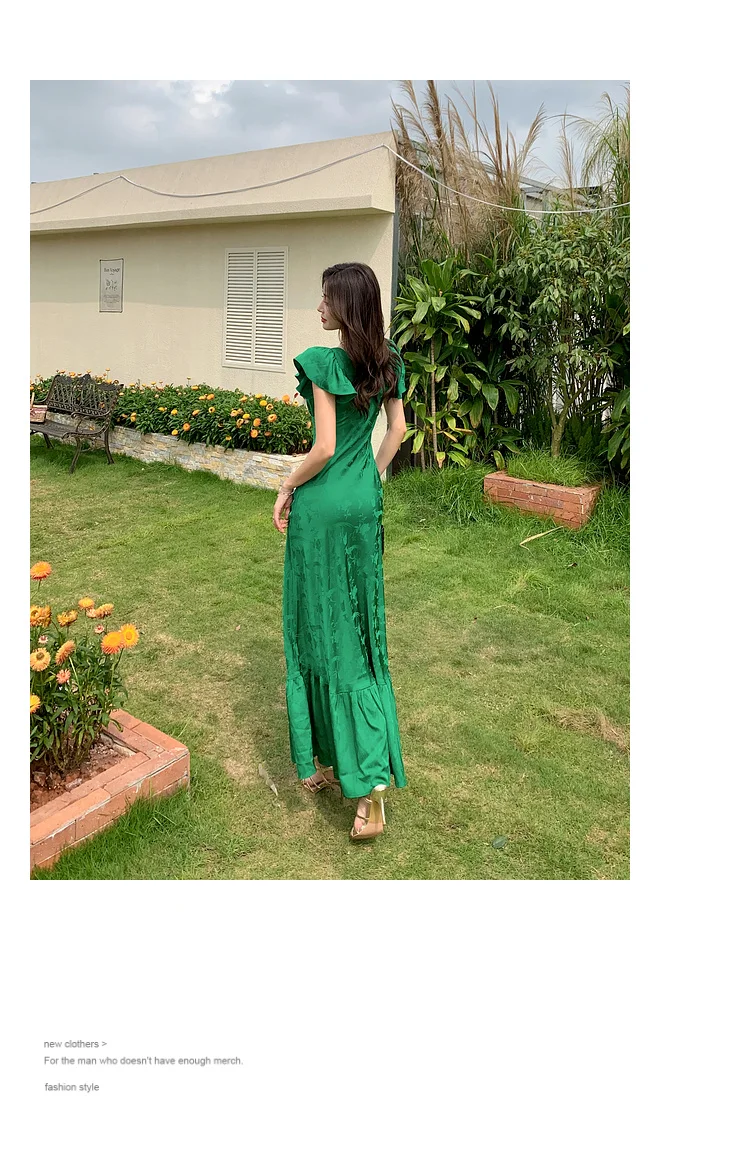LBSFY -Summer French Vintage Ruffles Satin Women's Long Dresses Green Waist Print V-Neck Flying Sleeves Dress Fashion New Vestidos