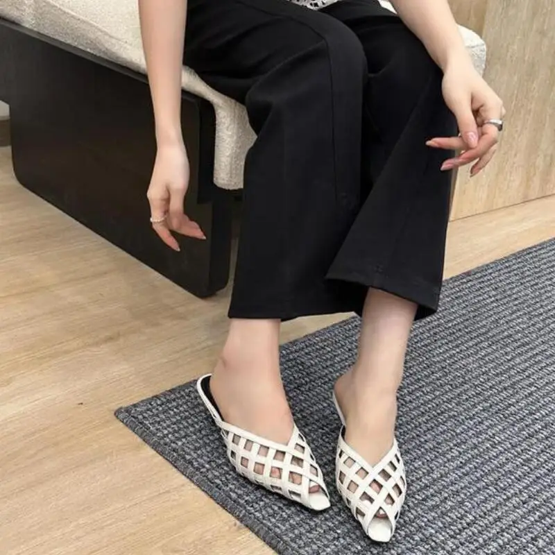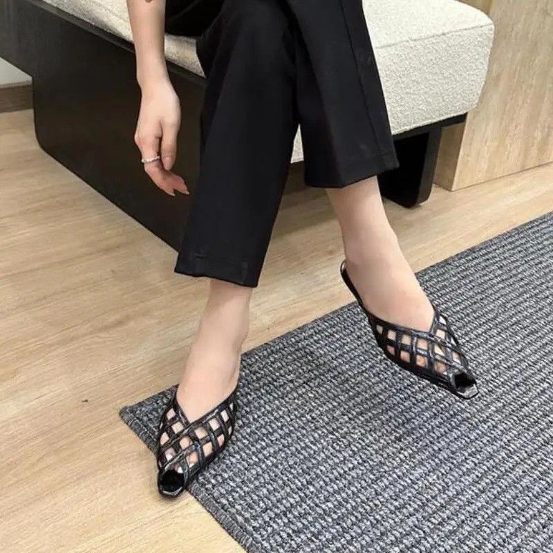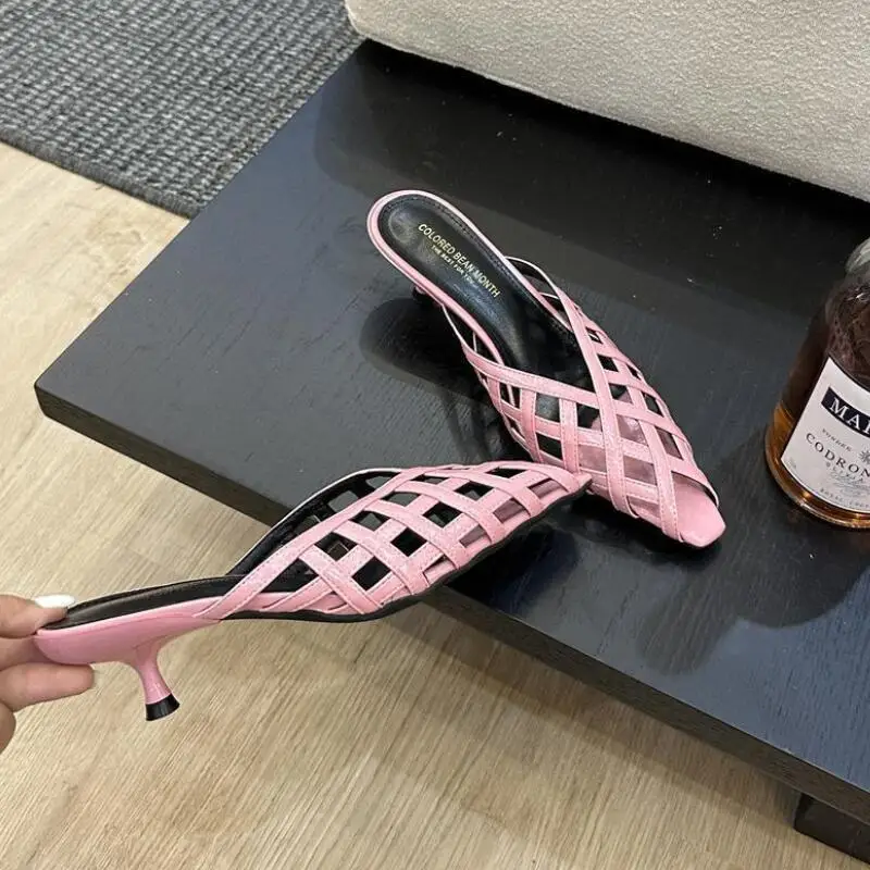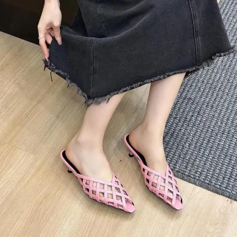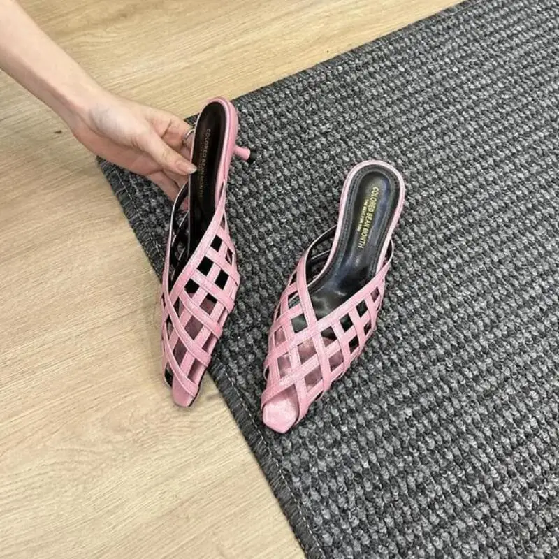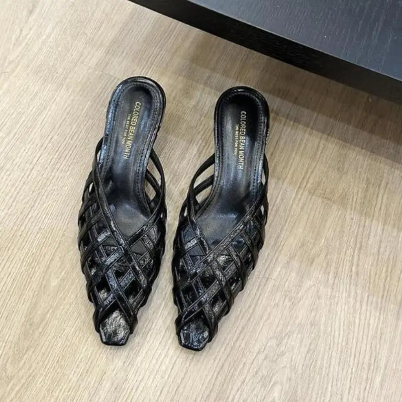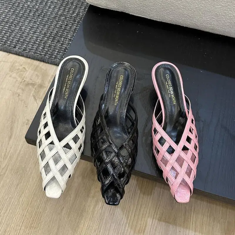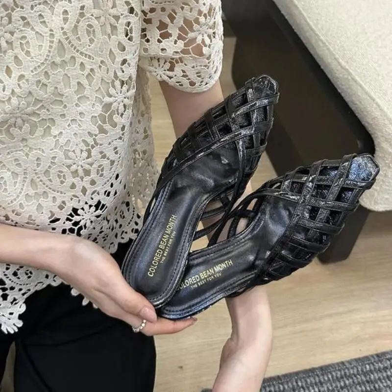 LBSFY - Summer New Hollow Out Slipper Women Fashion Weave Open Toe Sandal Slip On Ladies Casual Shoes Mid Heel Outdoor Dress Mules