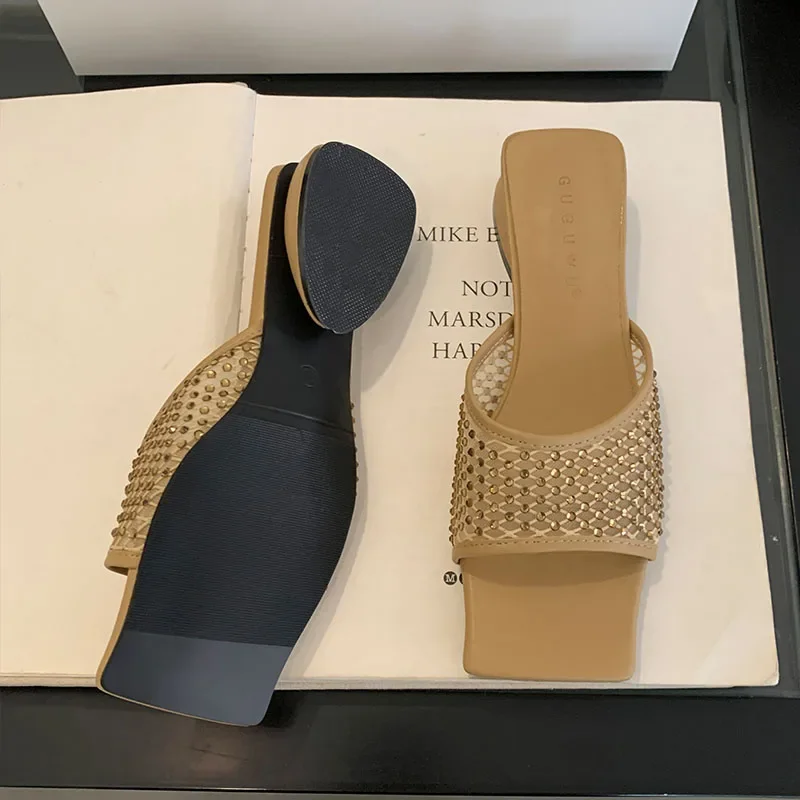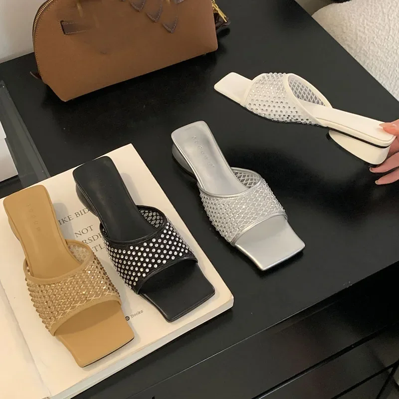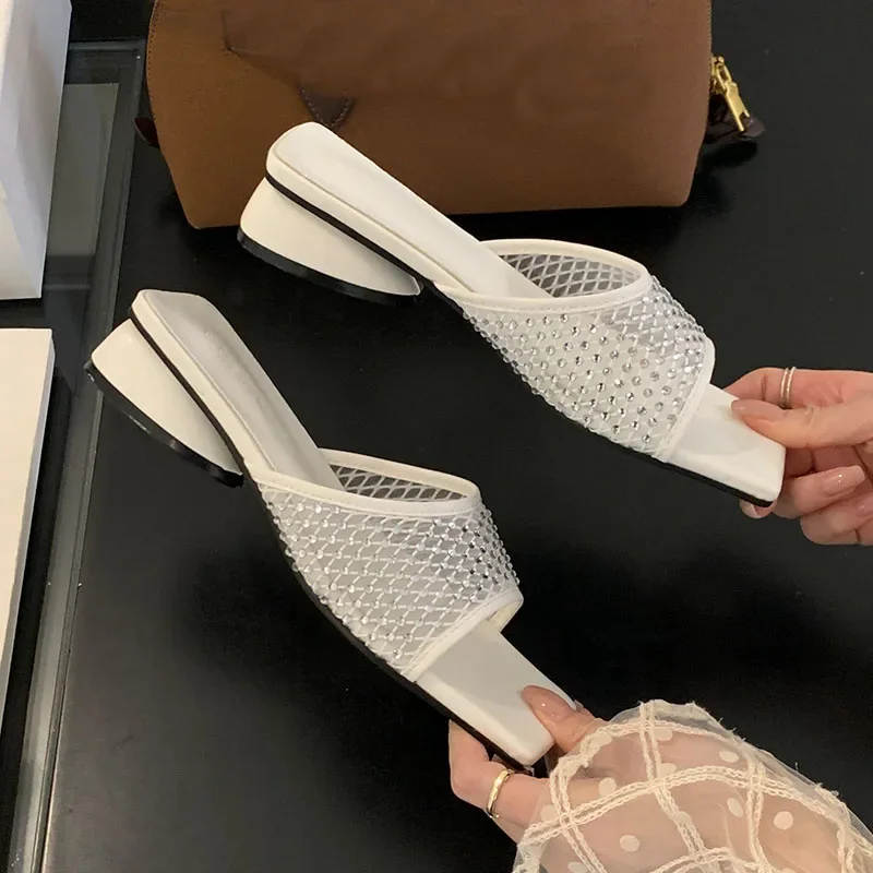 Lbsfy Summer NEW Mesh Breathable Slippers Women Rhinestone Square Toe Slides Female Footwear Fashion Sandals Ladies Zapatos De Mujer