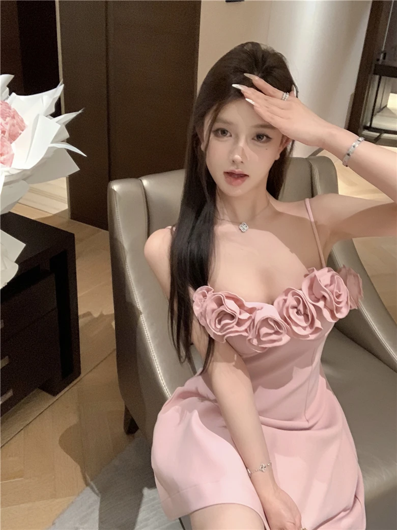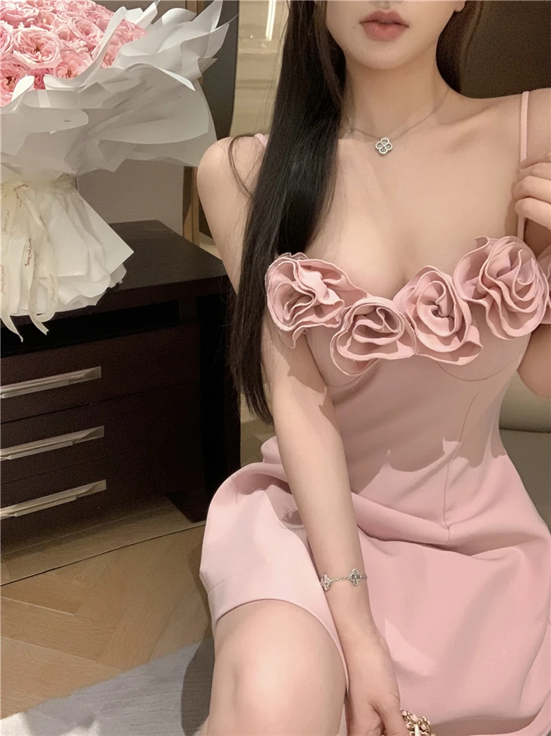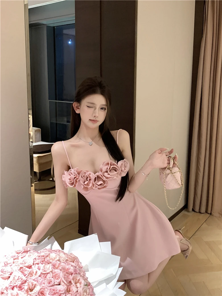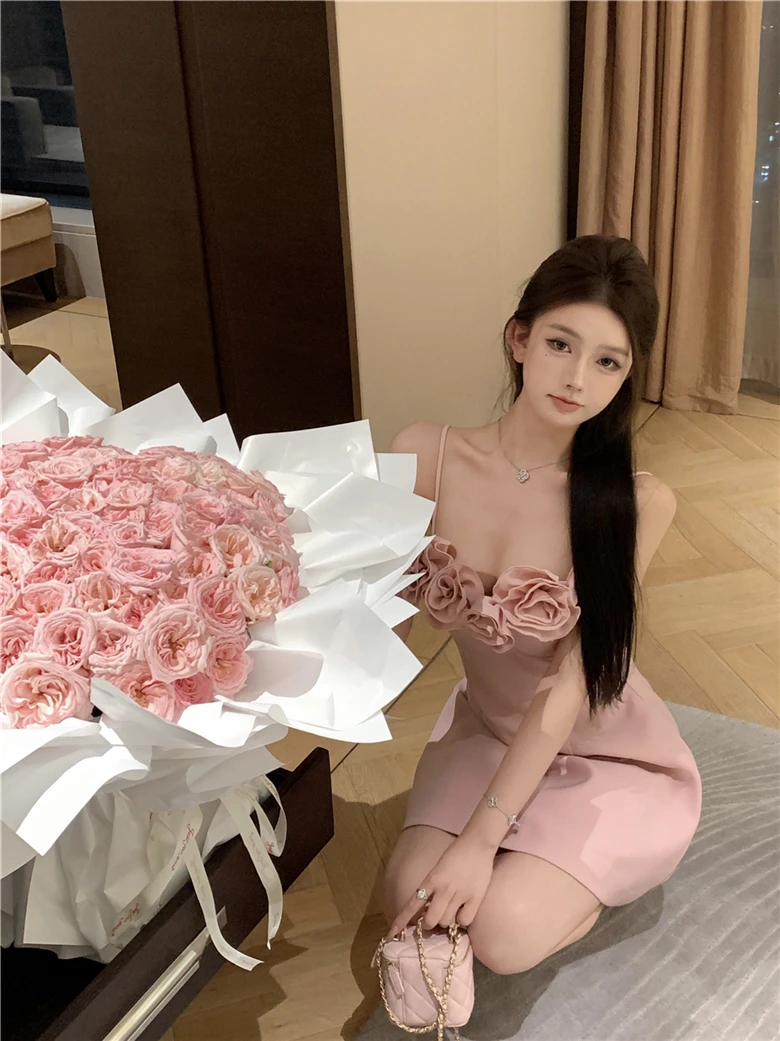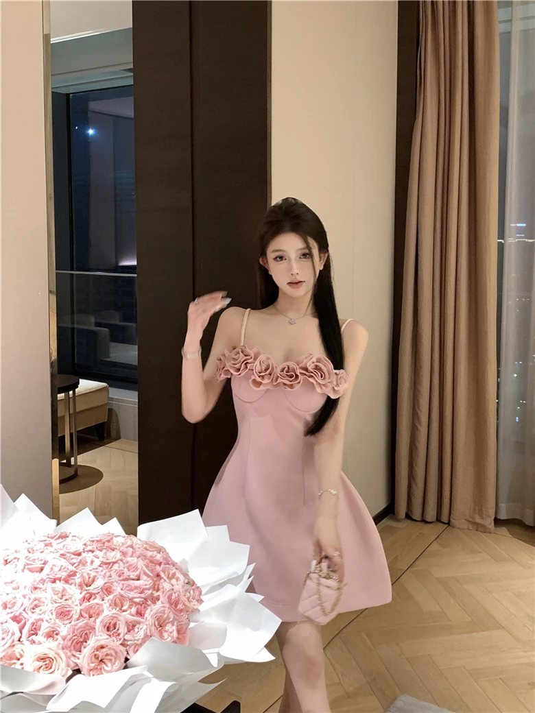 LBSFY -Summer Pink Princess French Elegant 3D Flower Mini Dress Women Spaghetti Straps Festival Ball Gown Evening Dresses Abend Kleider