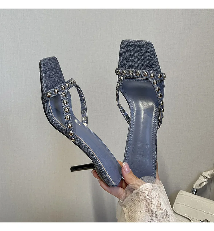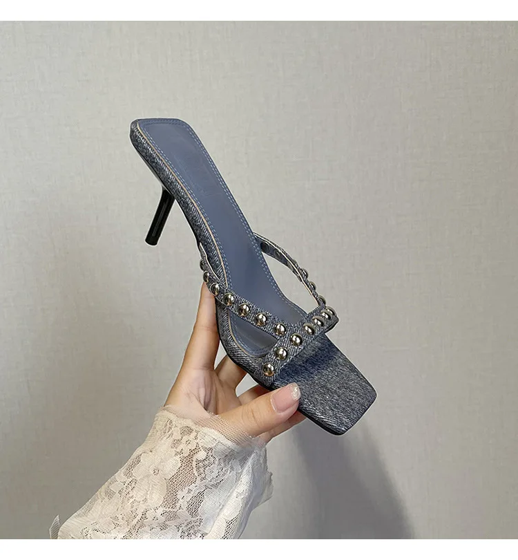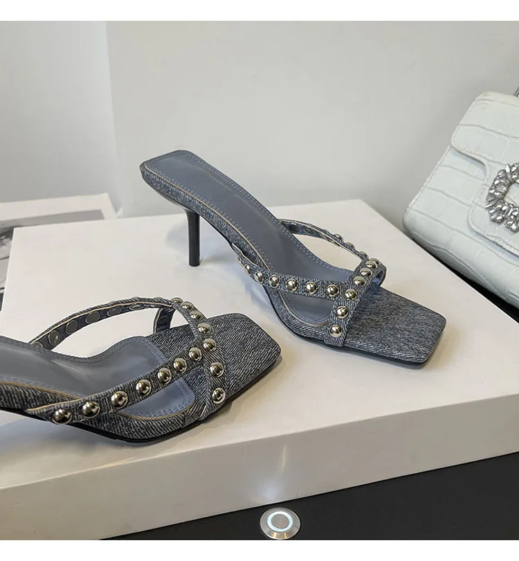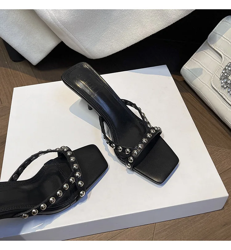 Lbsfy Summer Rivet High Heeled Slippers Women Open Toe Concise Slides Girl Elegant Dress Shoes Leisure Beach Sandals Women Shoes