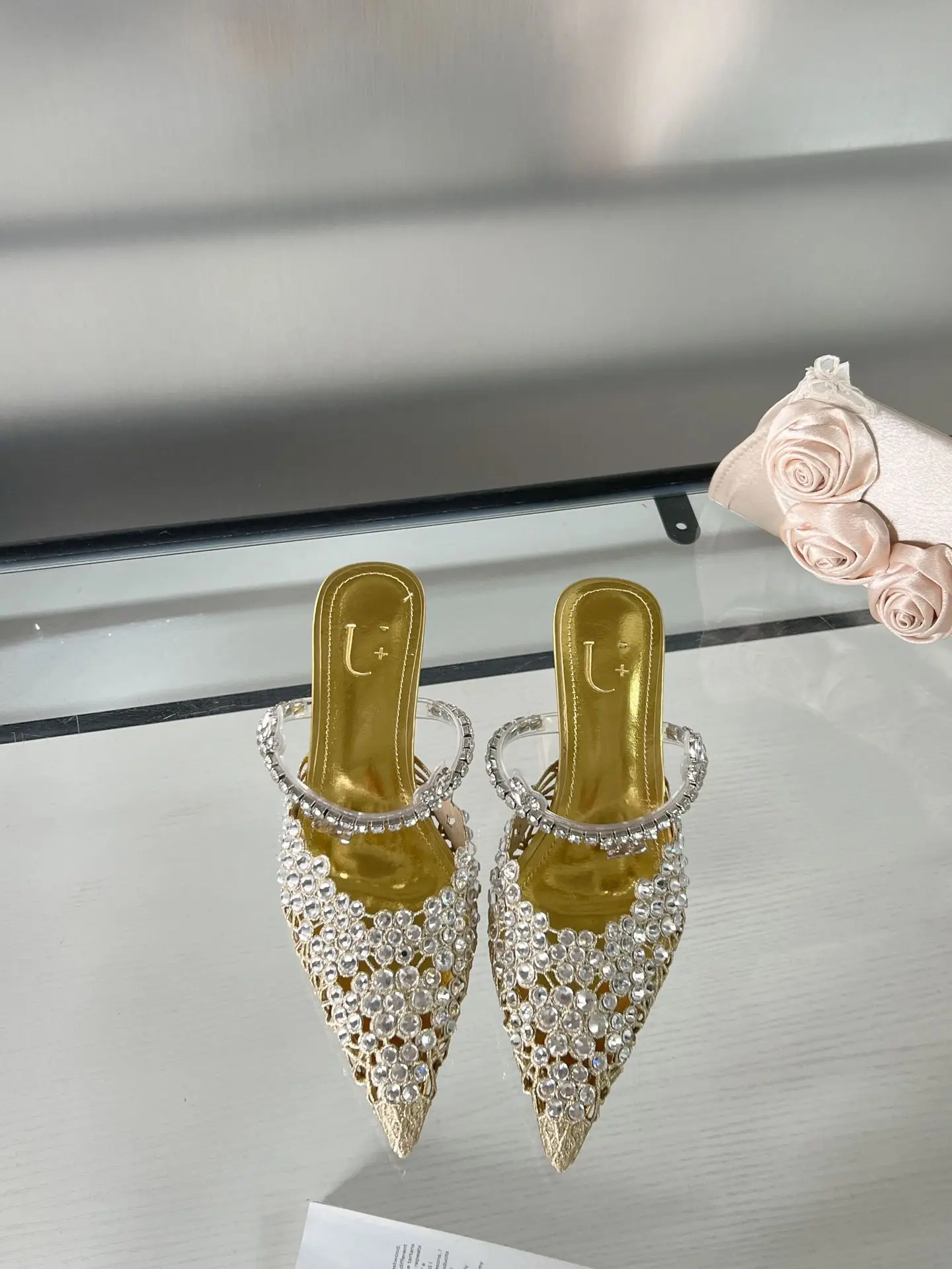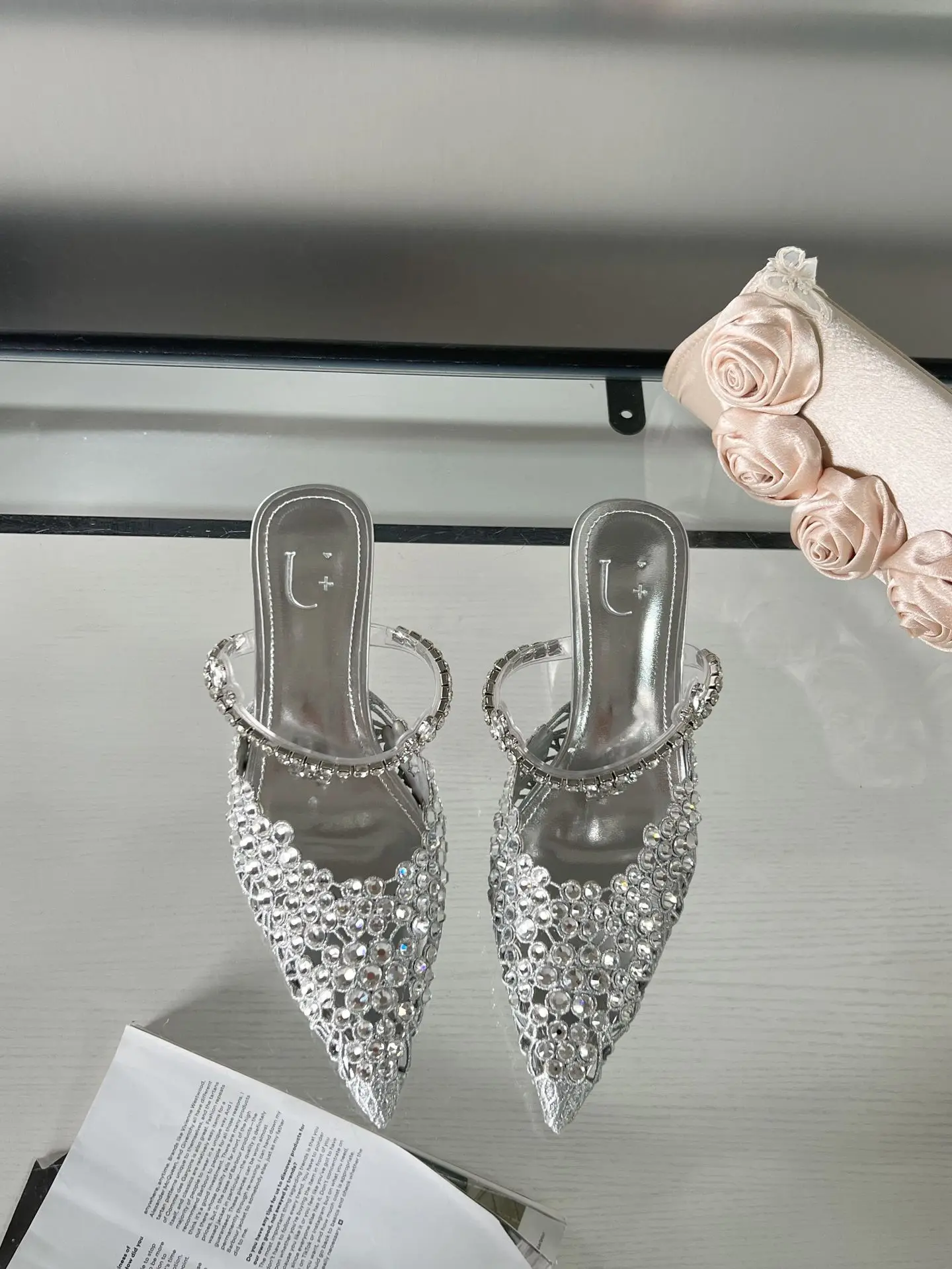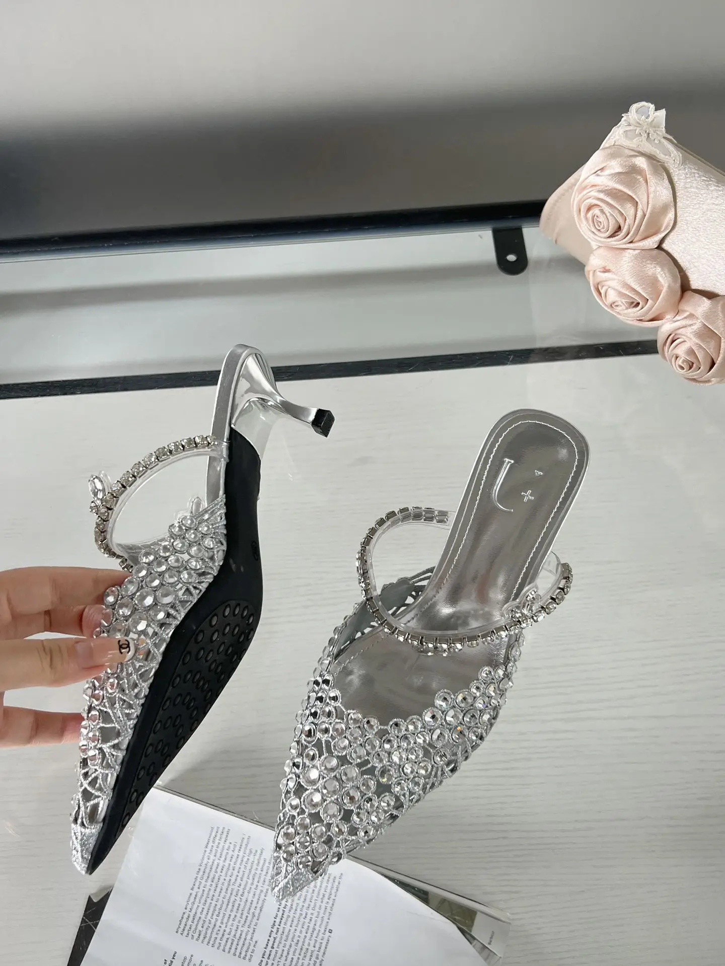 LBSFY - Summer Water Droplet Diamond Pointed Thin Heel Slippers with Hollowed Out Mesh, Breathable and Elegant High Heels, Half Drag