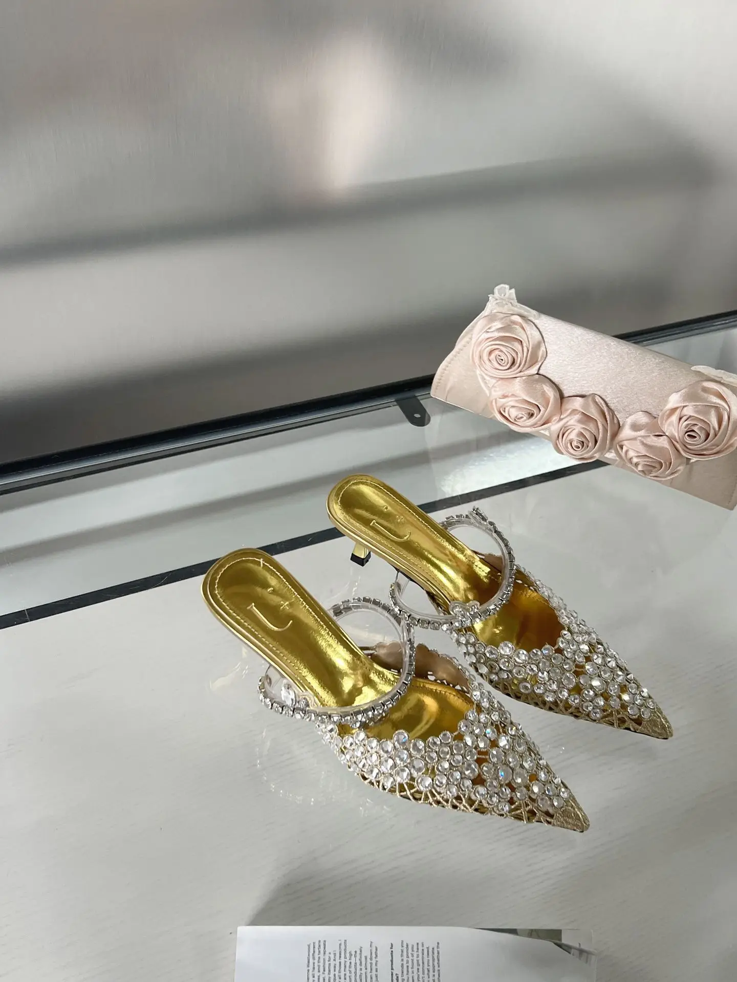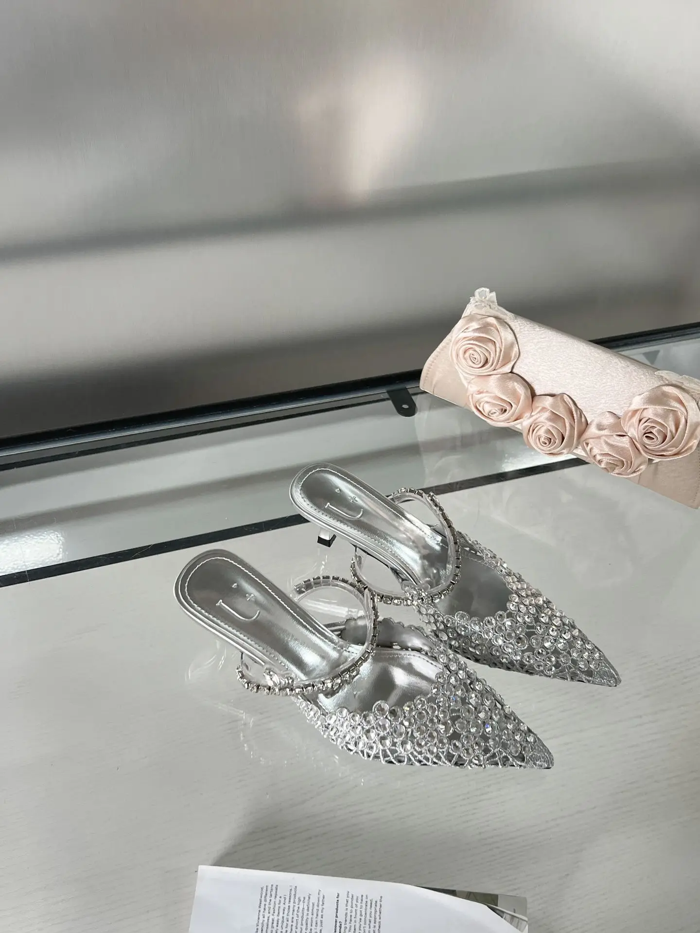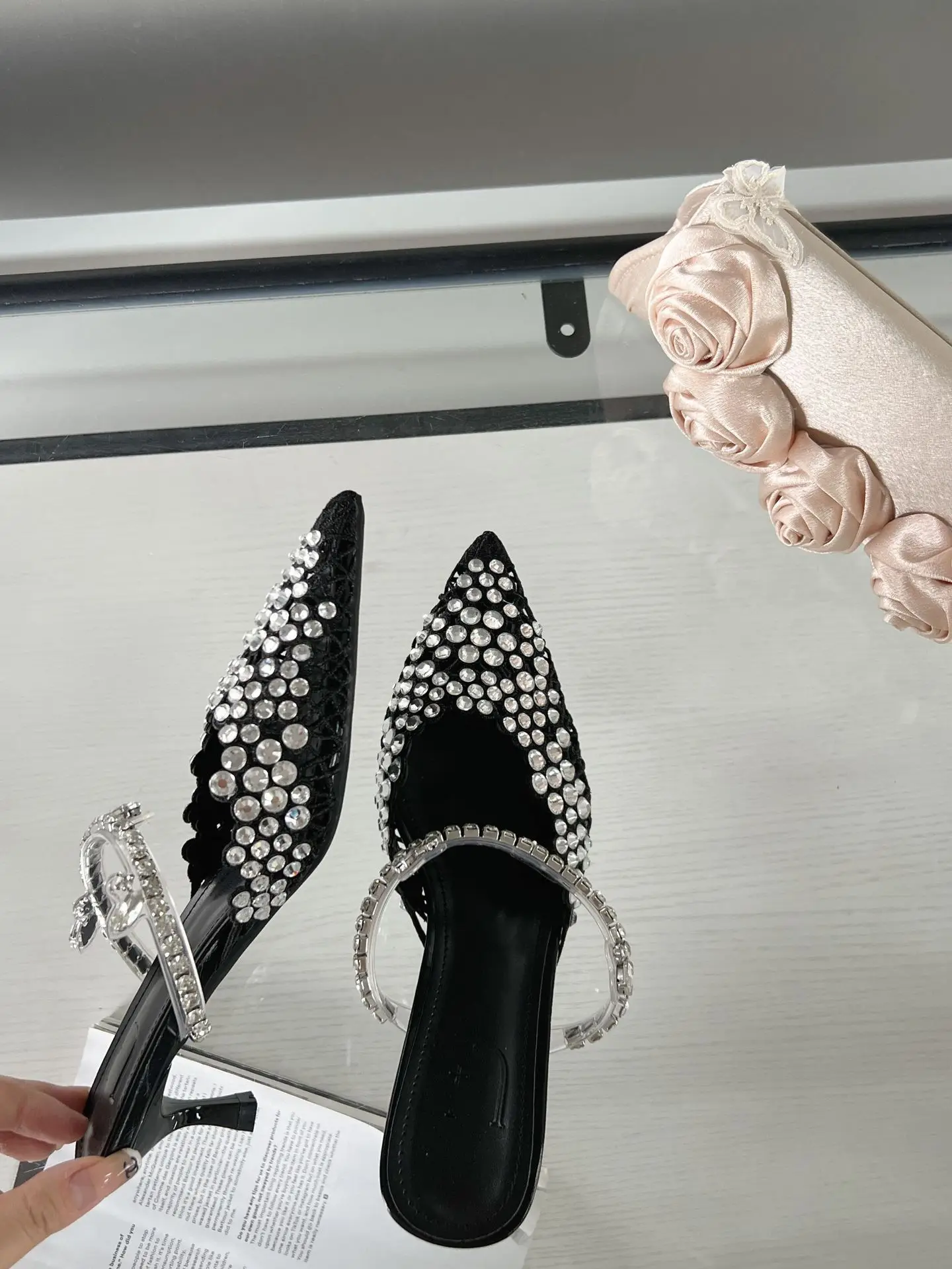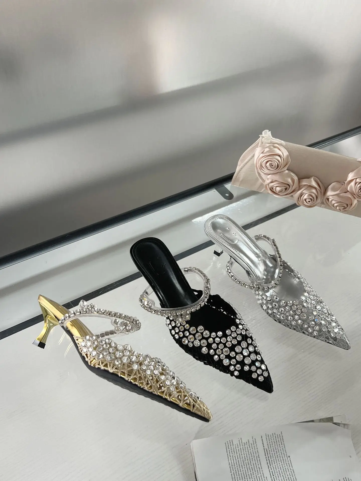 LBSFY - Summer Water Droplet Diamond Pointed Thin Heel Slippers with Hollowed Out Mesh, Breathable and Elegant High Heels, Half Drag