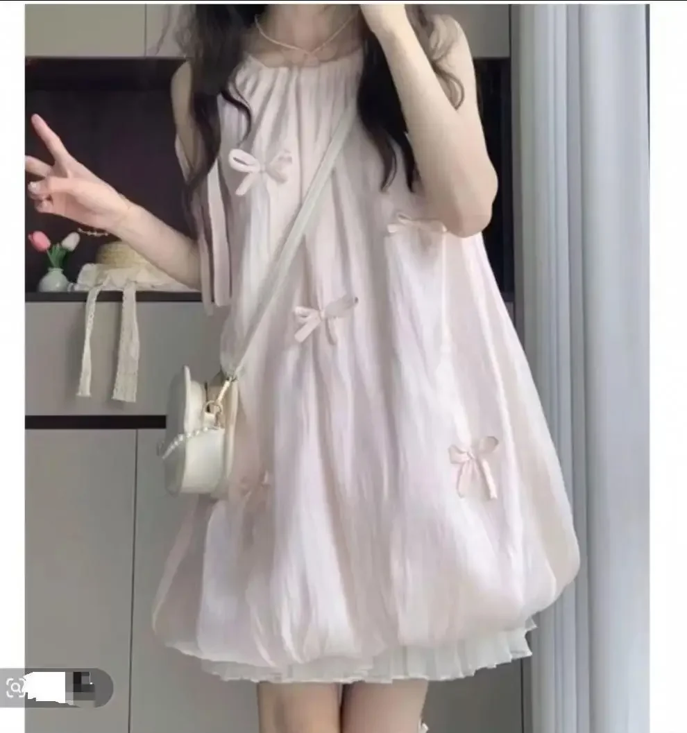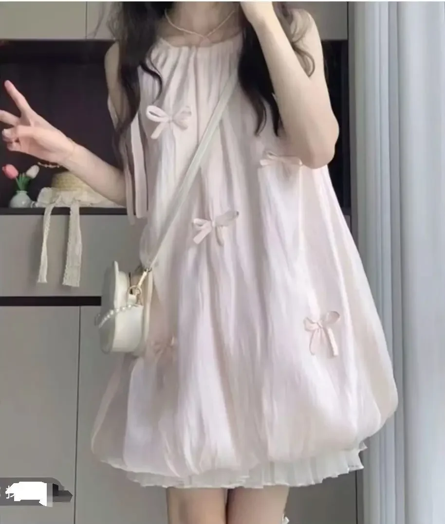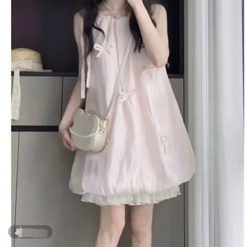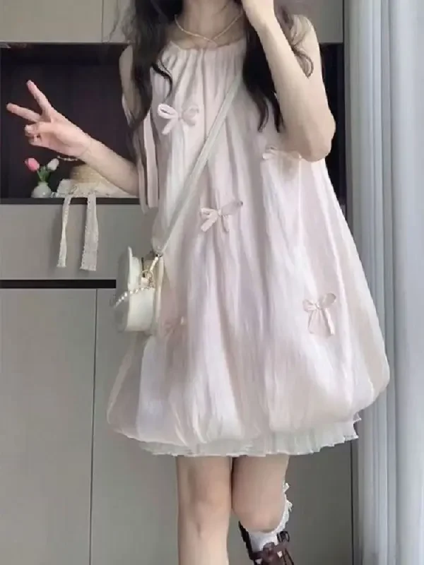 LBSFY -Sweet Pink Butterfly Knot Flower Bud Dress Women's Loose Slimming Short Skirt Summer New Style Student Mini Dress Casual Chic