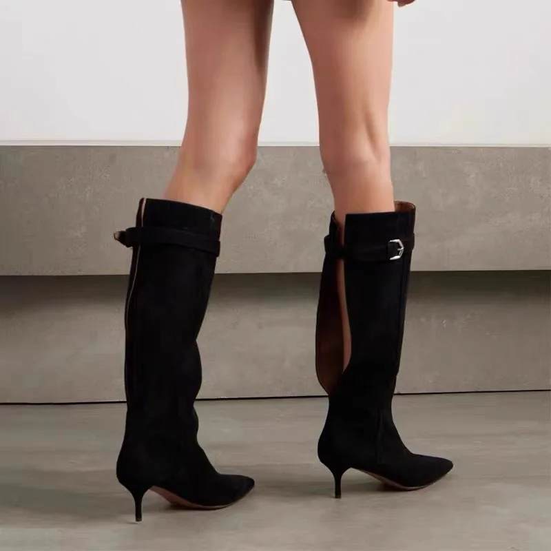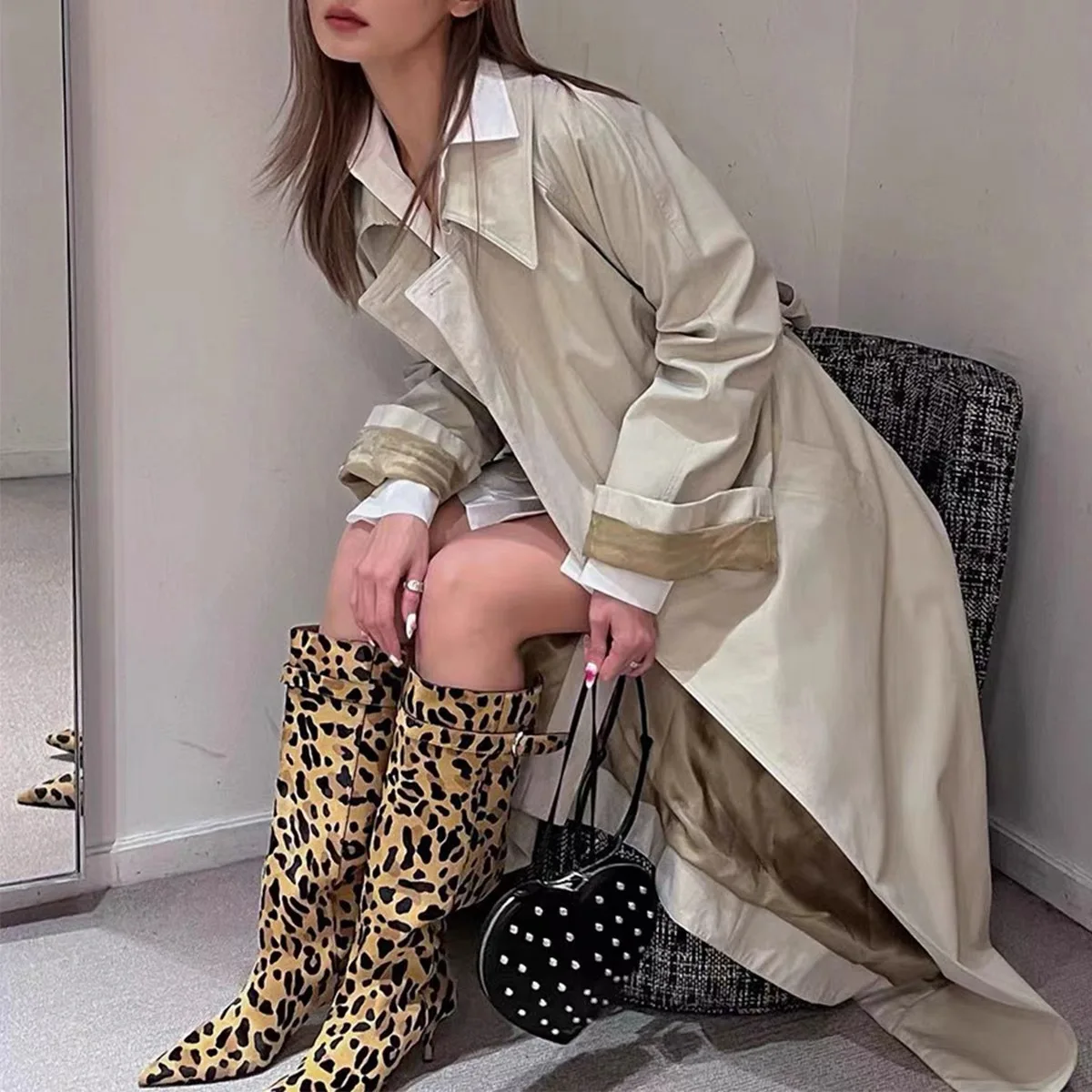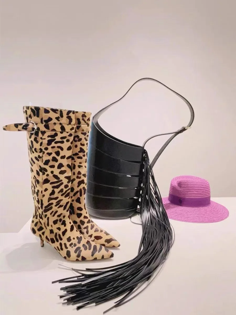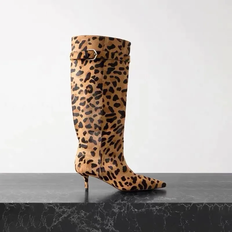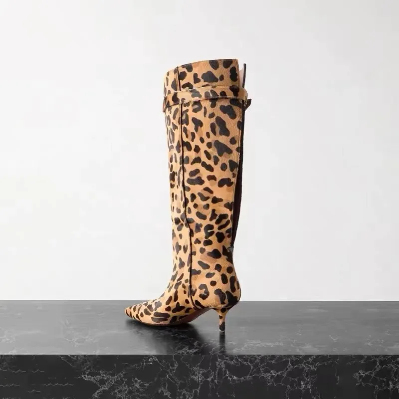 LBSFY - Thin Heel Soft Fur Leopard Print Long Boots, Knight Boots, Women's Autumn and Winter Retro Knee High Boots, Women's High Boots