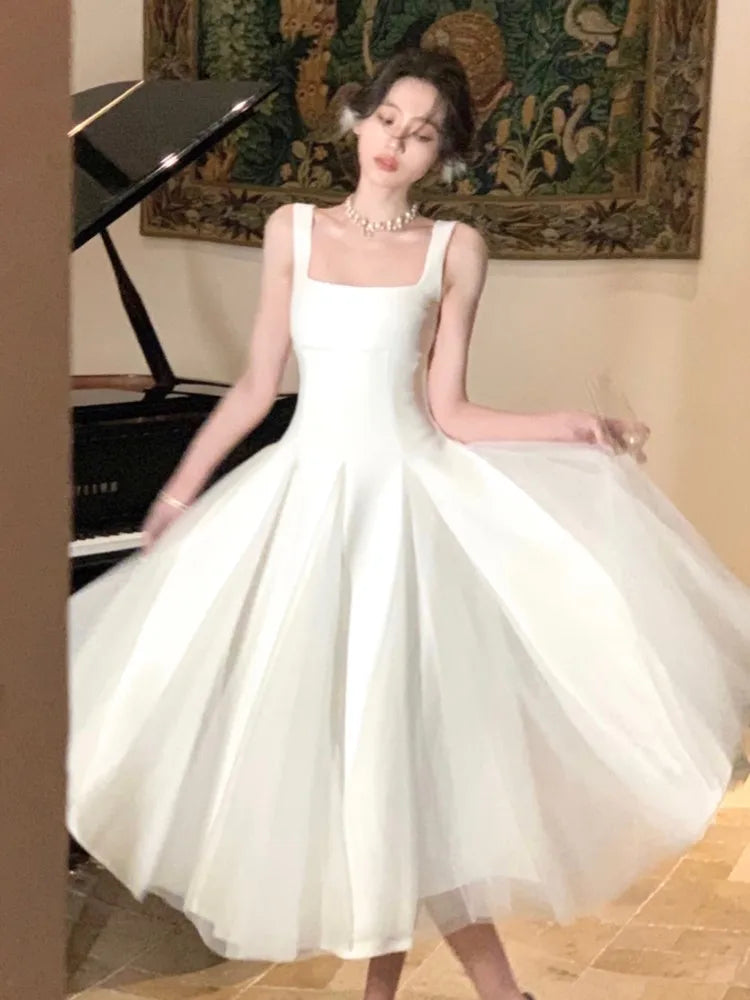 LBSFY -White Elegant Fairy French Sling Dress For Woman Summer Mesh Ball Gown Square-Collar Slim Fit Skirt Party Evening Dress 2025