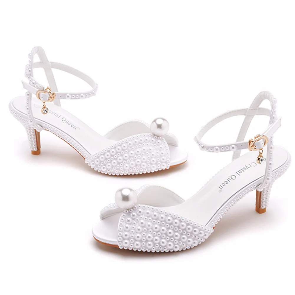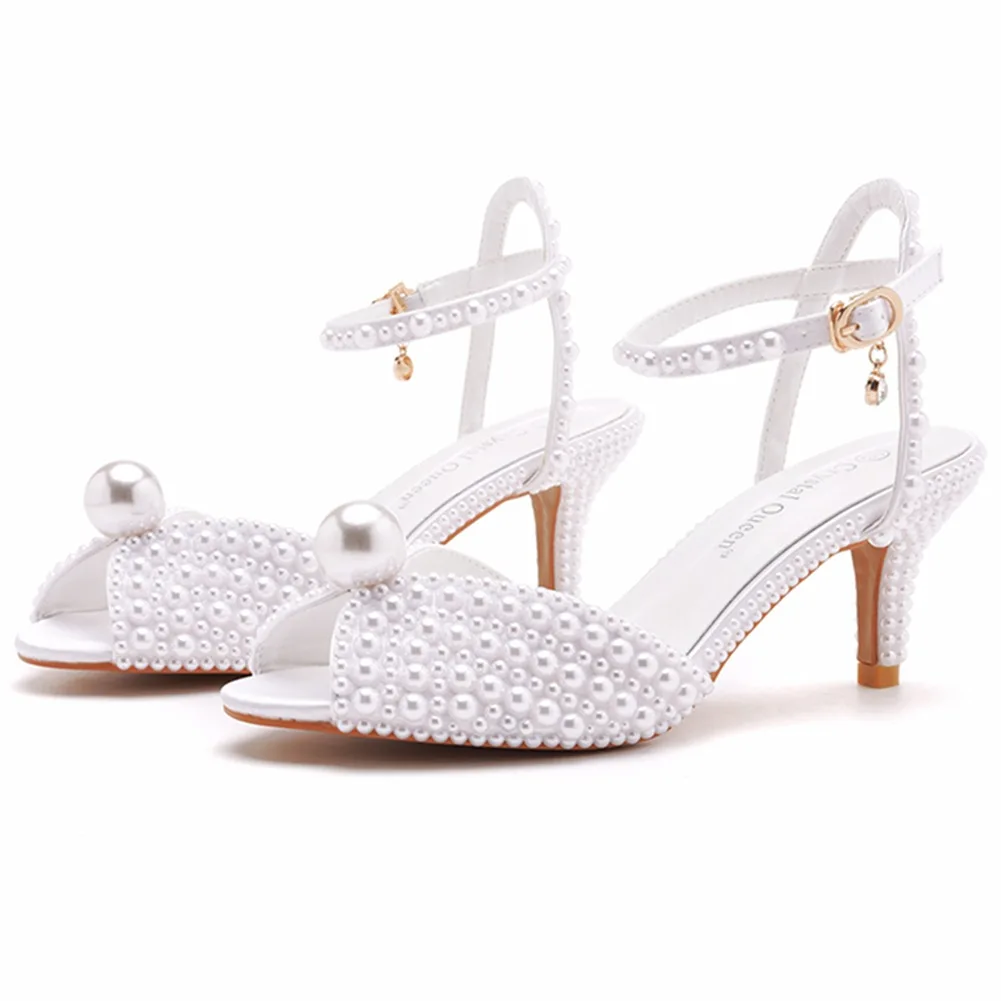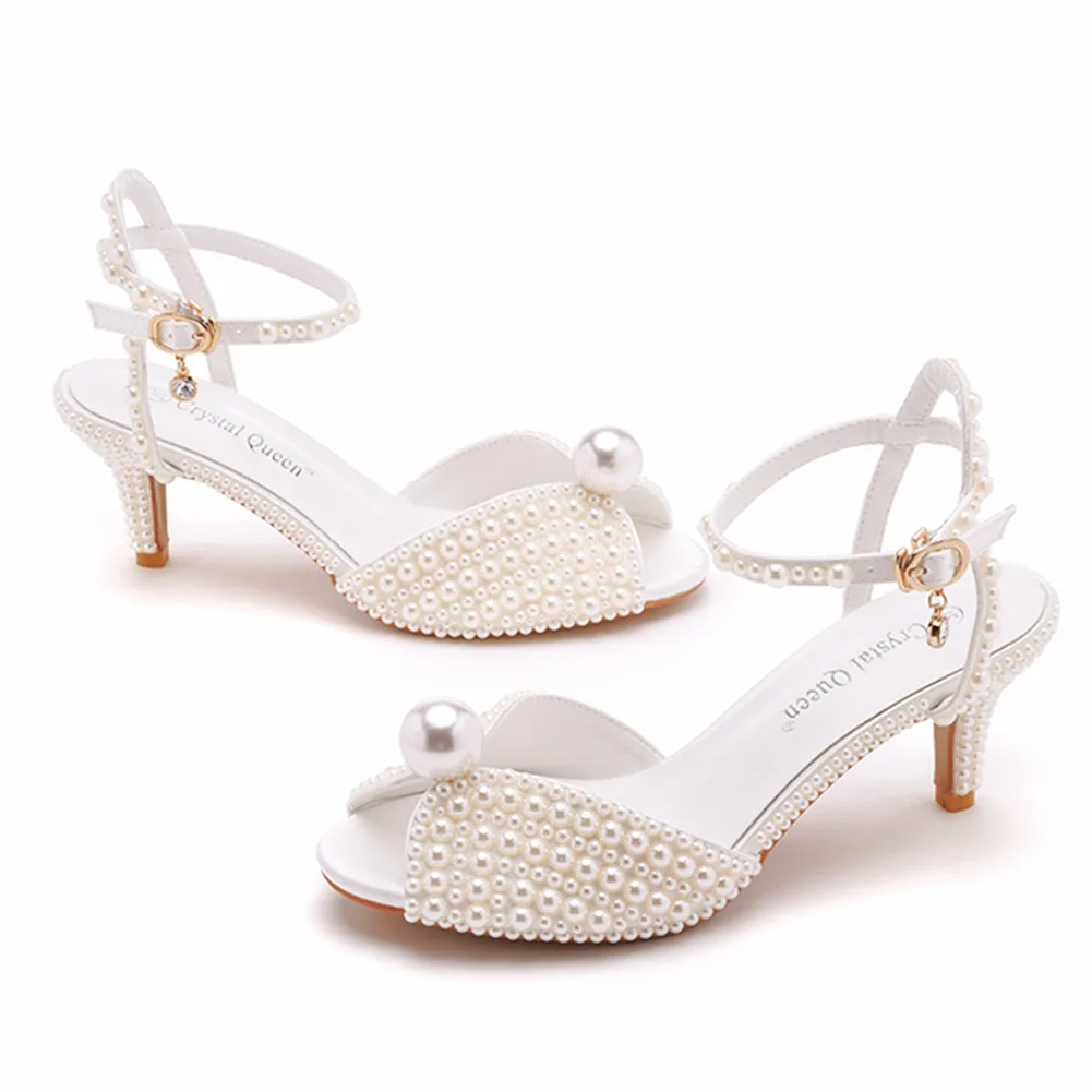 LBSFY - White Pearl Heels Sandals Shoes for Women Wedding Party 6cm Ankle Strap 2024