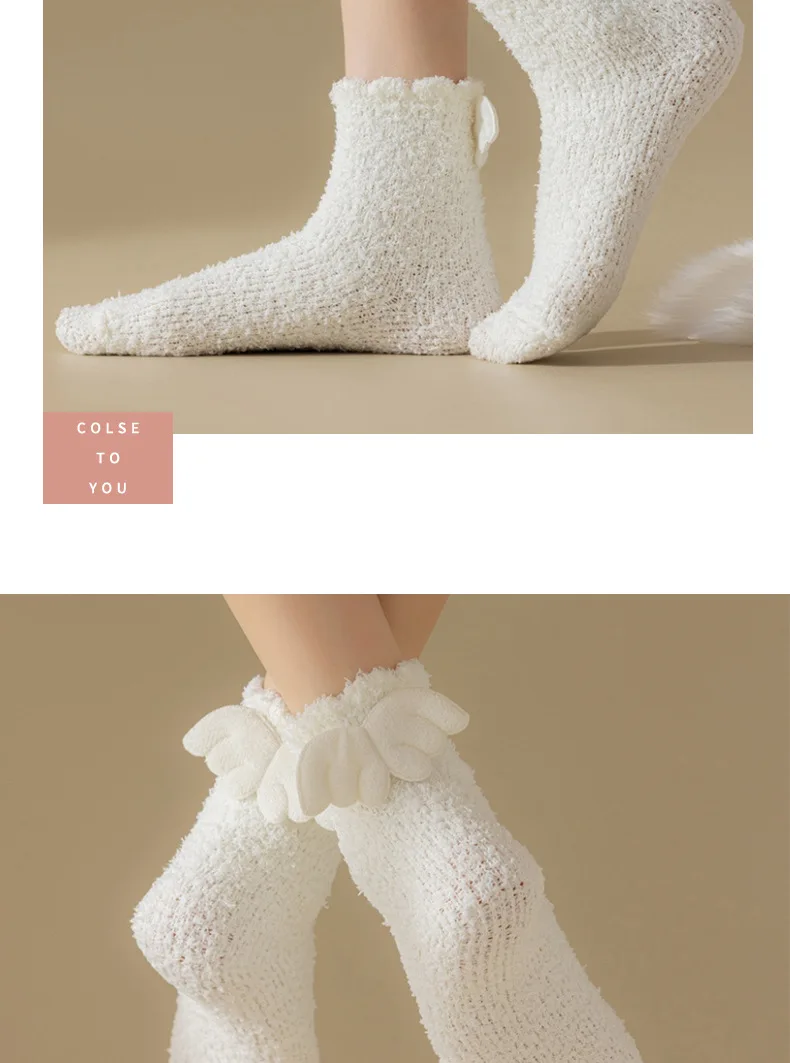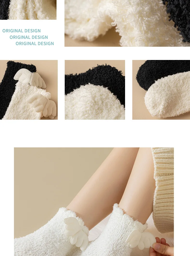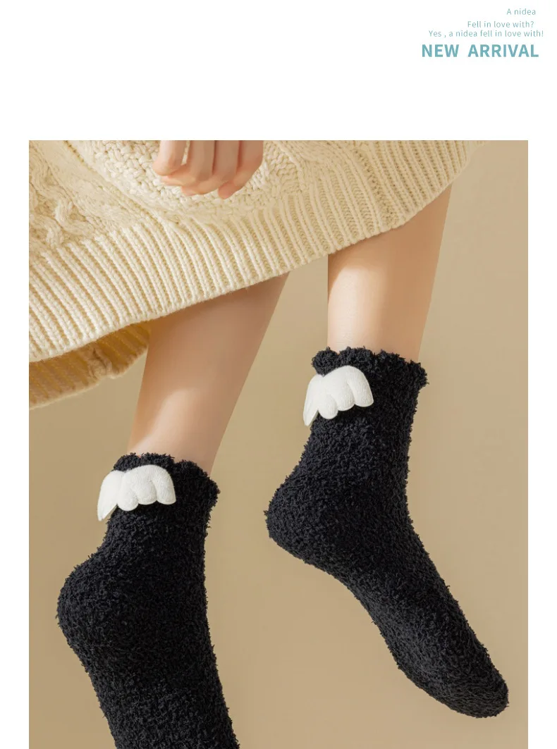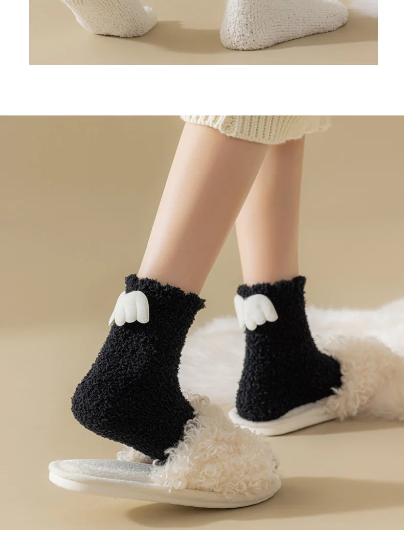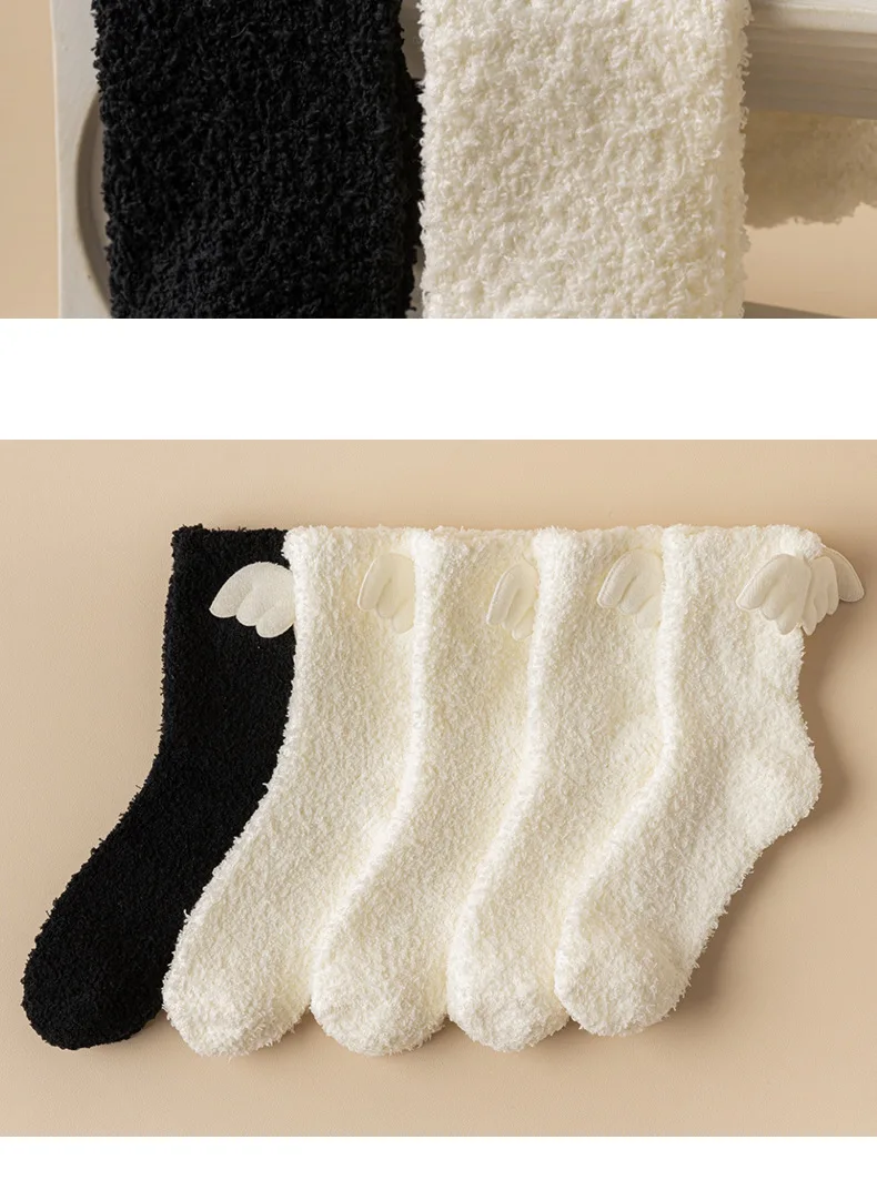 Lbsfy Wing Woman Sock Thicken Crew White Black Cotton Soft Coral Fleece Kawaii Cute Hosiery Autumn Winter Warm Casual Ladies Stockings