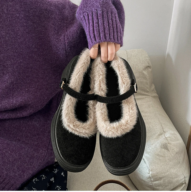 LBSFY - Winter Fur Women Mary Jane Shoes Fashion Shallow Buckle Casual Outdoor Platform Thick Heels Warm Shoes