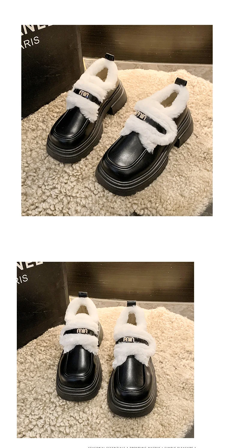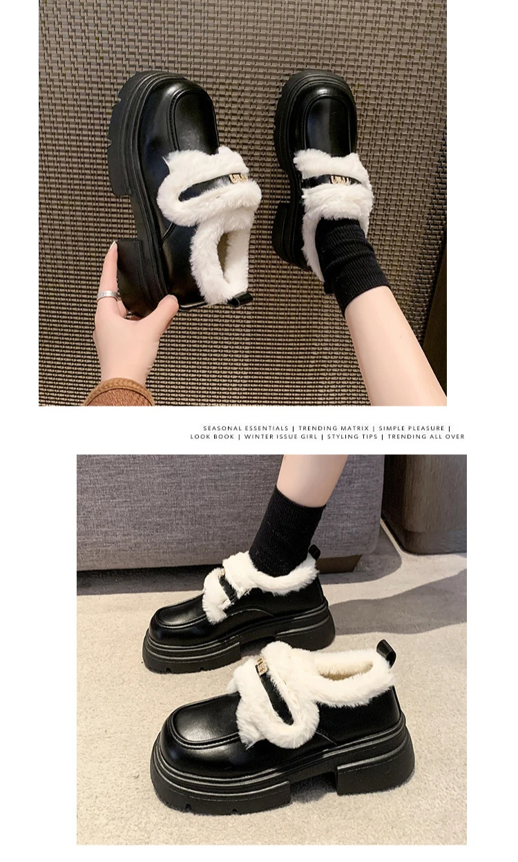 LBSFY - Winter Warm PU Leather Platform Shoes for Women Fashion Casual New Designer Loafers Ladies Black White British Pump Shoes Woman
