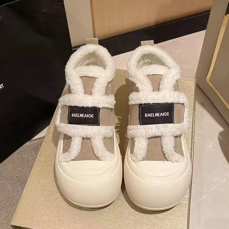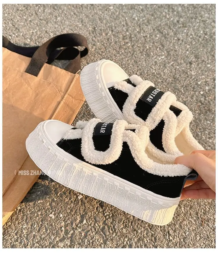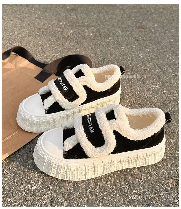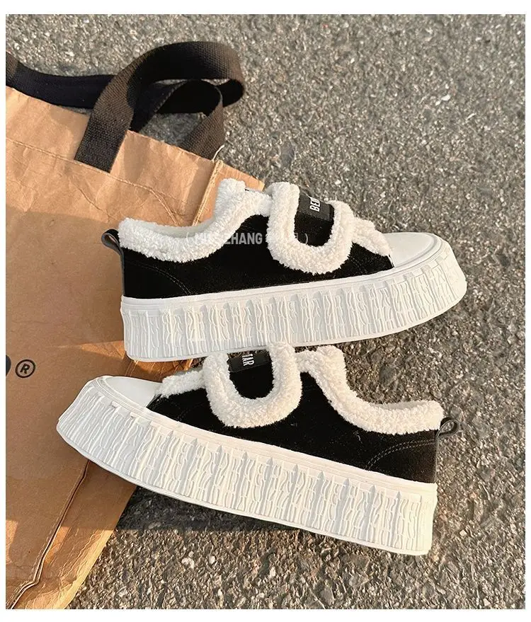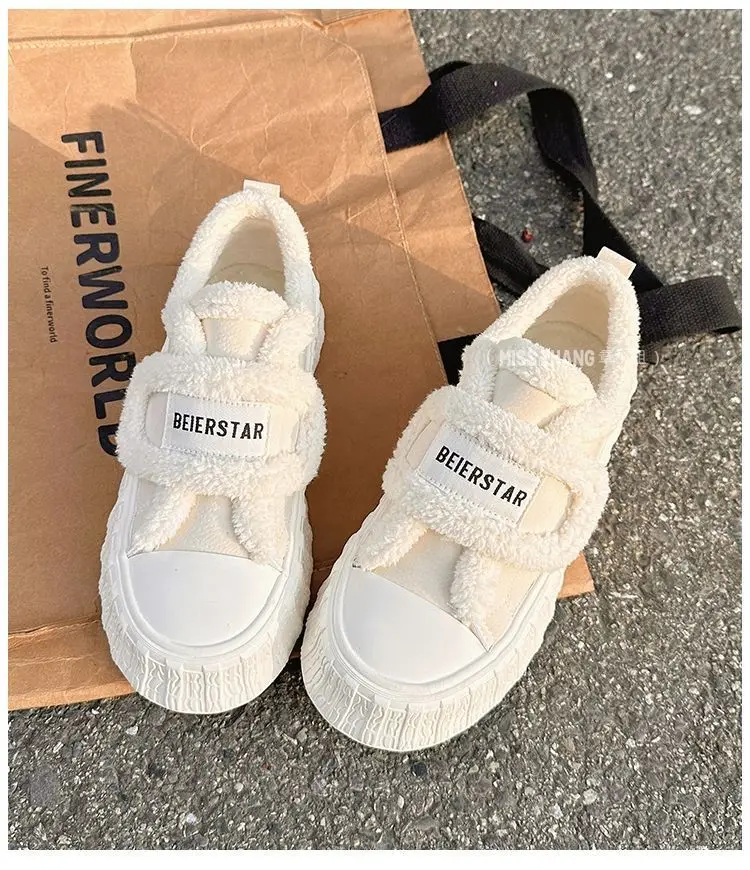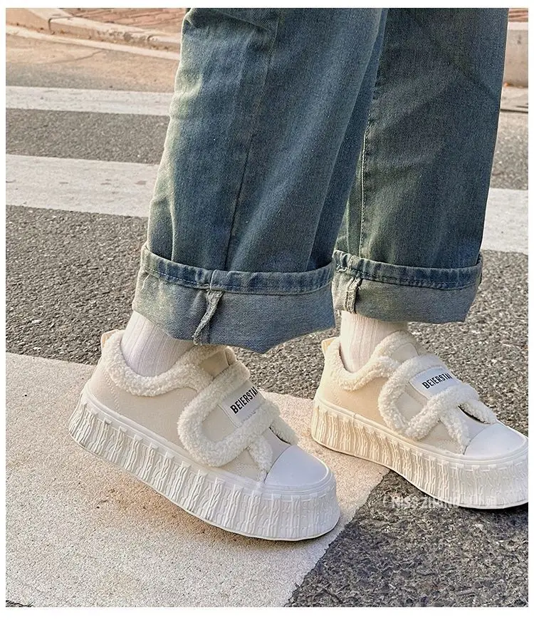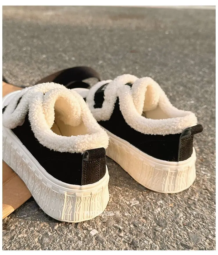 LBSFY - Winter Women Breathable Warm Sneakers White Wool Shoes Thick Heel Plaid Sneakers Casual Running Platform Y2K Lolita Shell Shoes